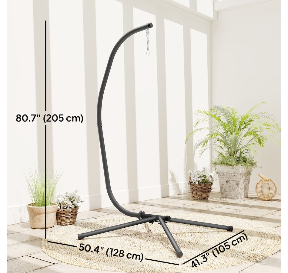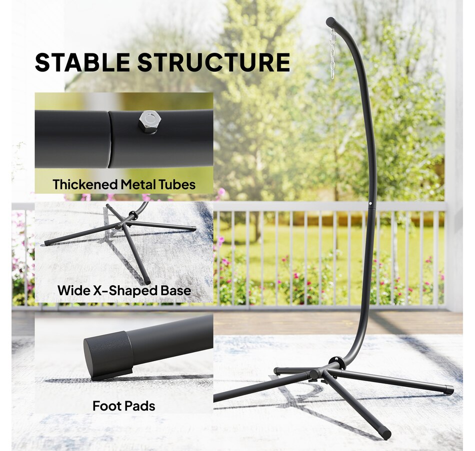 Transform your relaxation game with the Outsunny hammock chair stand! Built with a heavy-duty steel frame and black sand-textured coating, it supports up to 330 lbs for stable, wobble-free lounging. Adjust the height within 5.1" to customise your comfort, while the sleek C-shaped design and wide X-shaped base keep things balanced. Great for patios, balconies, or indoors—this versatile stand suits egg chairs, swing chairs and more!