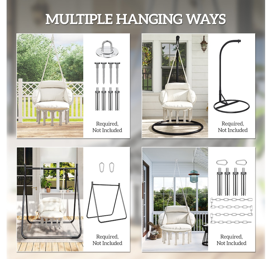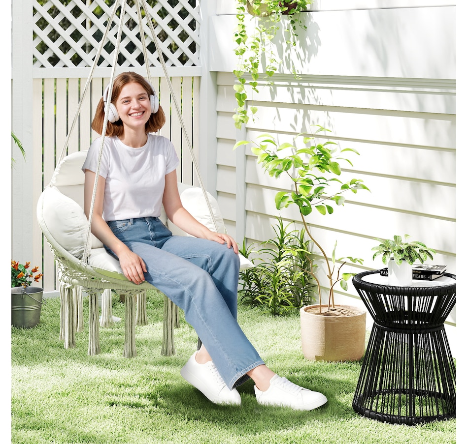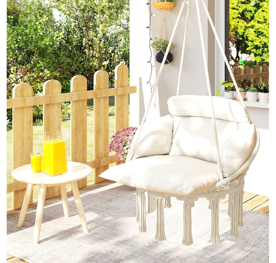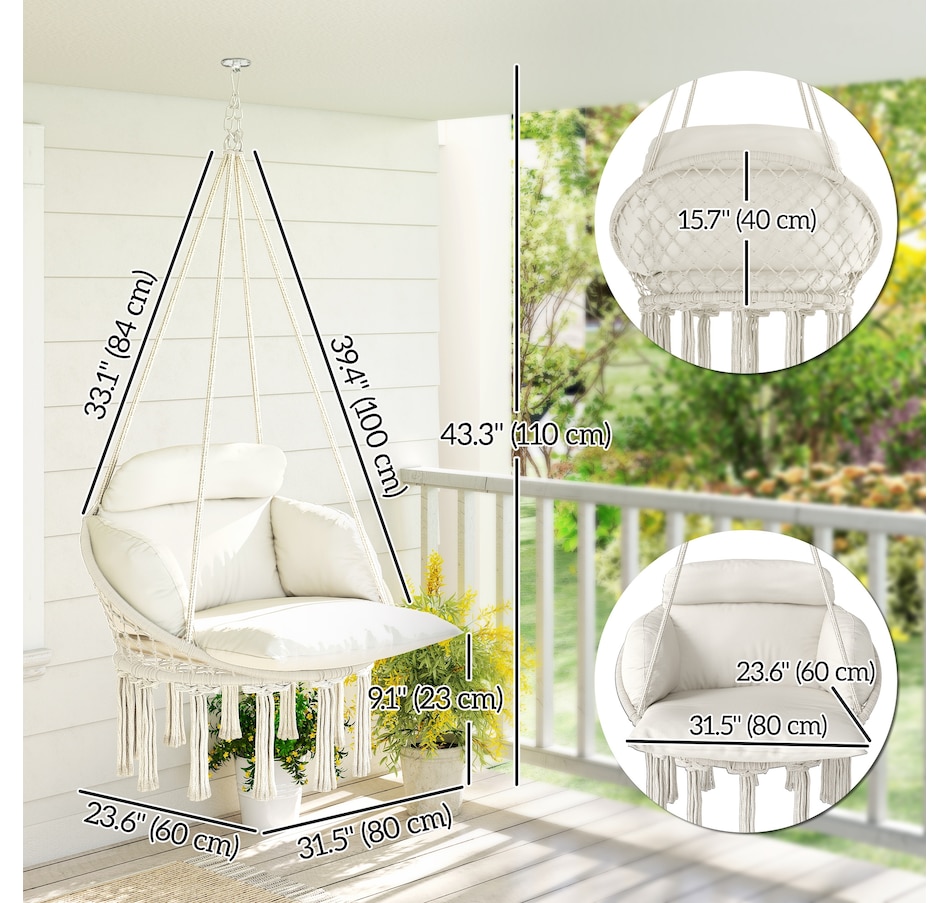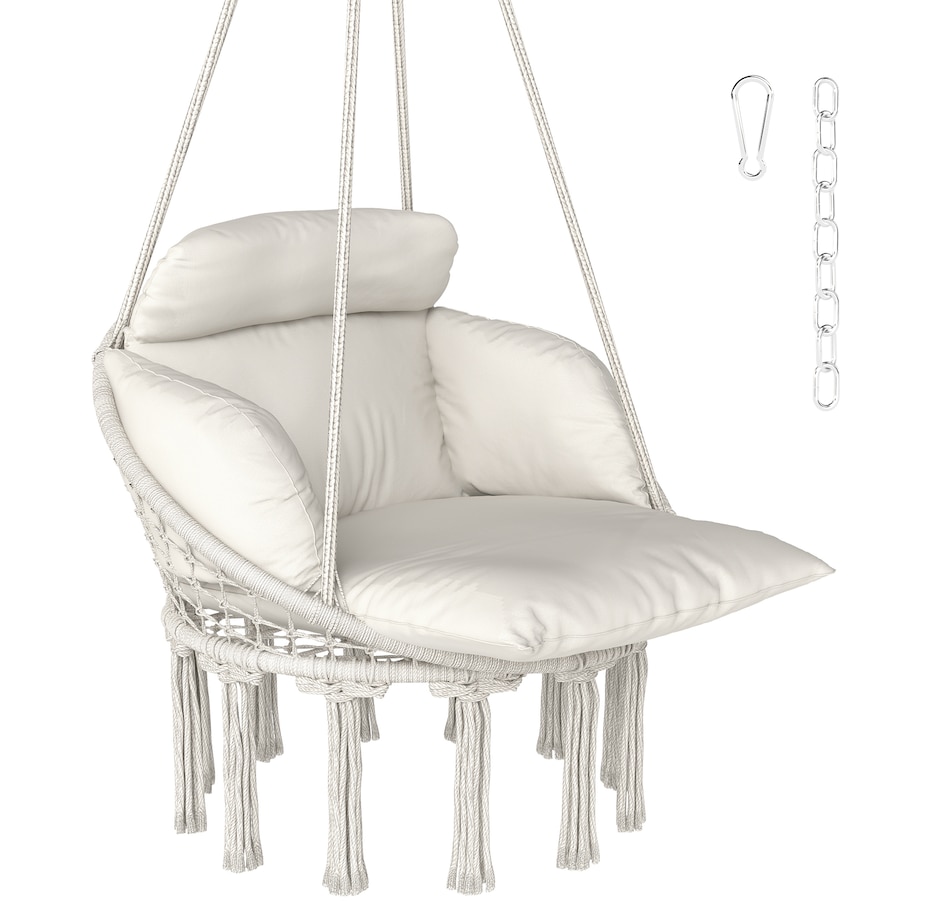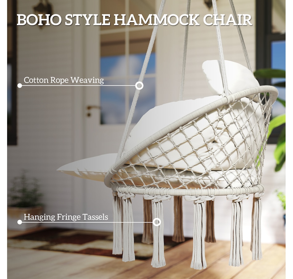 Hanging Hammock Chair, Boho Outdoor Swing Chair w/ Cushion, Cream