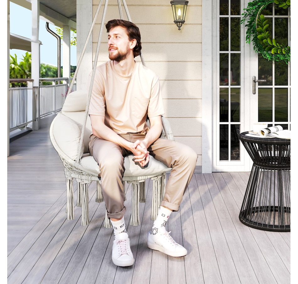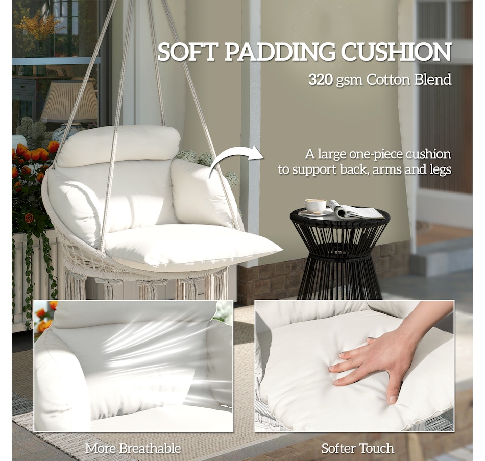 Drift away in the Outsunny outdoor hammock swing chair, a haven of cloud-like comfort with large plush cushion on the outdoor hanging chair. 320 gsm polyester cotton fabric offer a more breathable and softer touch. Crafted with a tough steel frame and exquisite weaving, this swinging hammock chair offers a safe, relaxing escape. Easy to hang with included hardware, the swinging chair is an excellent addition to your indoor or outdoor retreat.