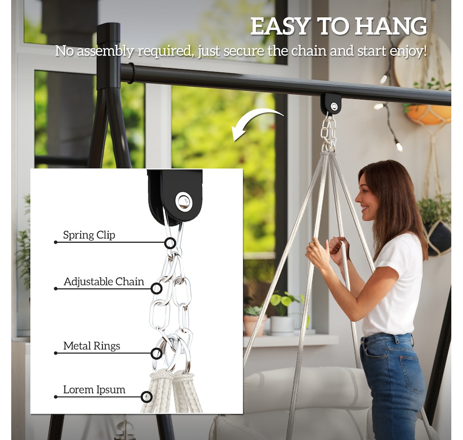 ● Easy-to-hang design with rings, spring clip and adjustable chain;