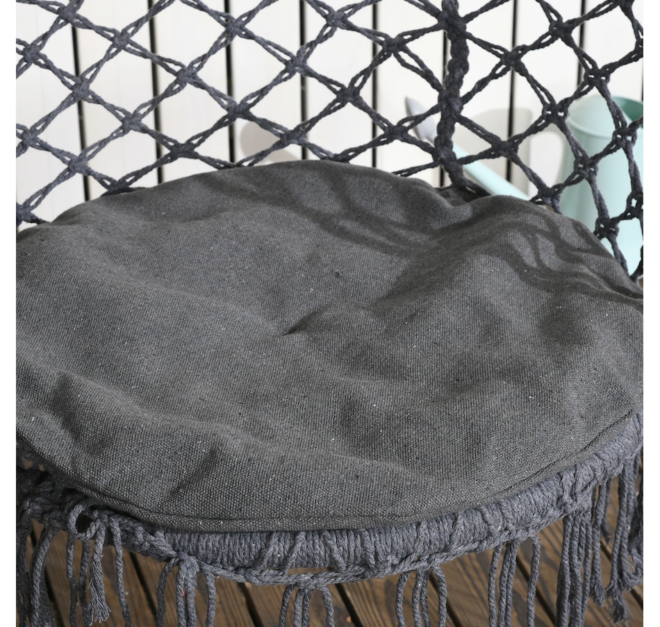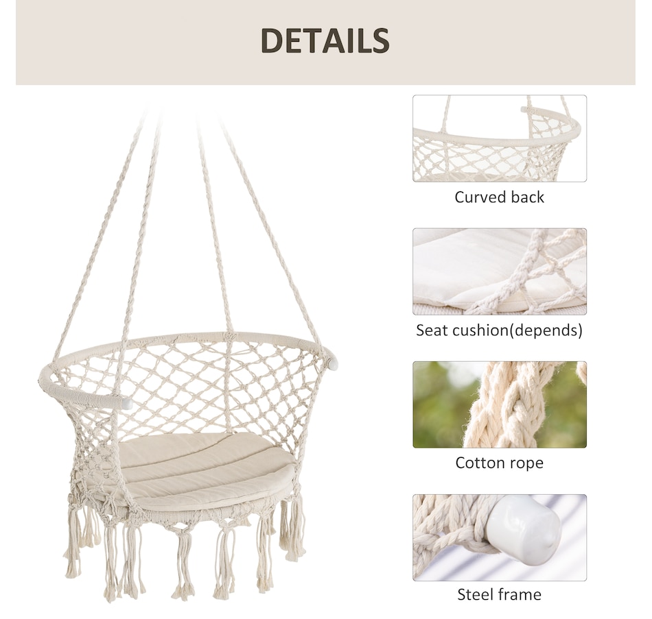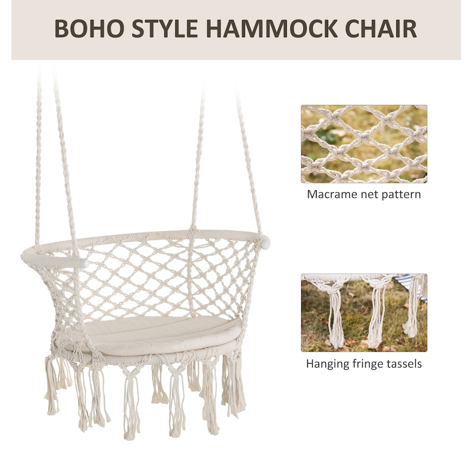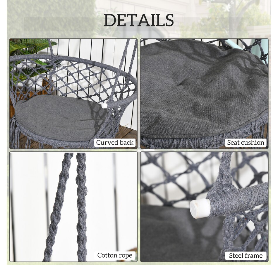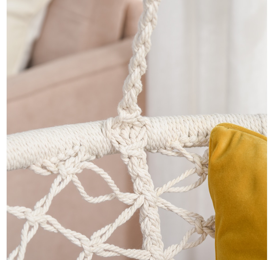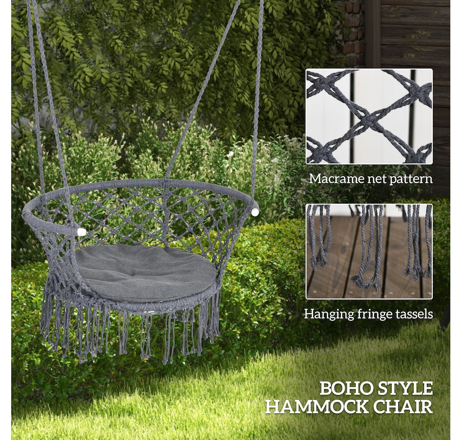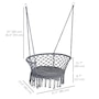 Add some elegance into your indoor or outdoor spaces effortlessly with this hanging rope hammock chair from Outsunny. Boho style chair is crafted into a spacious seat design, where the netting cotton rope forms the seat and the backrest with fringe tassels for an attractive and unique looking. Made from metal for strength and reliability, the front seat is slightly curved for comfortable sit, and with armrest offering support when needed.