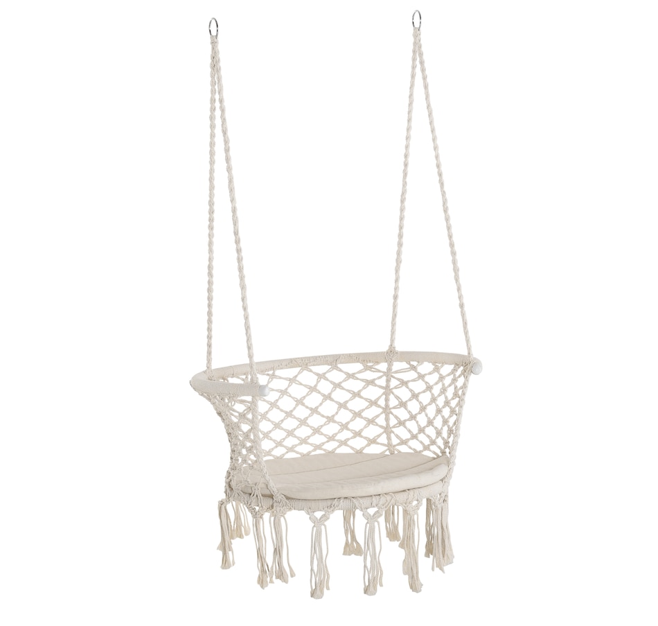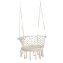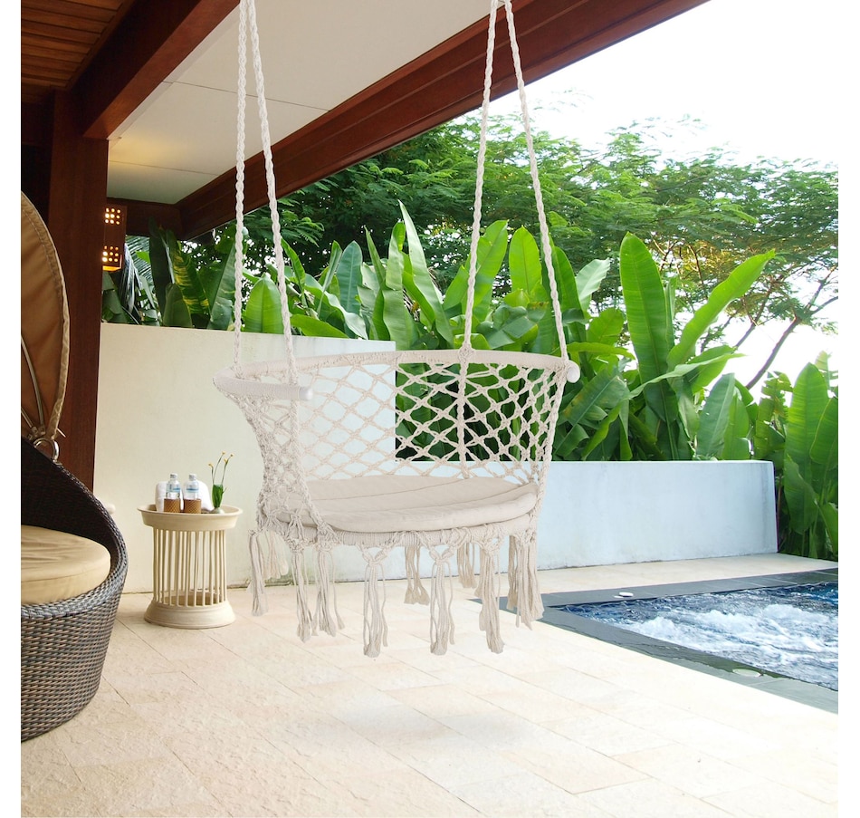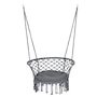 ● Hanging hammock chair features macrame net pattern with fringe tassels