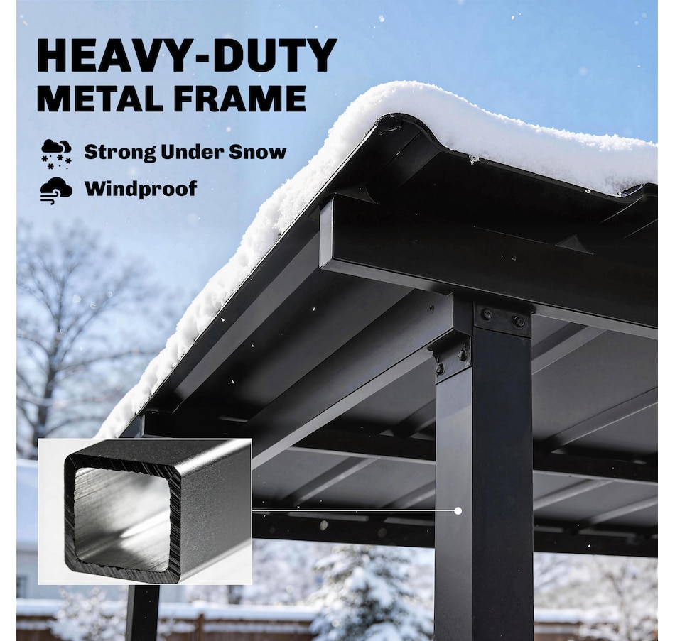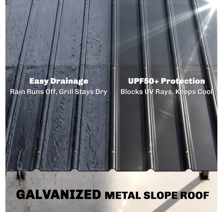 ● Galvanized metal roof supports snow loads, keeping your grill safe in changing weather;