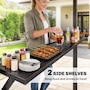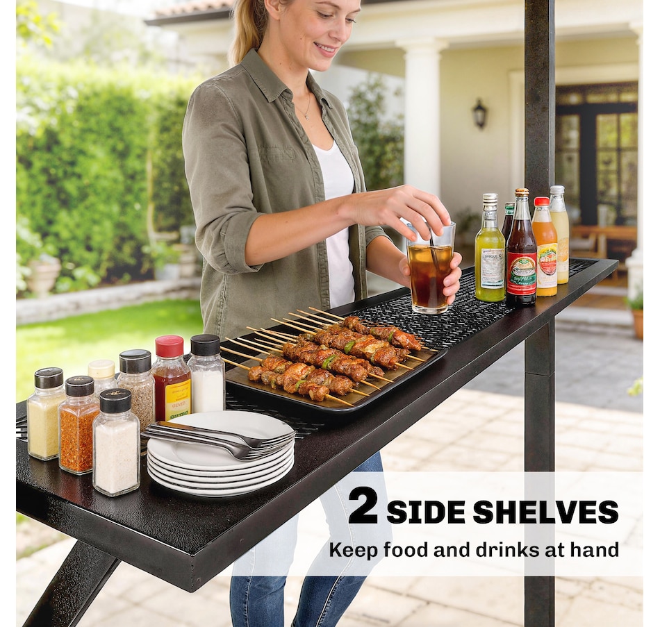 ● Two long side shelves offer plenty of space for food prep, condiments, and drinks;
