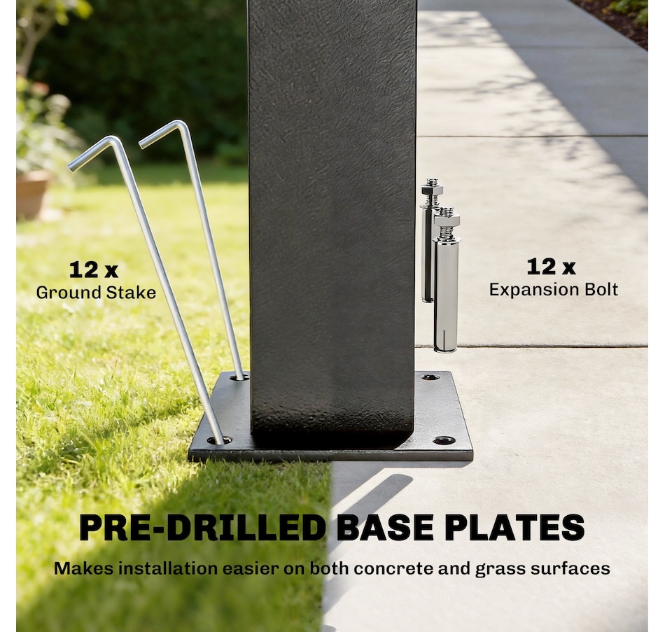 ● Ground stakes and expansion bolts included for secure anchoring on grass or hard surfaces;