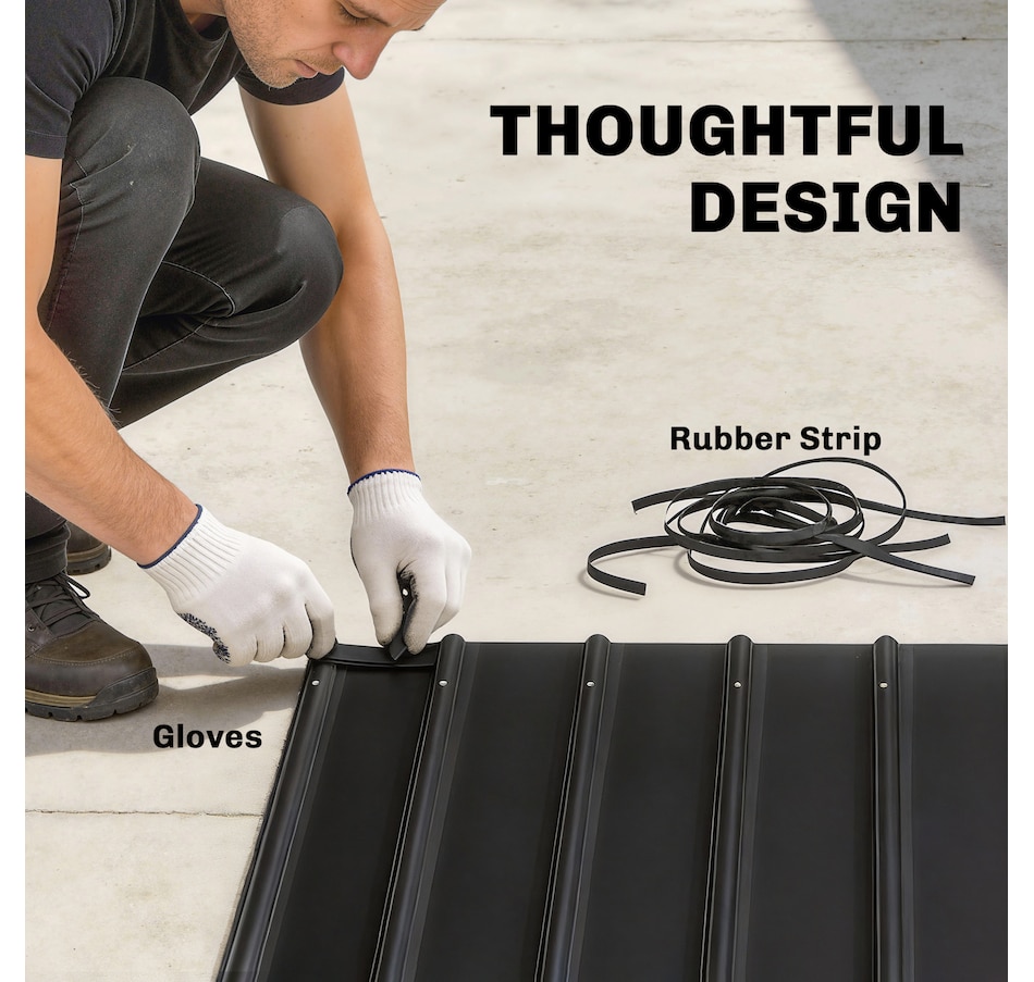 ● Rubber edge trim and included gloves help make assembly safe and easy;