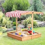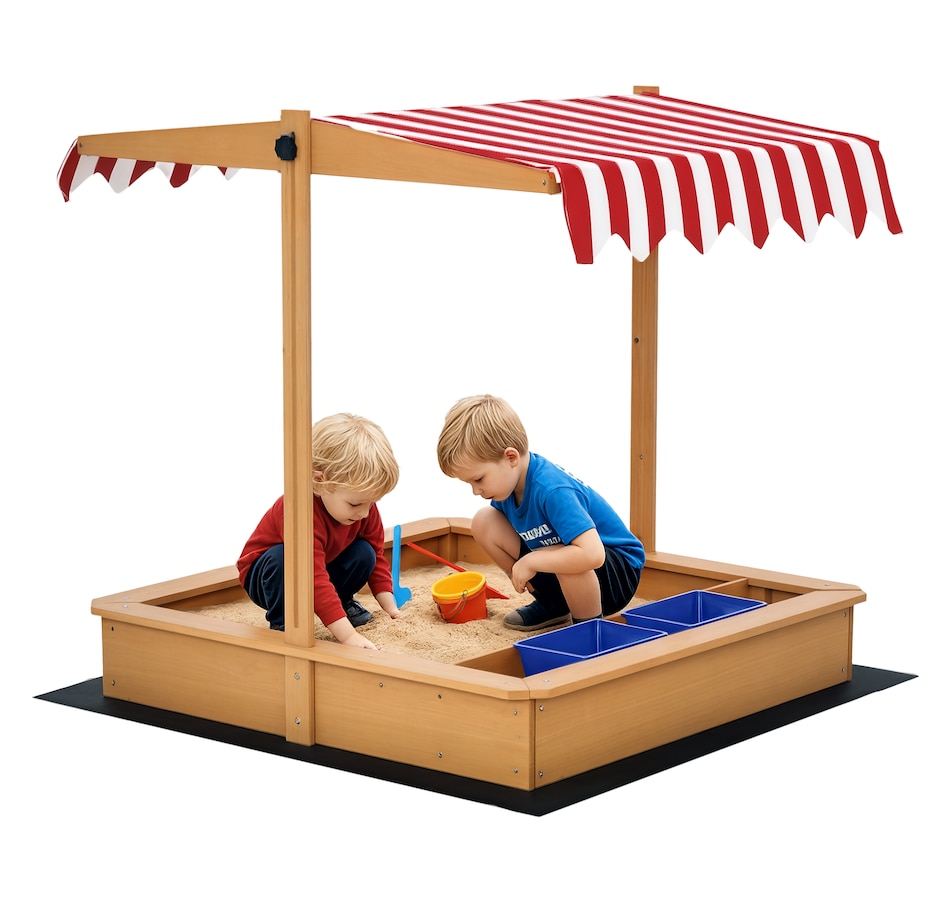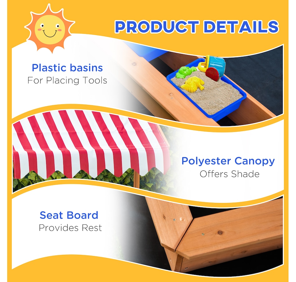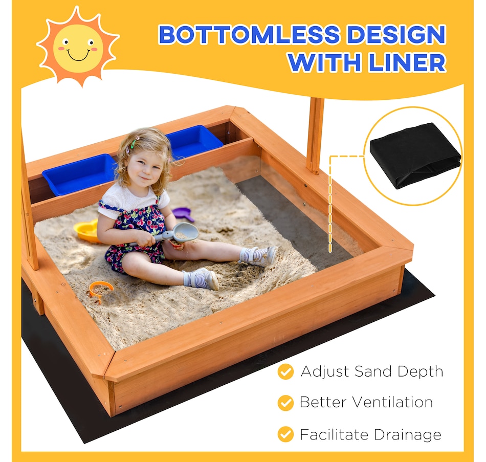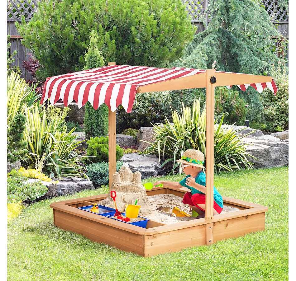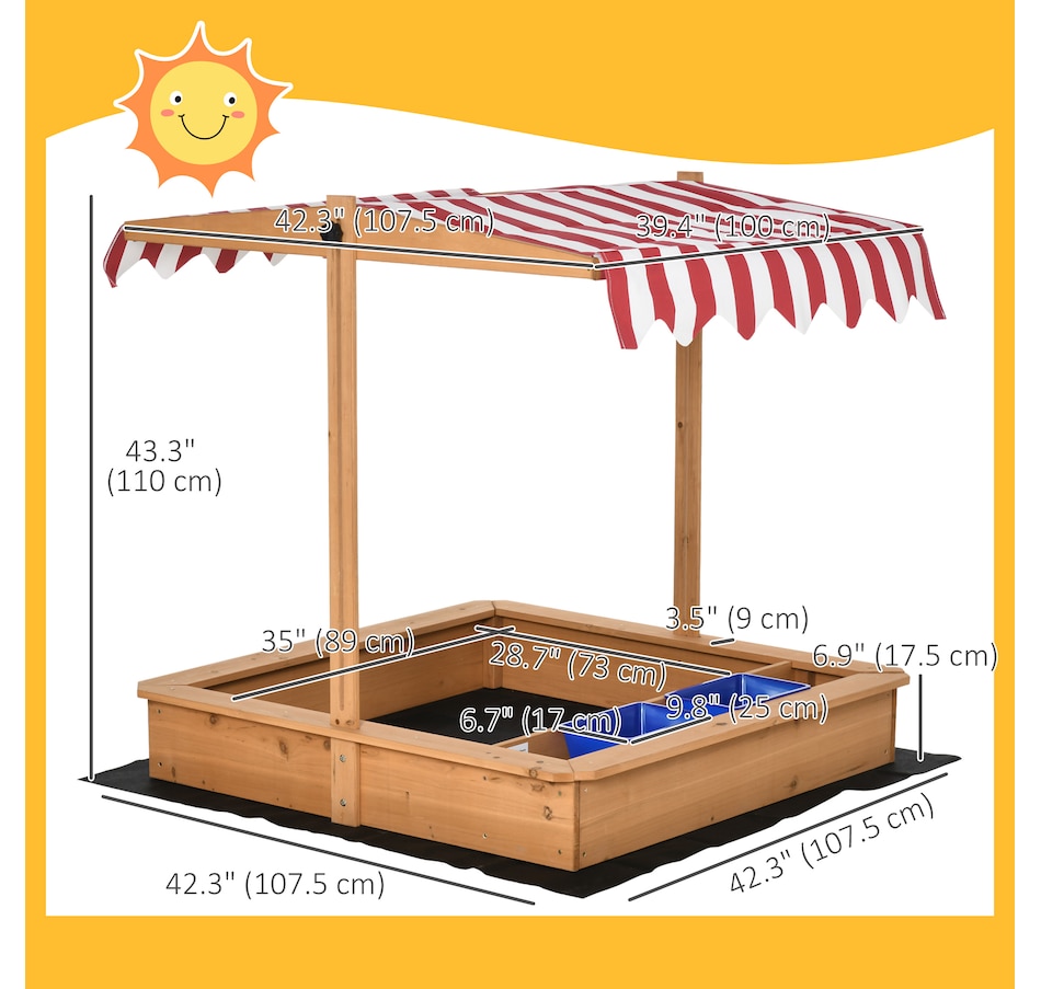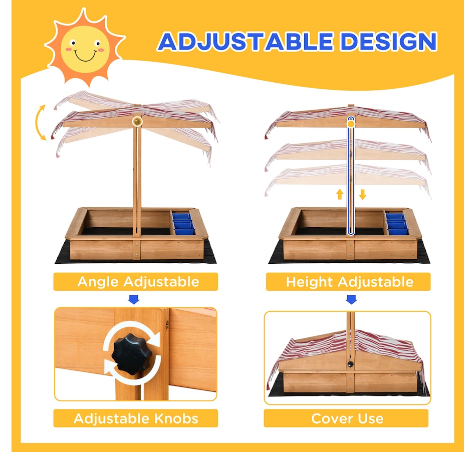 Is your child addicted to playing with sand? Our innovative designed sandbox with canopy will surely become the favorite play station for children nearby! Equipped with adjustable canopy that can fits the different height you want, while spacious enough for several children to dig, build and explore together. Use this sturdy fir wood for worry-less maintenance. Do not doubt, this sandbox for kids can provide a memorial and years of fun for your beloved ones.Features: