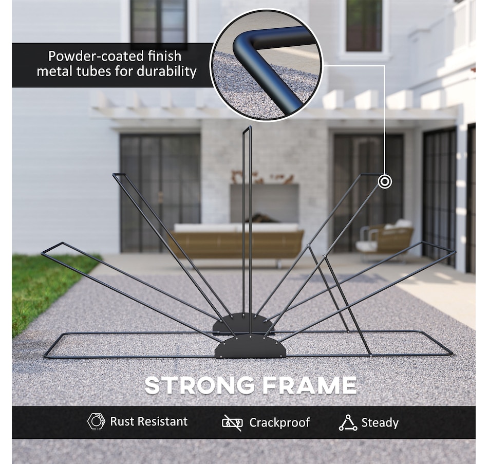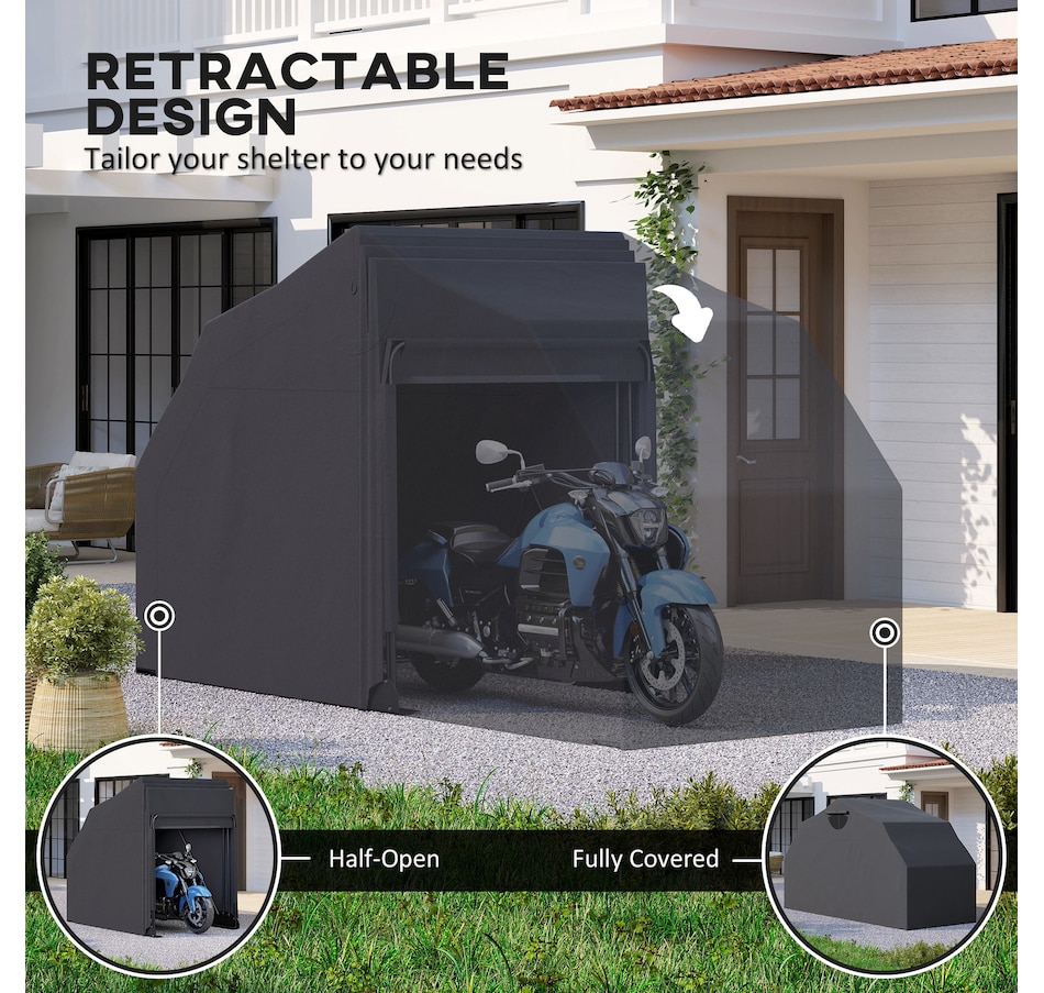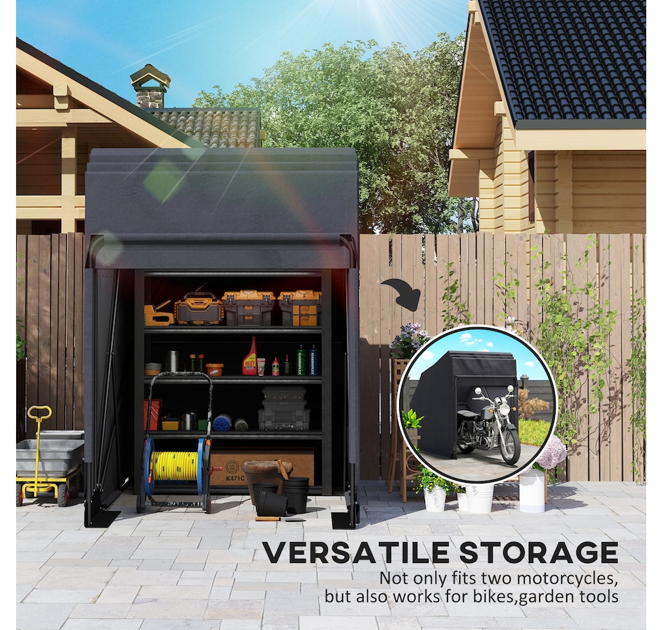 Discover the Outsunny Motorcycle Shelter, crafted with robust 600D Oxford fabric for water, dust, and UV protection. Its metal frame resists rust and cracks, ensuring your bikes stay secure. Ventilated with side mesh windows for fresh airflow, this versatile motorcycle tent fits two bikes or your other outdoor gear. A smart choice for any motorcycle storage or shed needs.