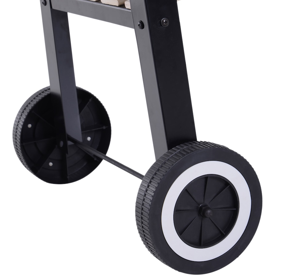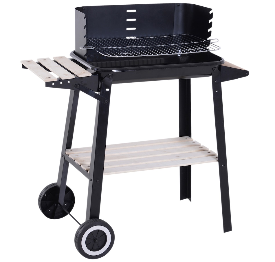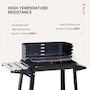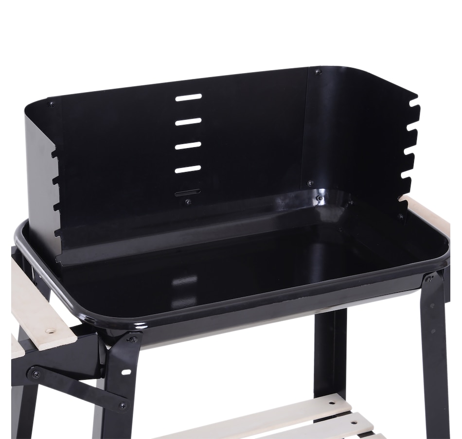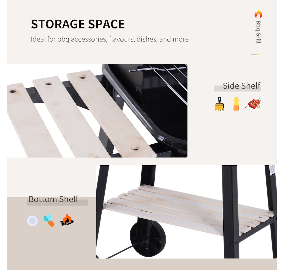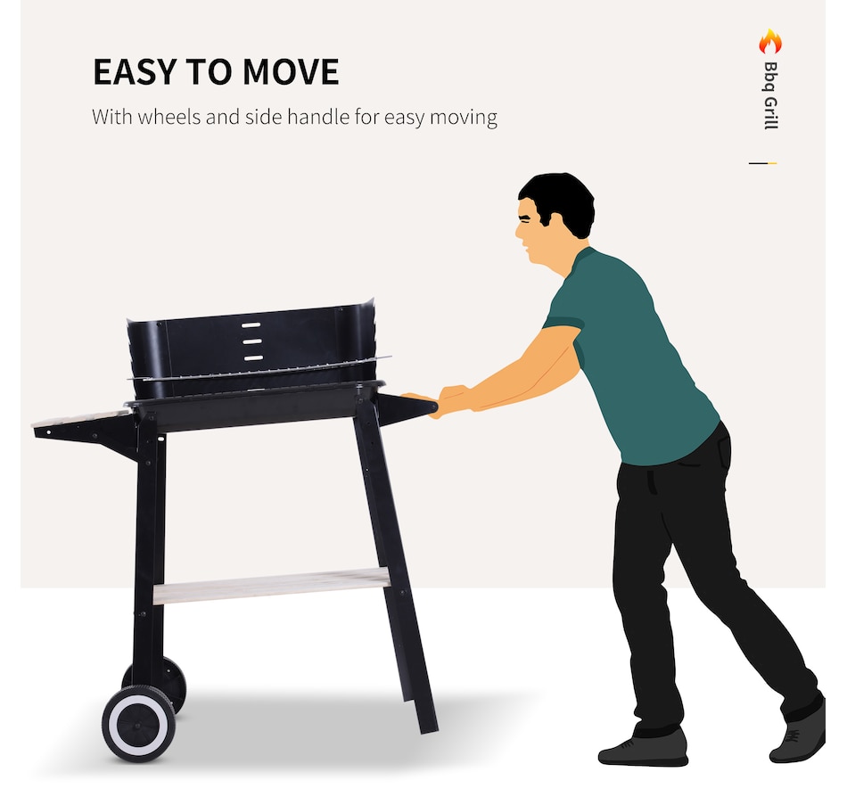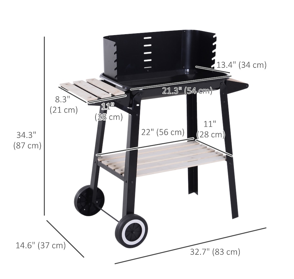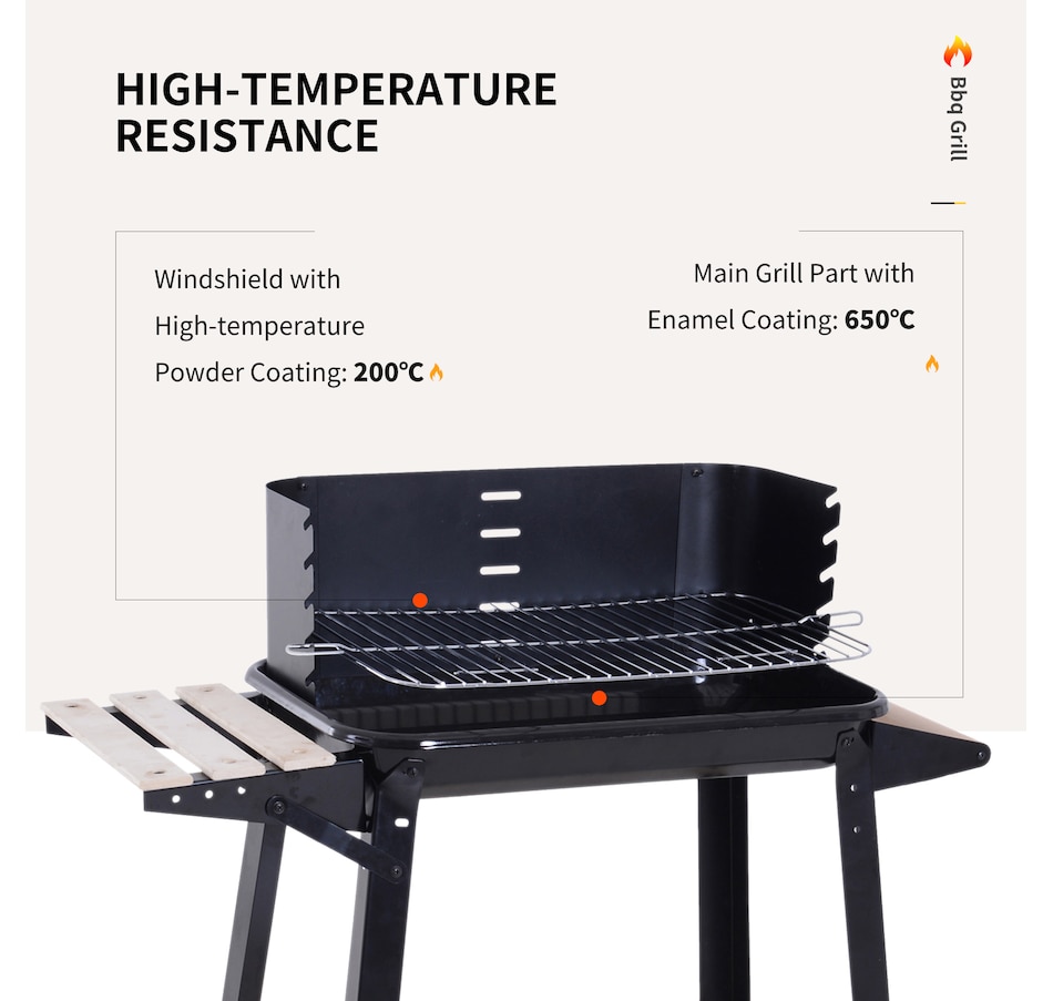 • Sturdy and durable metal construction for reliable use; • Enamel coated withstand temperatures up to 650℃; • Side wind shield for safety when cooking; • Large grill pan that's adjustable to five different heights; • Two wheels for easy movement; • The side and bottom shelves for keeping everything close to hand; • Note: Burning firewood directly will make the paint peel from high temperature;