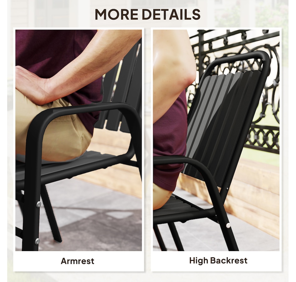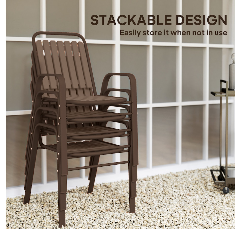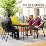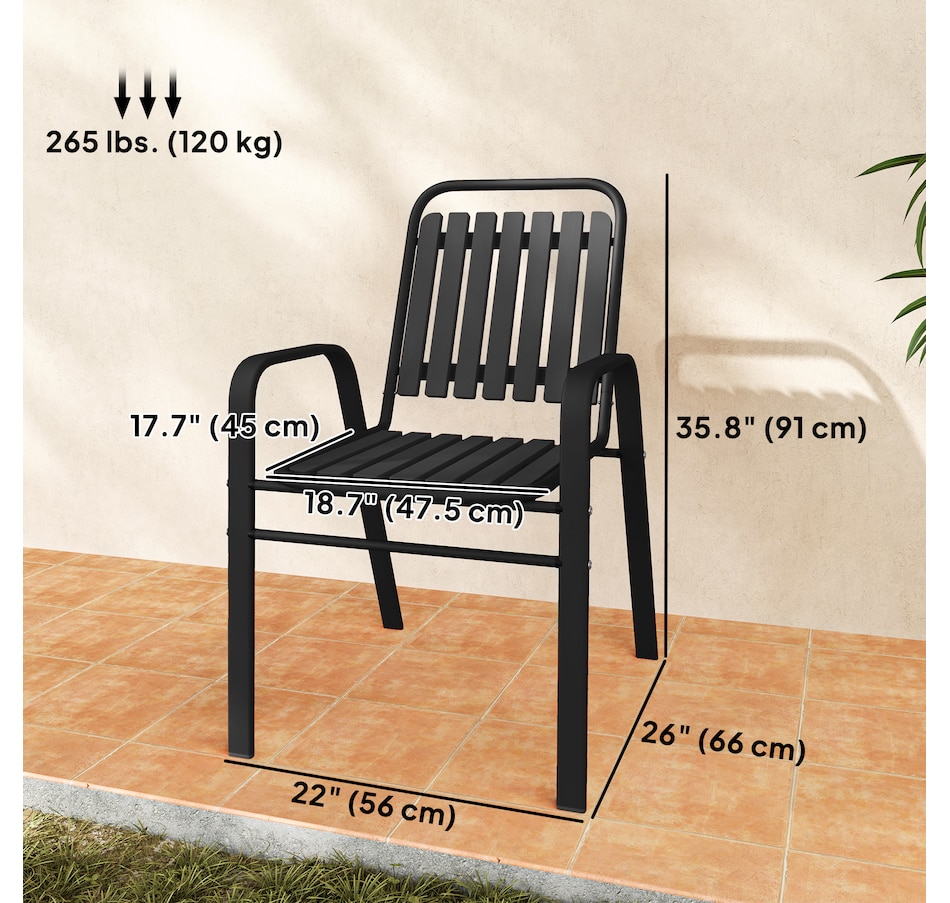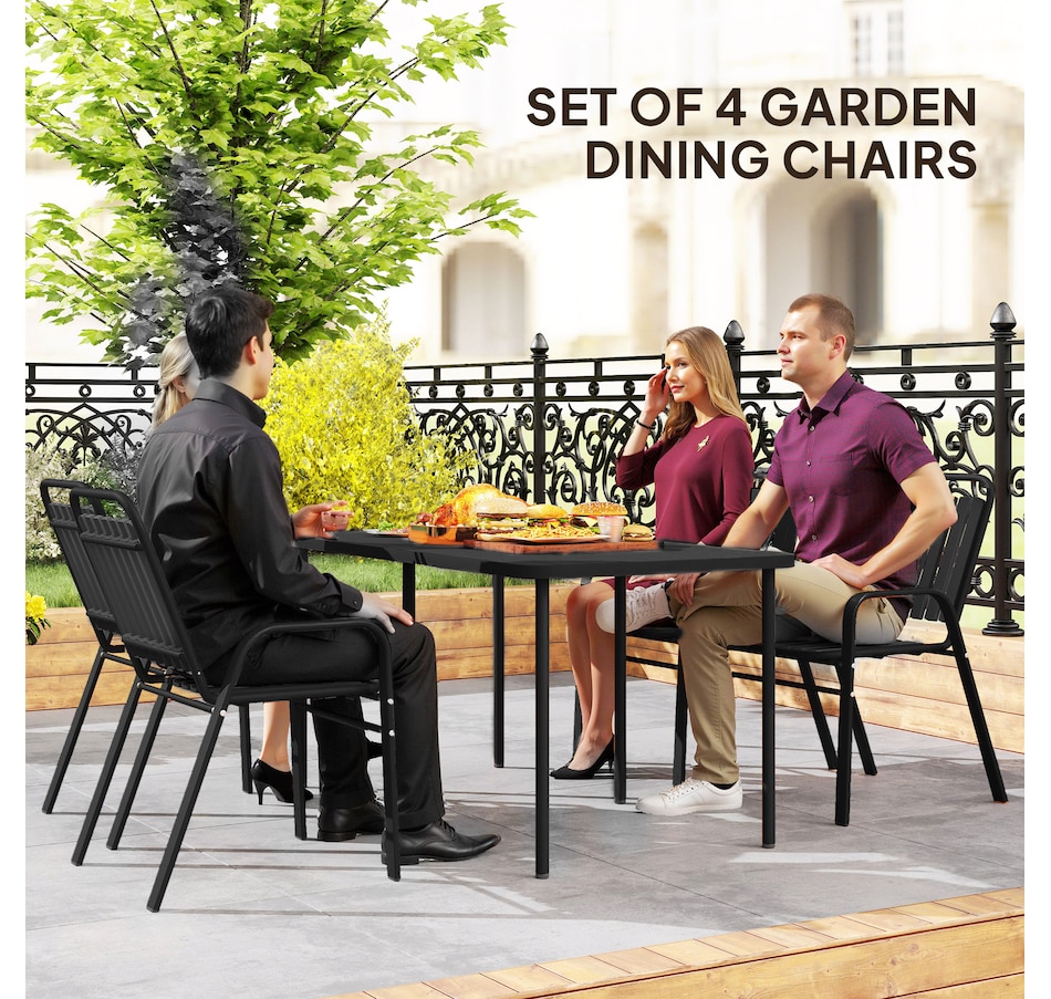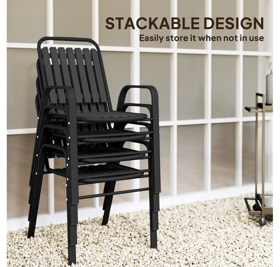 Transform your garden into a dining oasis with the Outsunny outdoor patio chairs. This 4-piece collection is versatile for any setting and features a stackable design to maximize space. Enjoy leisurely meals with high backrests and armrests for comfort crafted from sleek, powder-coated steel. Suitable for patios, balconies, and more.Features: