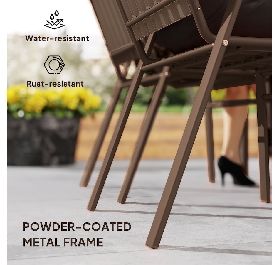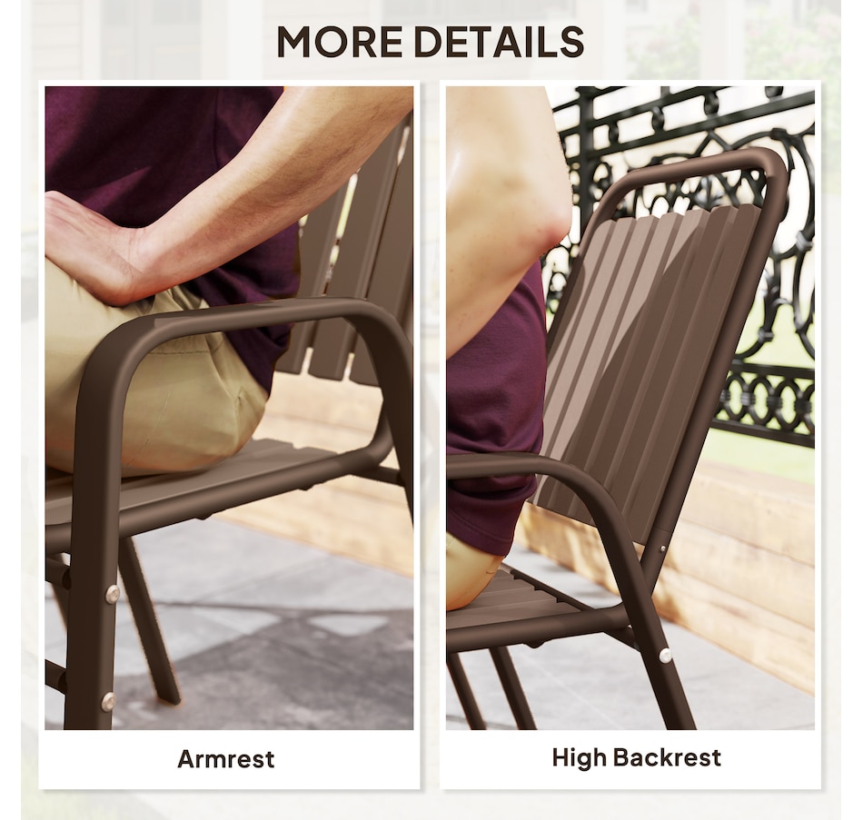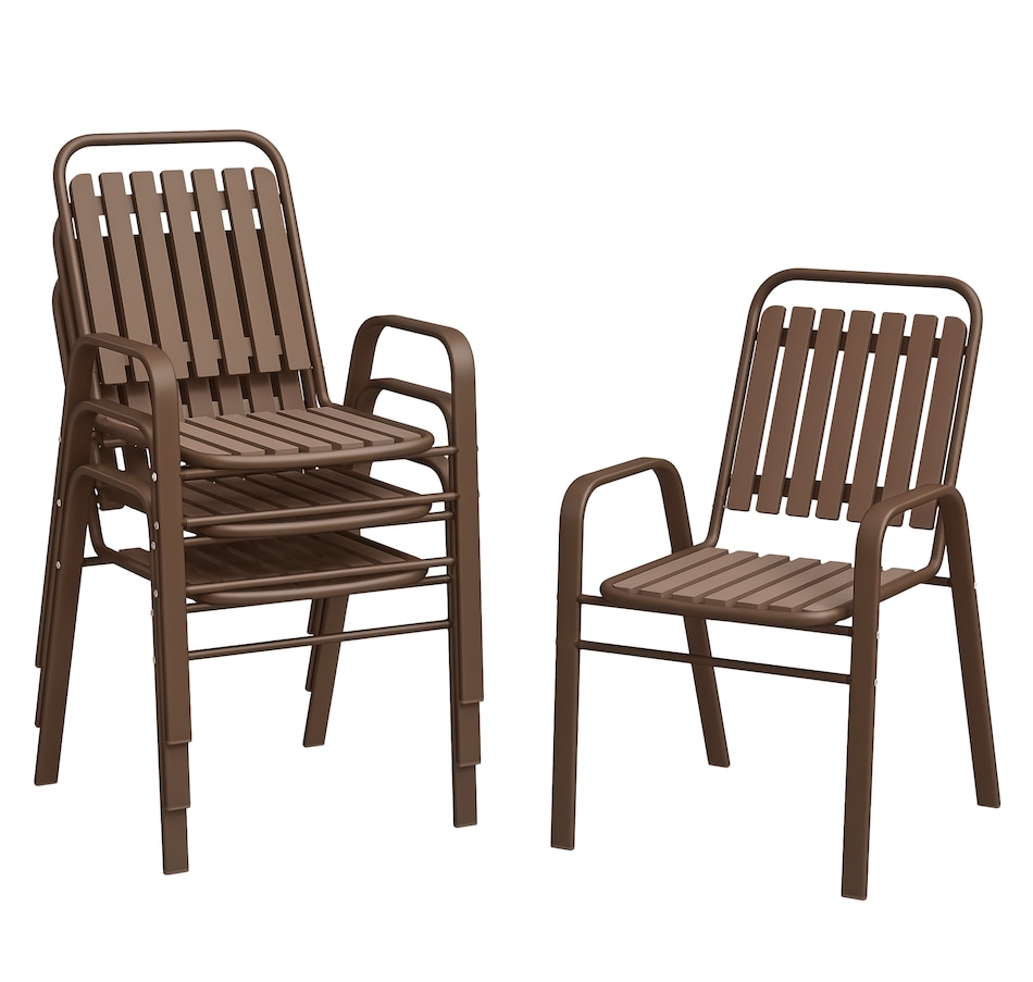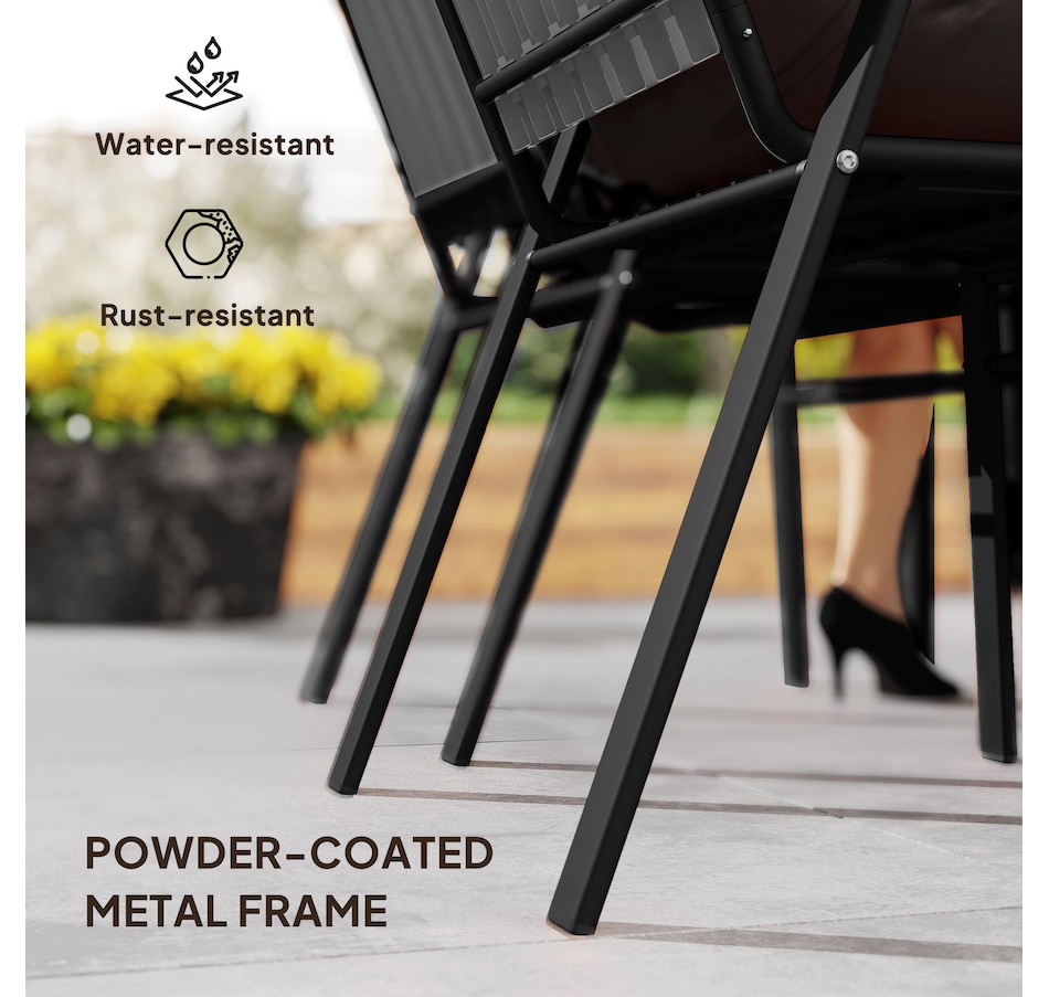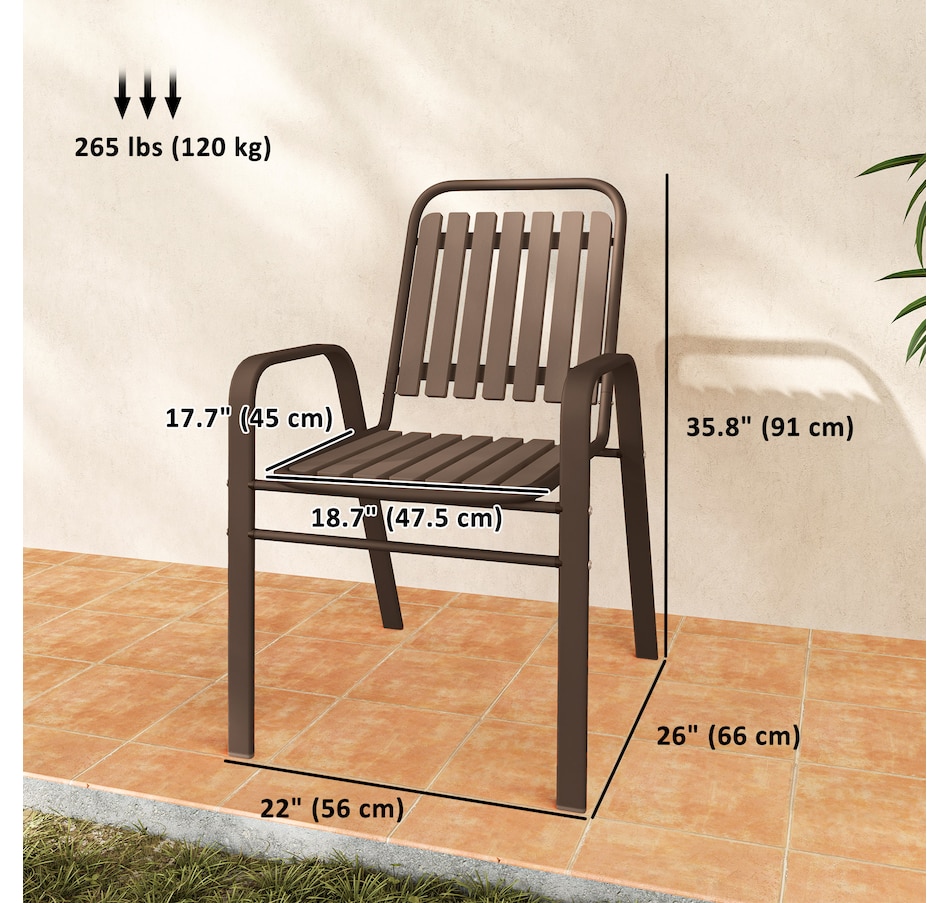 Transform your garden into a dining oasis with the Outsunny outdoor patio chairs. This 4-piece collection is versatile for any setting and features a stackable design to maximize space. Enjoy leisurely meals with high backrests and armrests for comfort crafted from sleek, powder-coated steel. Suitable for patios, balconies, and more.Features: