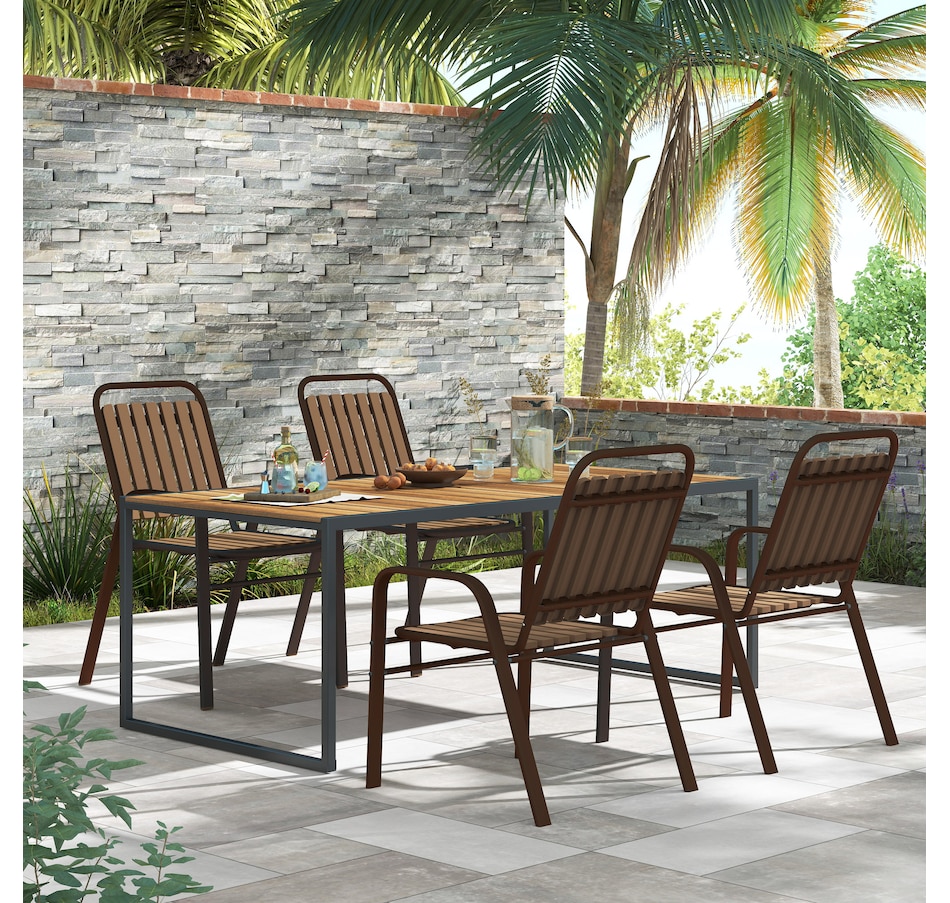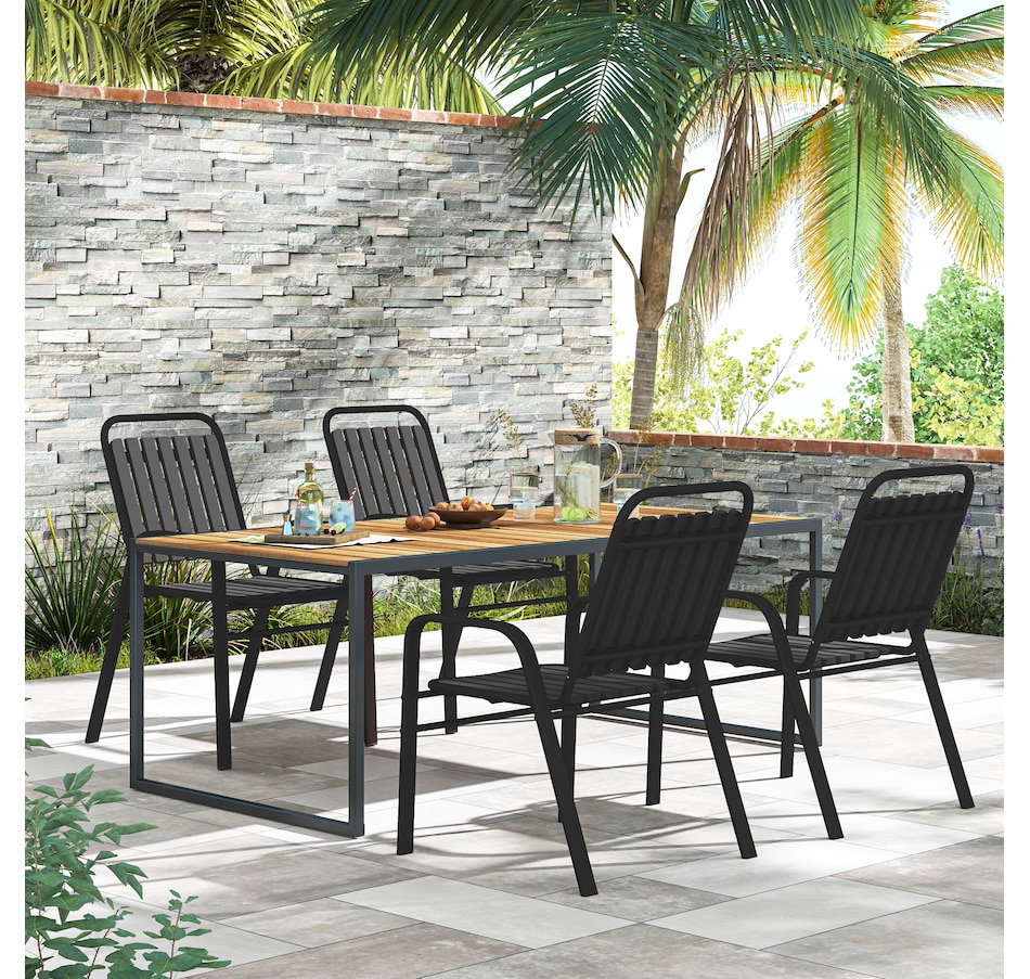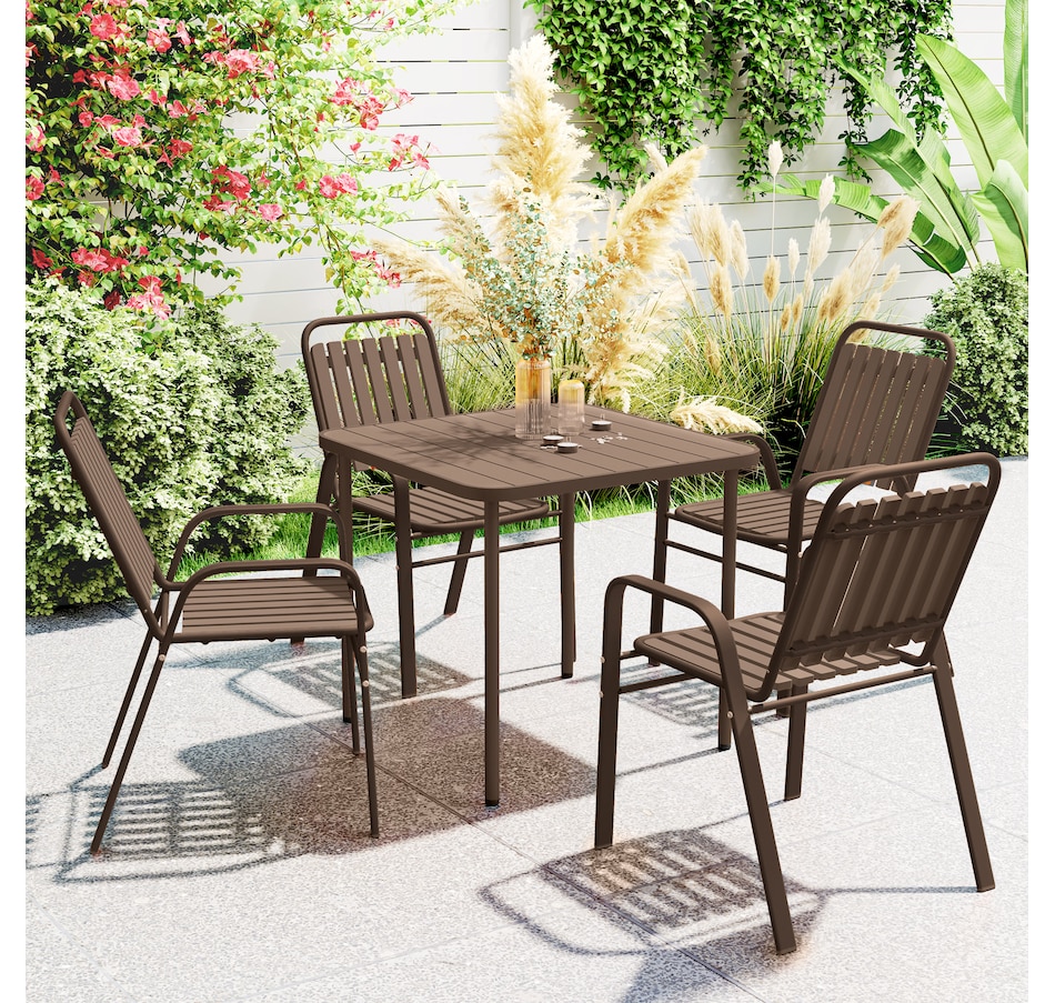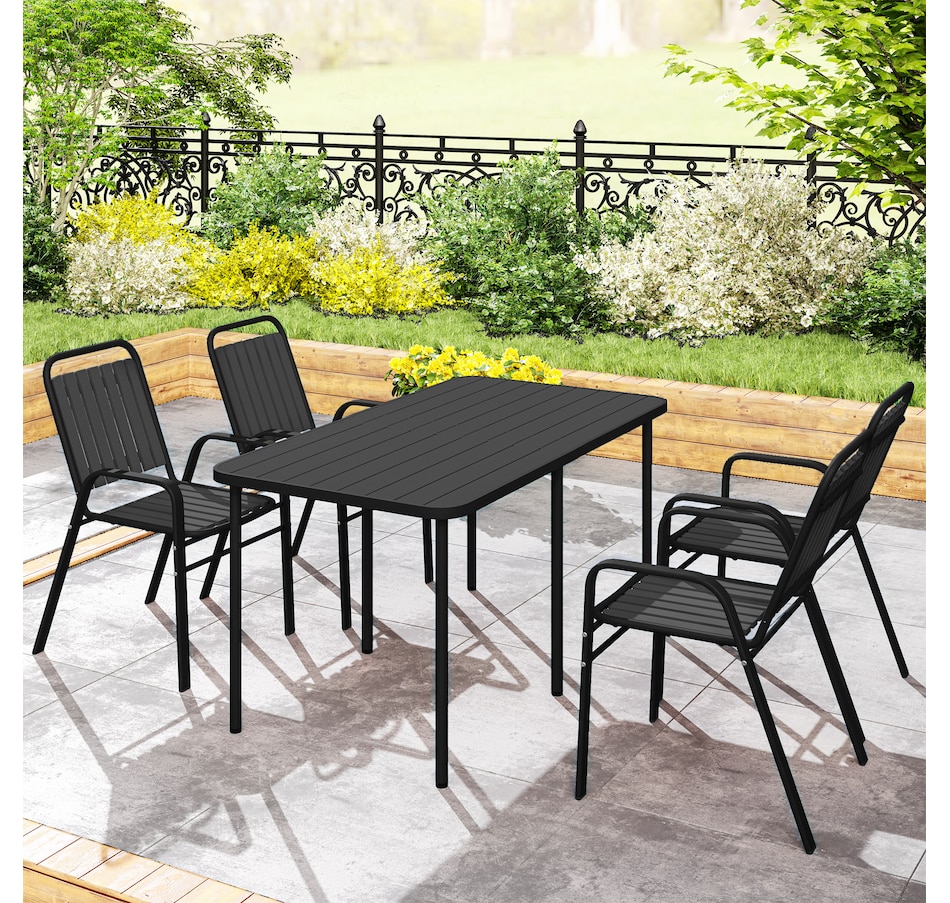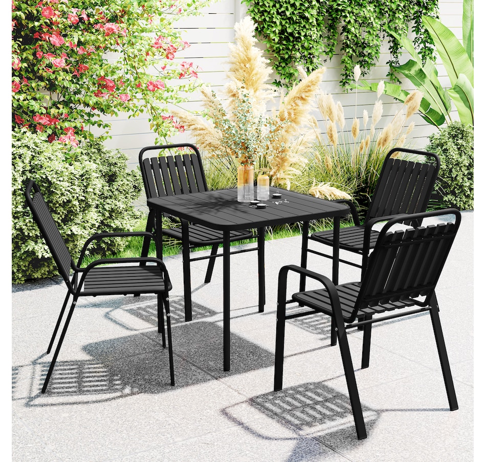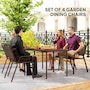Transform your garden into a dining oasis with the Outsunny outdoor patio chairs. This 4-piece collection is versatile for any setting and features a stackable design to maximize space. Enjoy leisurely meals with high backrests and armrests for comfort crafted from sleek, powder-coated steel. Suitable for patios, balconies, and more.Features: