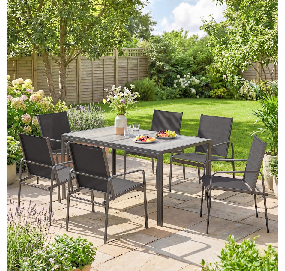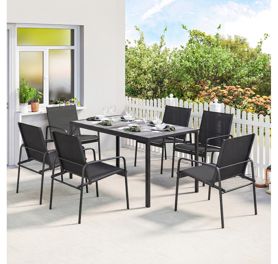 ● Seven-piece outdoor dining set with a rectangular table and six chairs for meals and gatherings;