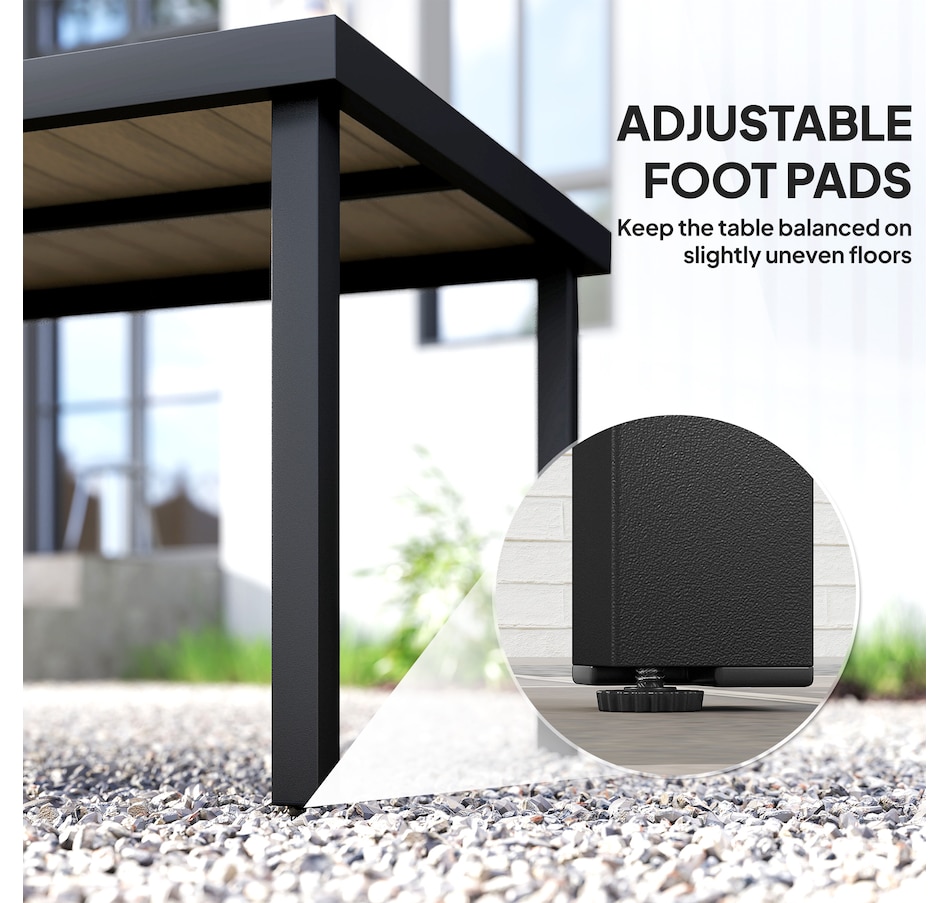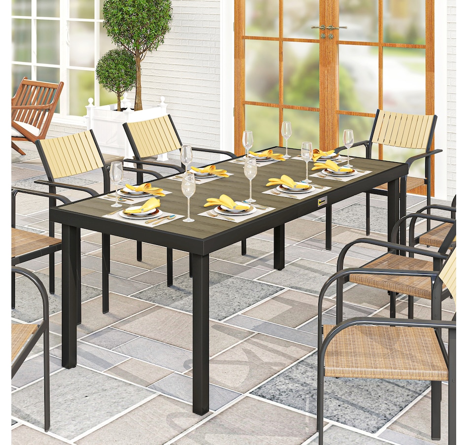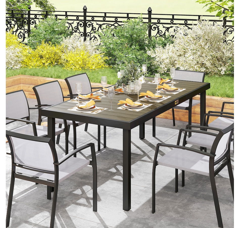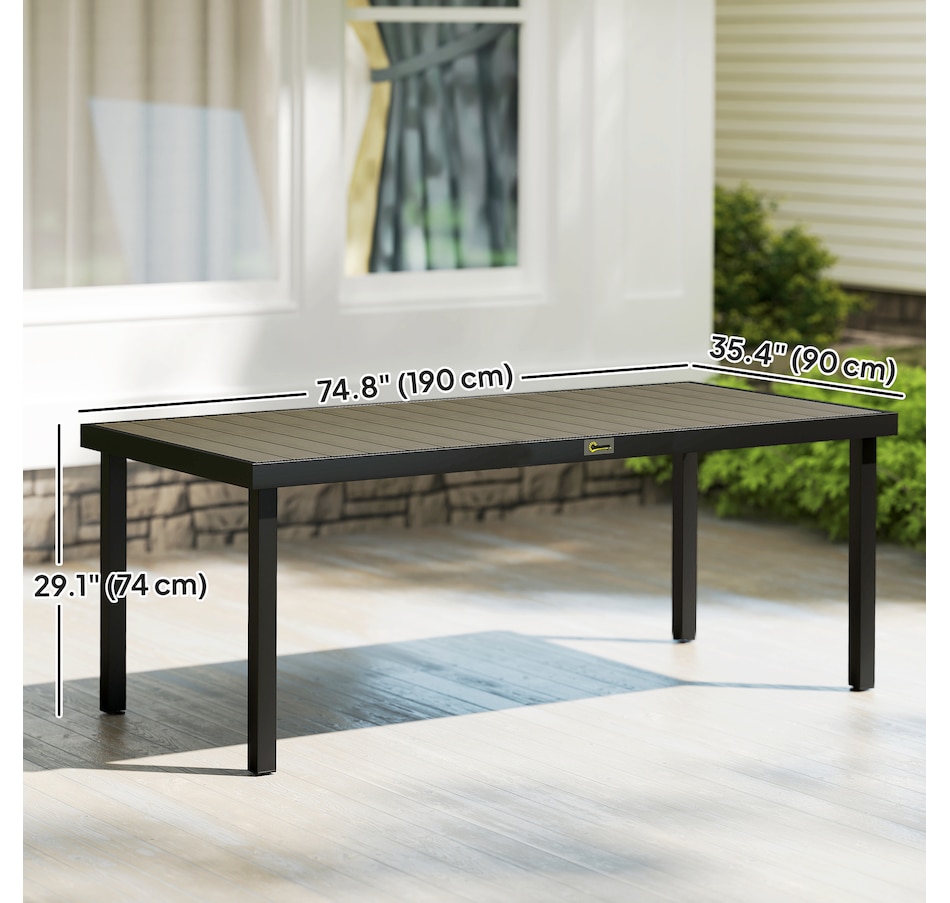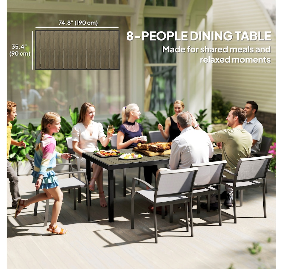 Host a dinner for 8 with Outsunny. Whether on the patio, porch, or poolside, this outdoor dining table is ready to serve. Crafted from HDPE, renowned for its weather resistance, it offers a rustic wood style with water-resistant properties. Enjoy ample space for serving dishes. Our garden table offers versatility for dinner, afternoon tea, or coffee on the balcony. Step outside, relax and choose Outsunny.