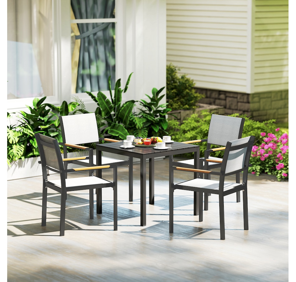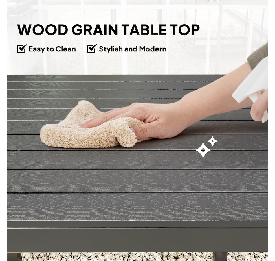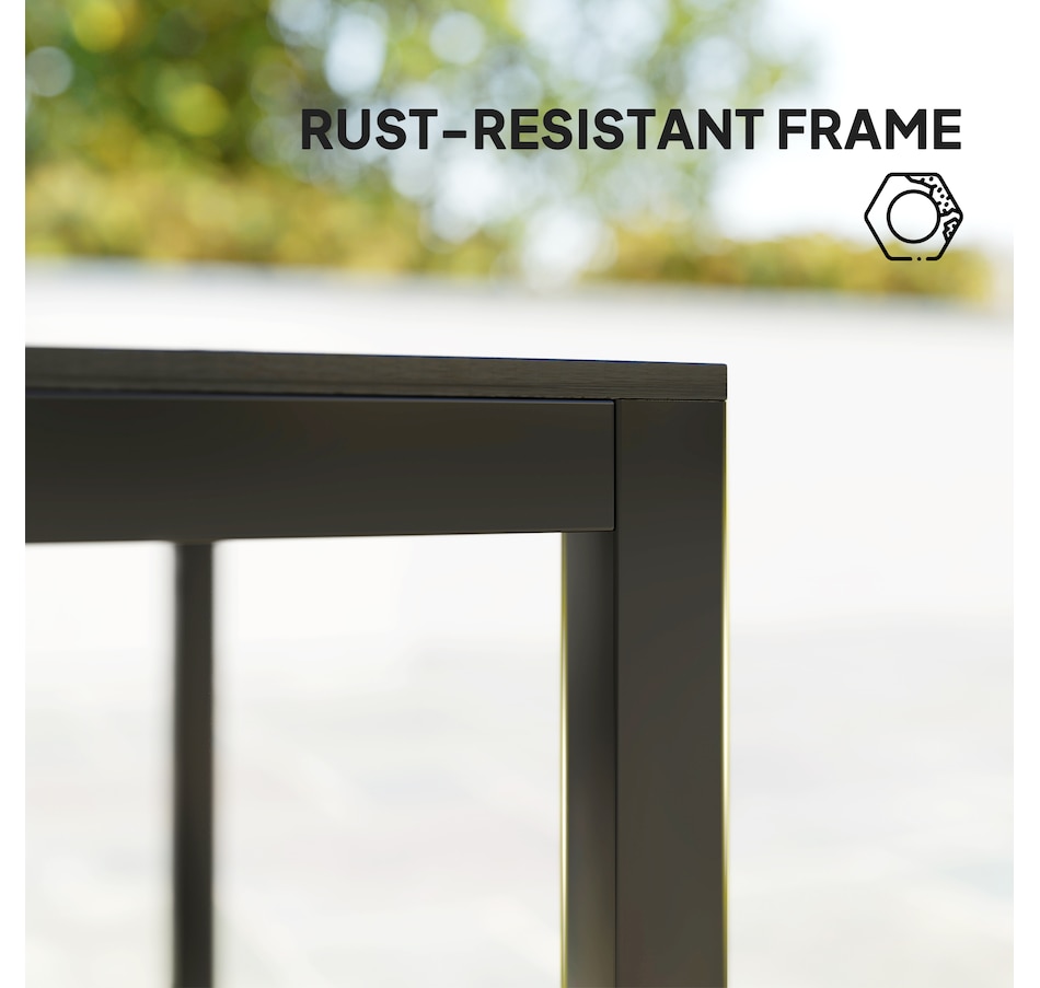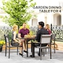 Discover the charm of the Outsunny garden dining table, where function meets flair. Designed for four, this outdoor dining table combines the rustic appeal of natural wood with the durability of a waterproof, easy-to-clean PS sheet. Suitable for any patio or garden, its robust steel and aluminium structure ensures lasting enjoyment.Features: