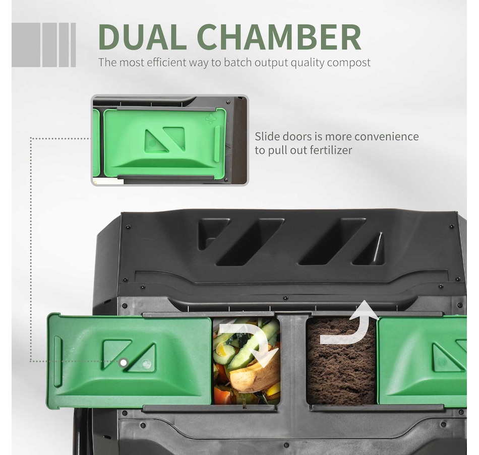 ● Outstanding ventilation system speeds up the composting process, easily produce finished compost in weeks;