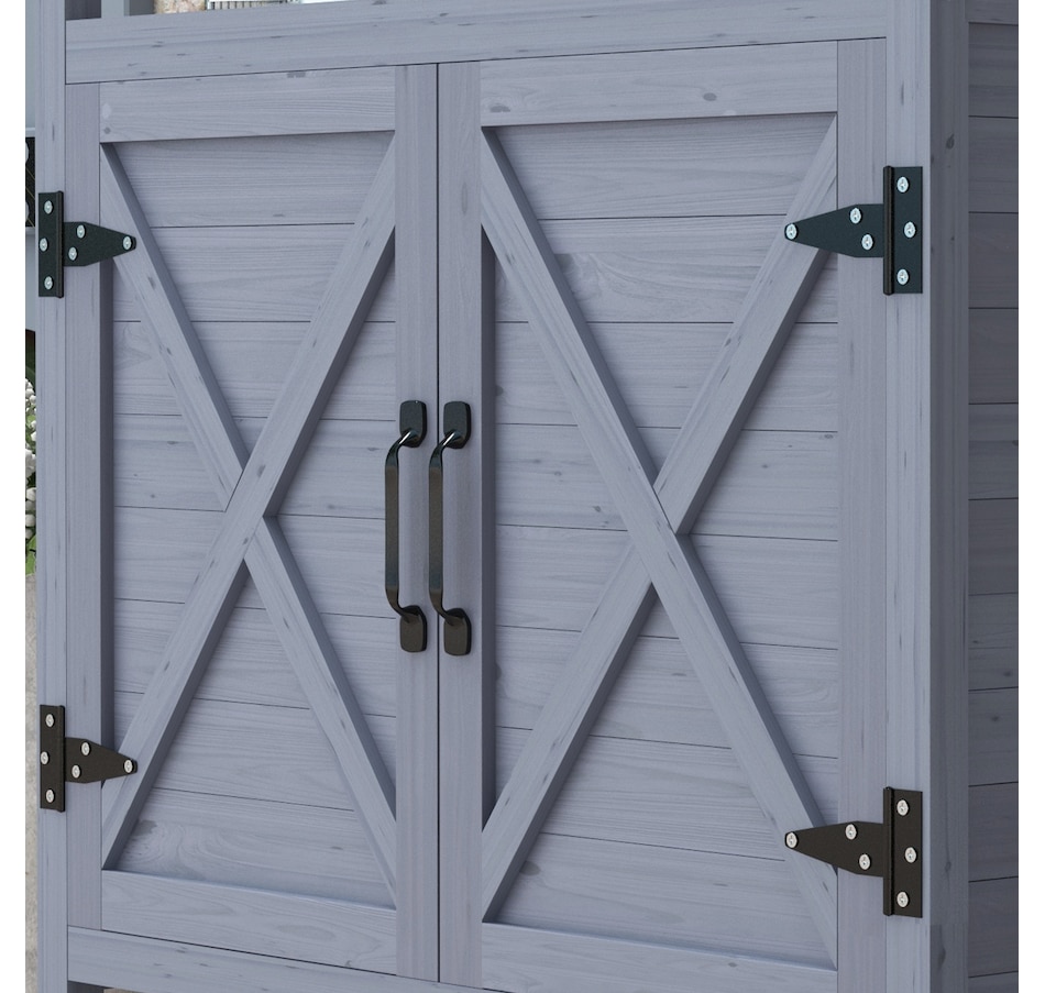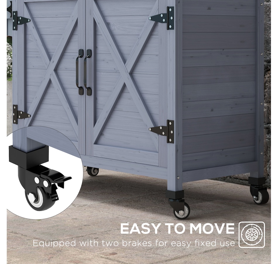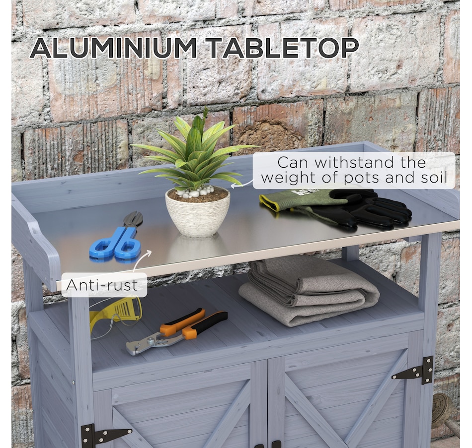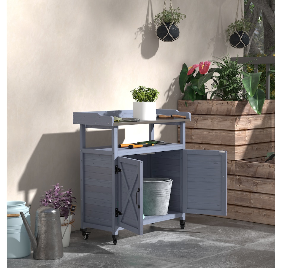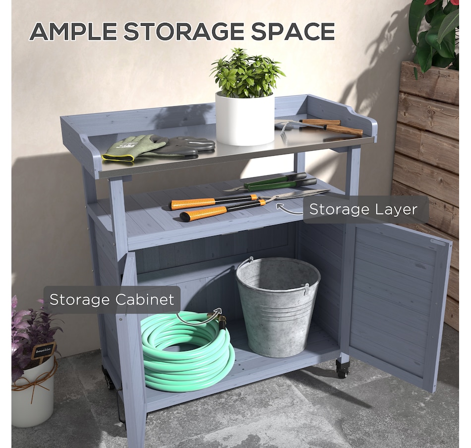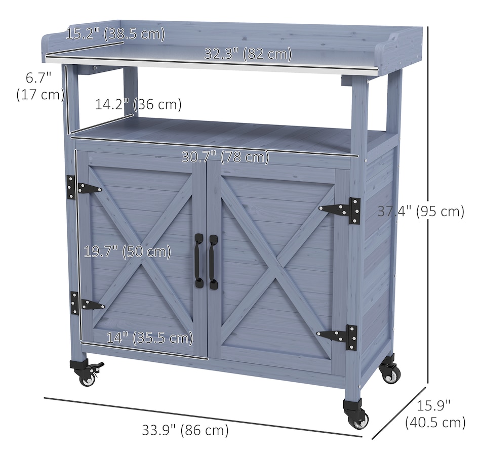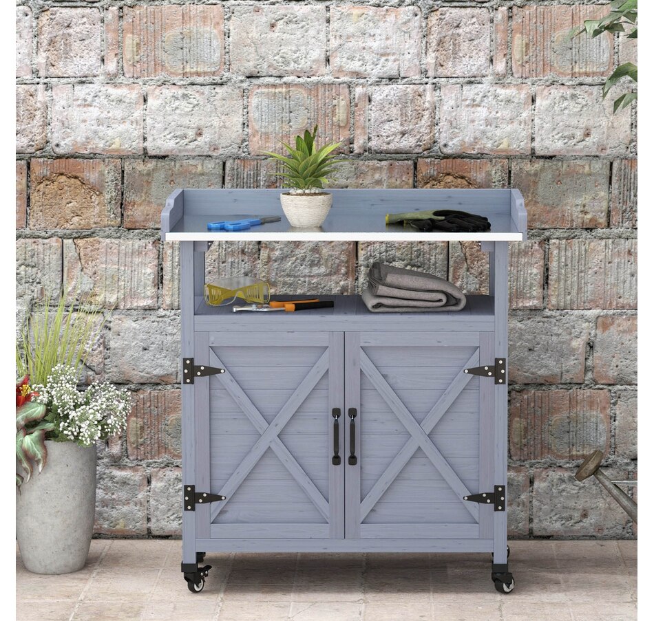 The Outsunny potting table is a wonderful outdoor workstation. With a spacious metal surface and a large storage cabinet, getting gardening work done will be easy. This work table is made mobile with wheels on the bottom. Roll it around to whatever area you need to work at, or put plants on it and move them as the weather changes. Featuring a classic country farmhouse look, it makes a practical accent. Raise your green thumb with Outsunny.Features: