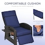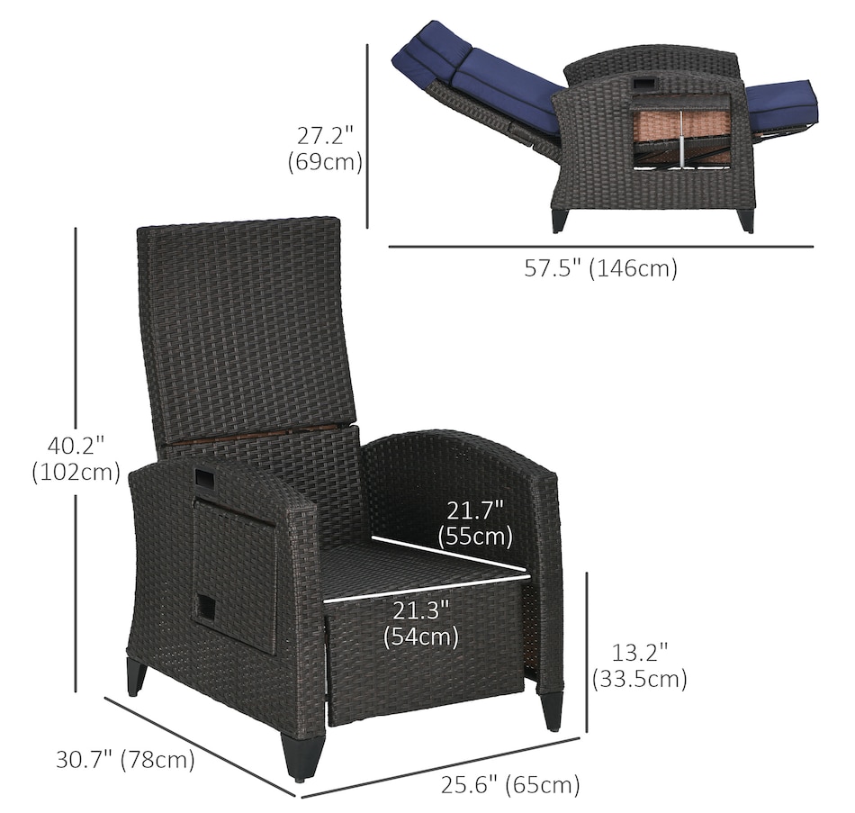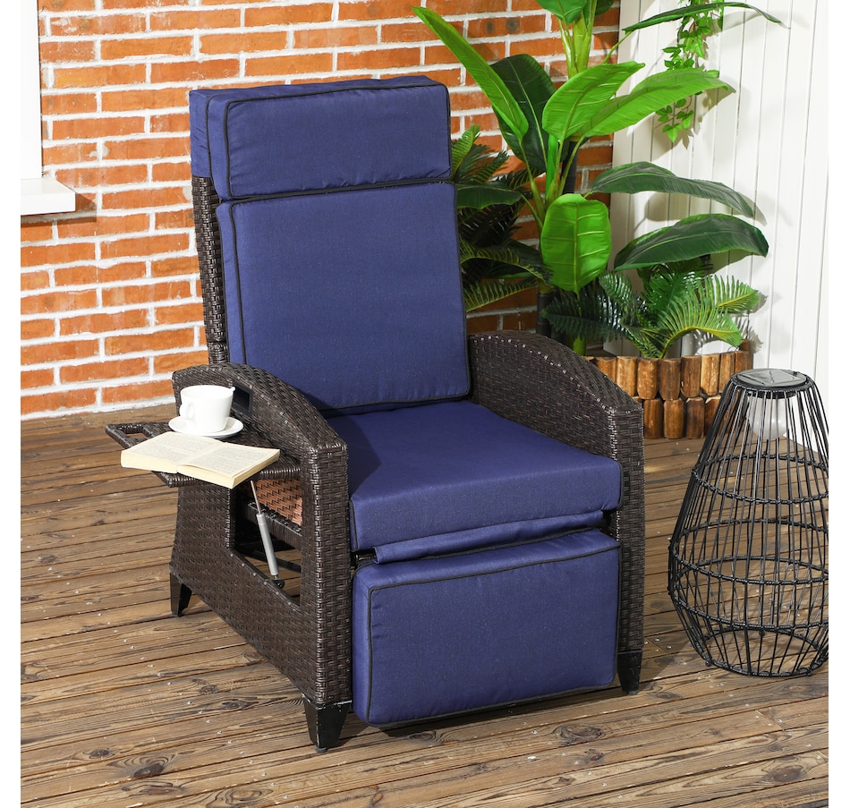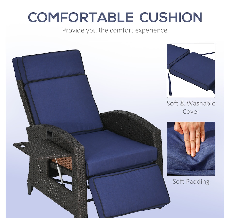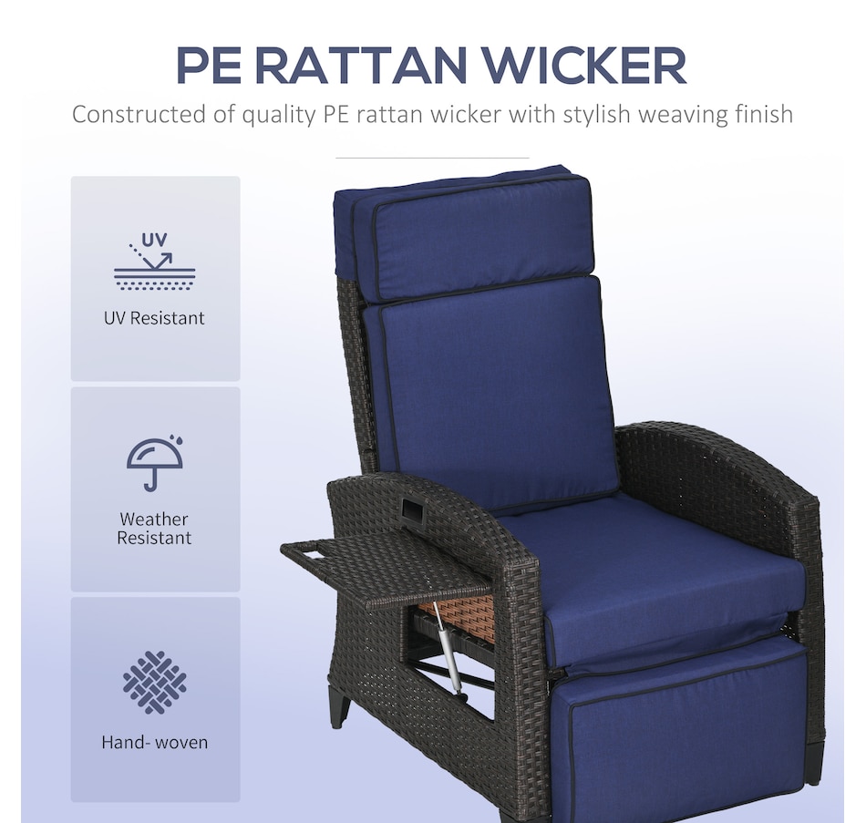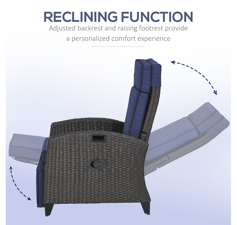 Who says a reclining chair doesn't belong in your backyard? You can have the same kicked-up footrest reclining experience outside, cushions and all. Our outdoor recliner with effortless angles adjust max 140°. Select your favorite and send indoor relaxation outdoors. Easy on the eyes, too, it was hand woven and seat, back, headrest, footrest cushions. With an outdoor-ready, water-safe build, you can put all-inclusive comfort on your porch. Get out, get comfy, get Outsunny.