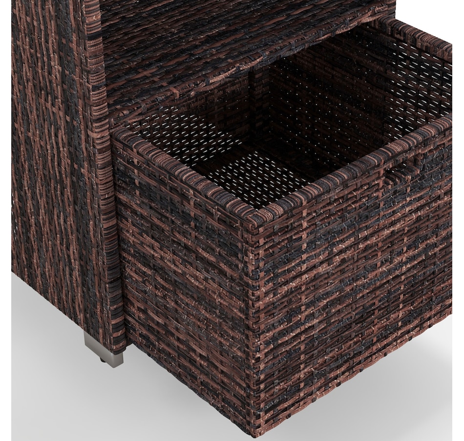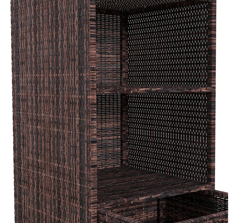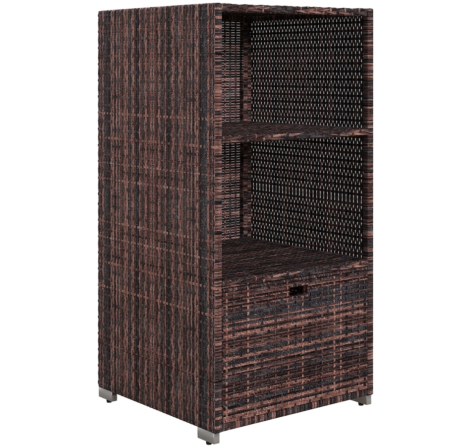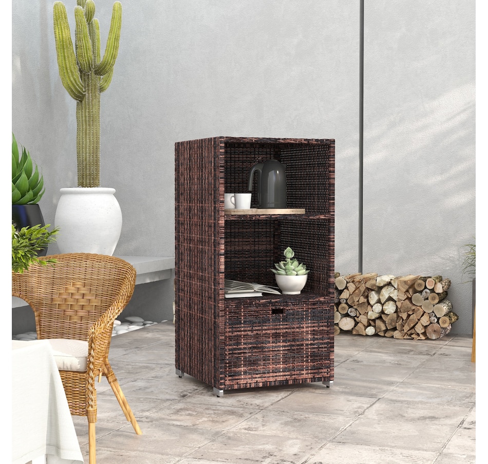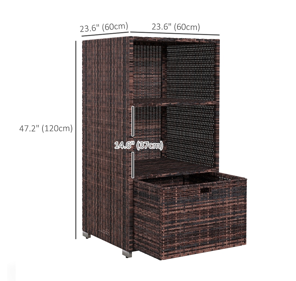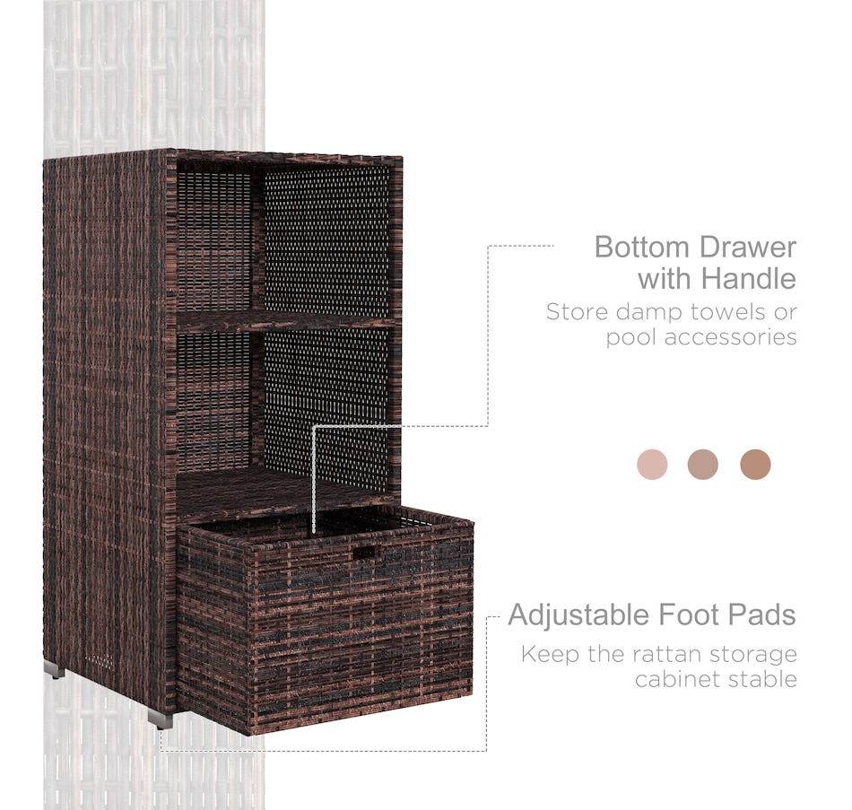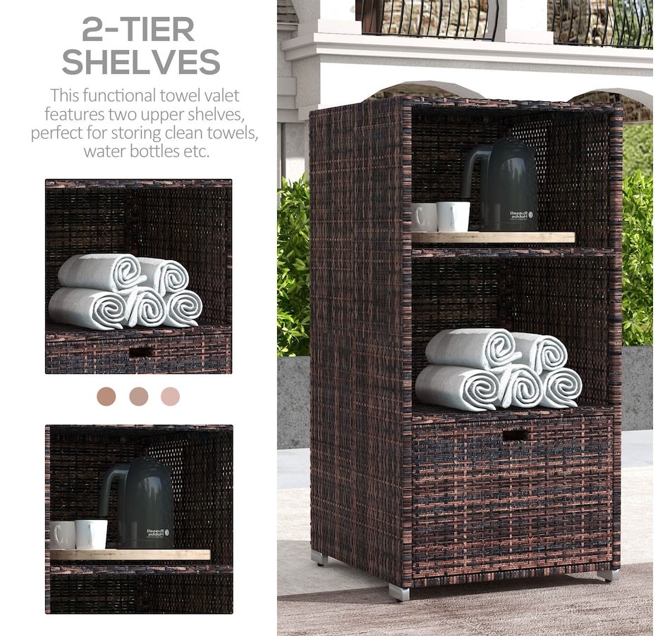 Keep your towels and pool accessories close by with the convenient Outsunny 47" Rattan Wicker Outdoor Pool Towel Valet Stand. Constructed from galvanized steel and all-weather PE rattan wicker, this handy towel storage cabinet features 2 upper shelves and a large bottom drawer for additional storage options. Add this product to your pool or spa for a resort or private club feel in the comfort of your own backyard!