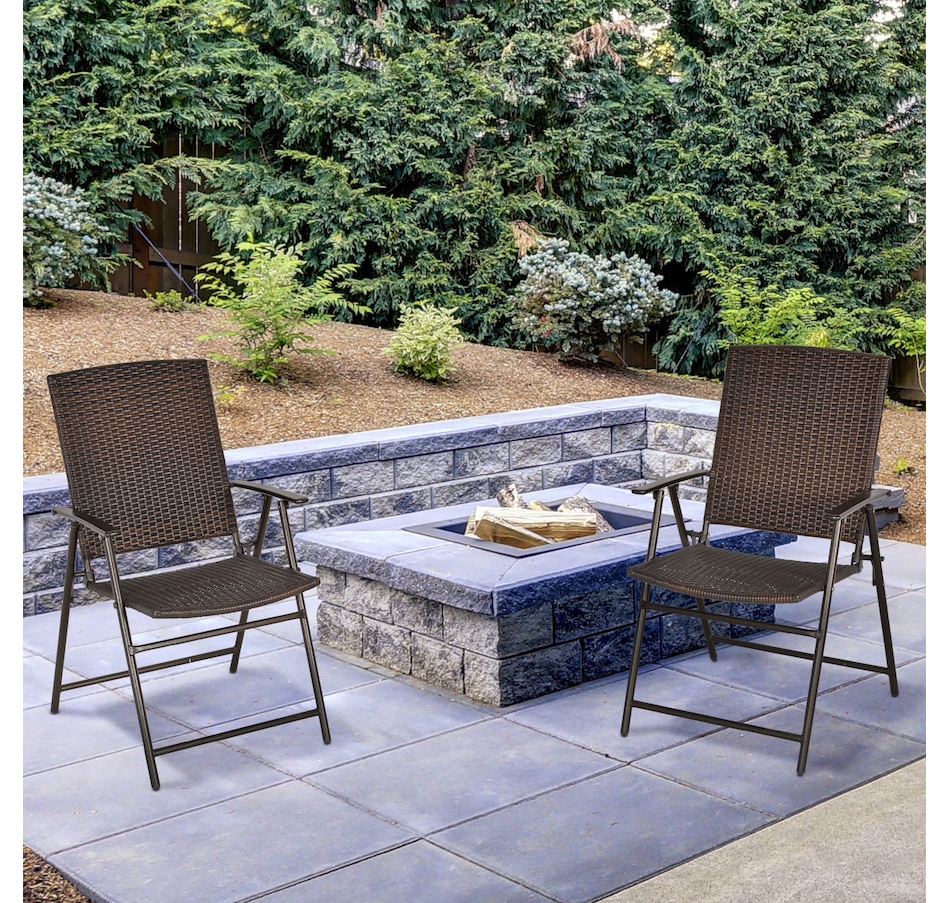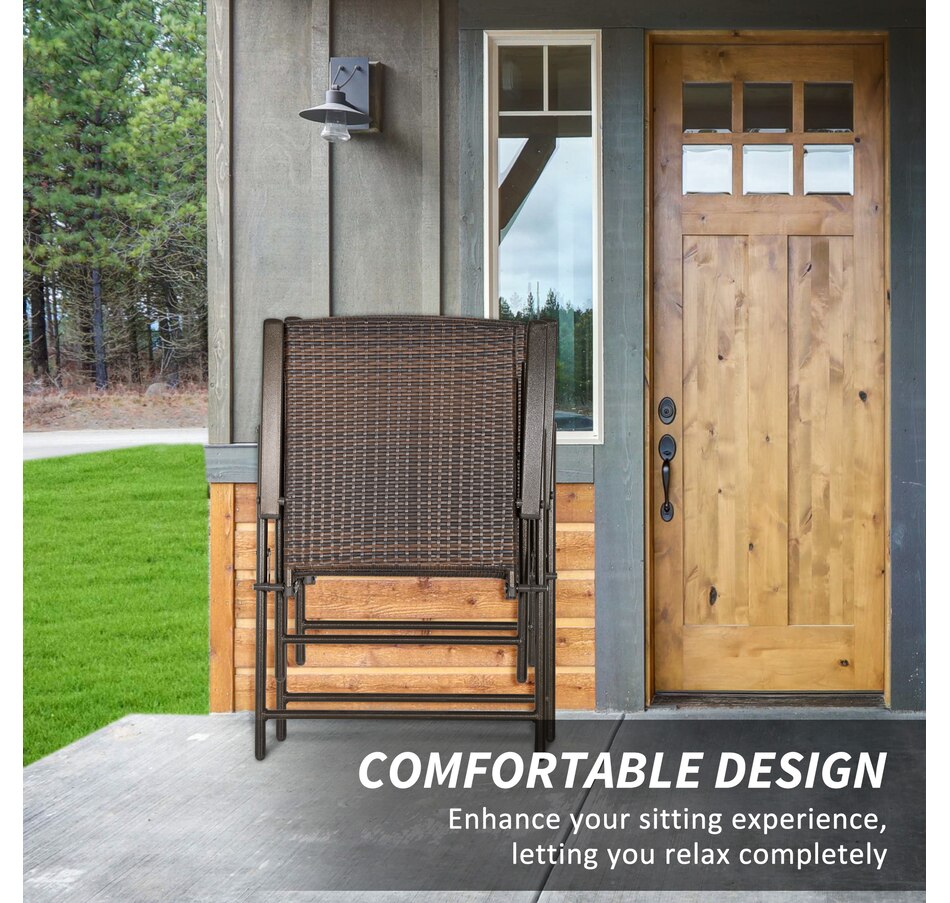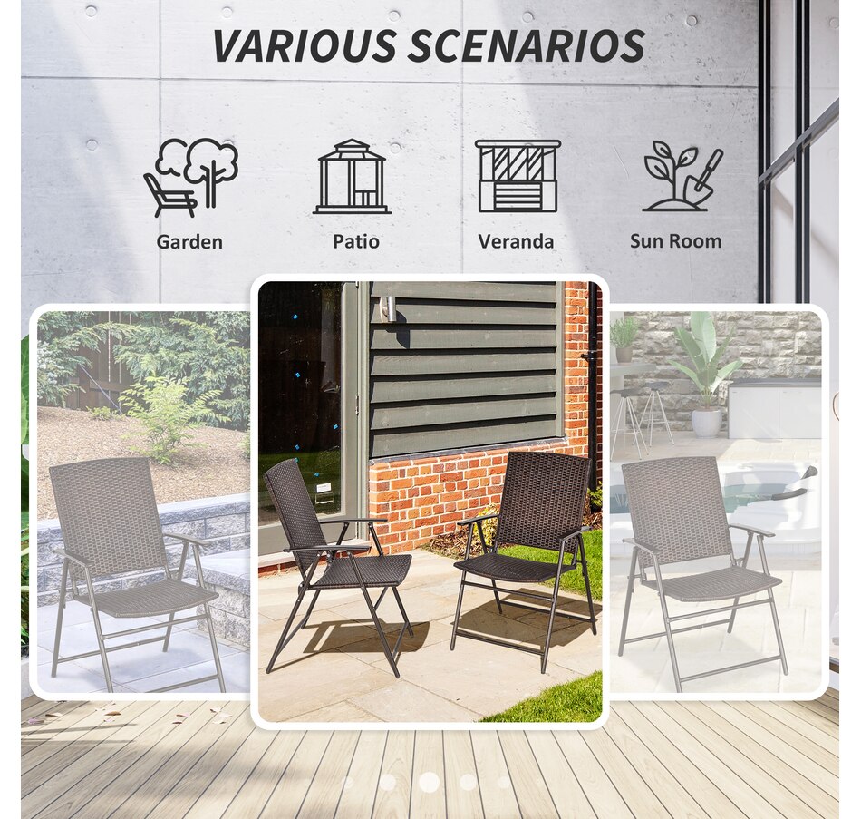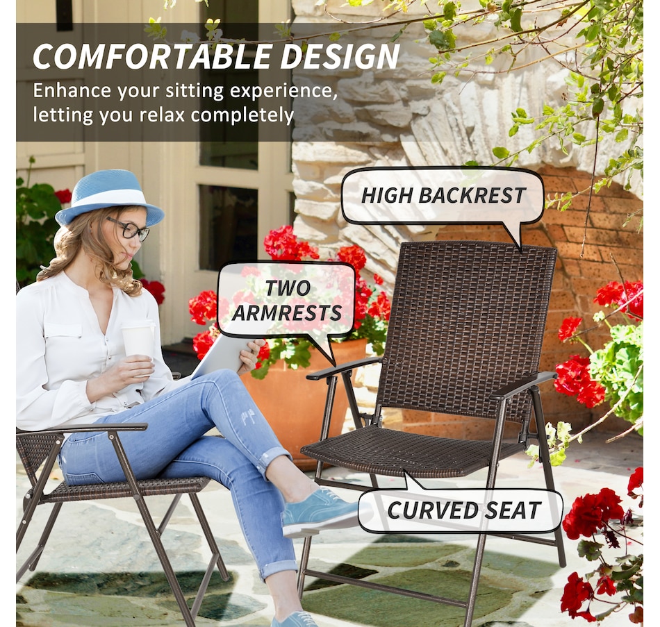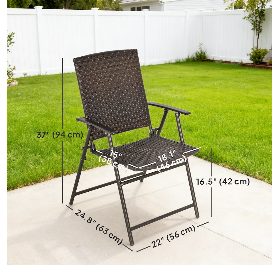 These outdoor wicker chairs set of 2 from Outsunny combine design and function. Framed of sturdy steel and wrapped in PE rattan, the wicker patio chair is stylish and durable. The foldable design makes it easy to store both chairs when needed for space-saving. Both rattan dining chairs are also easy to clean and maintain, meaning minimal effort for you, and more time to enjoy outdoors.Features: