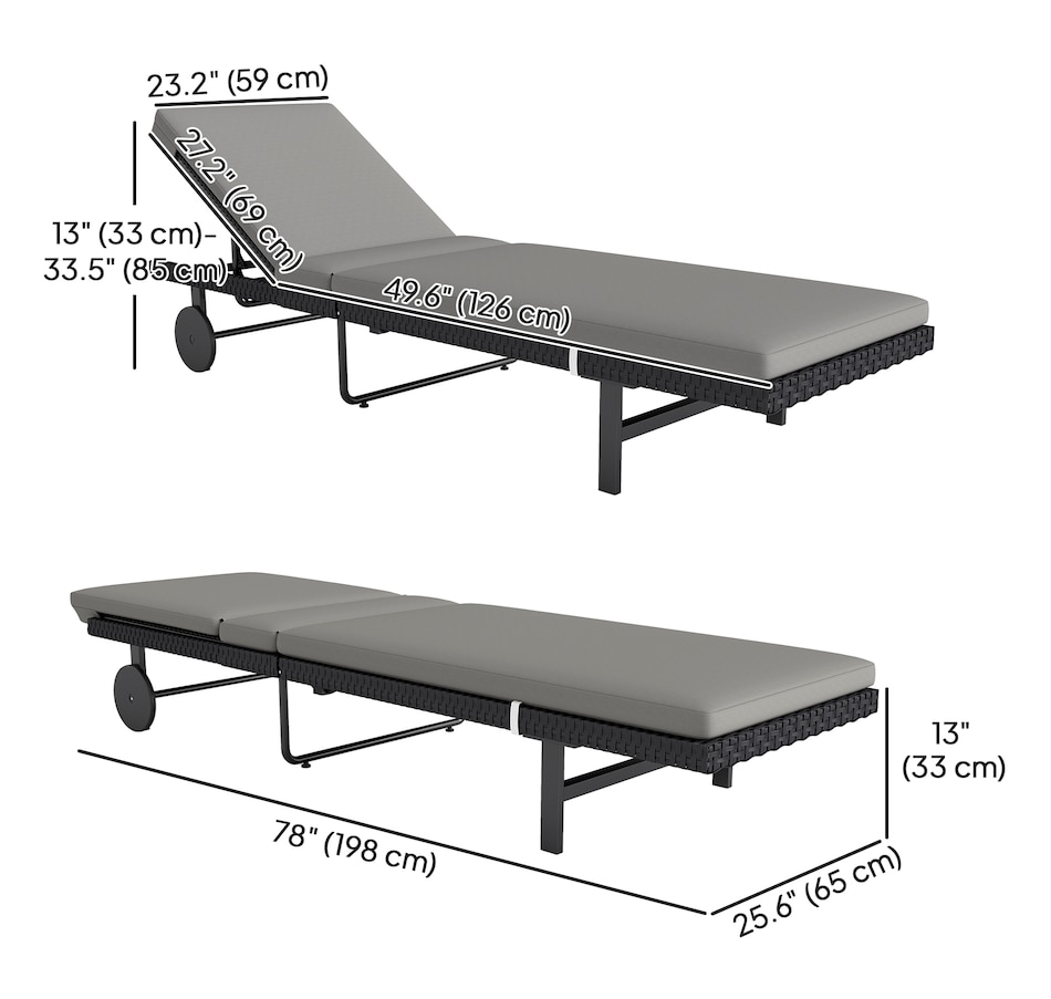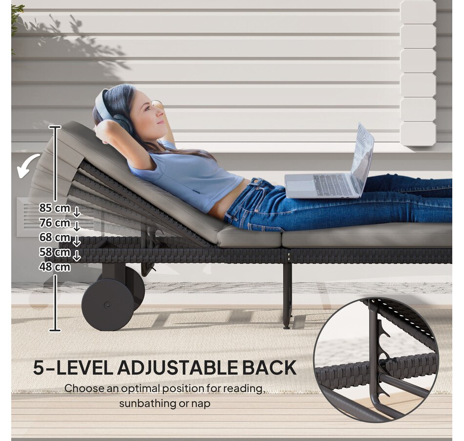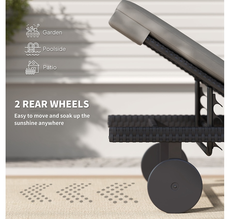 Soak up the sun with the Outsunny pool lounge chair! Find your angle with a five-position adjustable backrest and roll easily to your favorite spot with built-in wheels. This splash-resistant, UV-protected outdoor chaise lounge features a comfy integrated cushion with removable covers, great for any patio lounger or beach lounge chair enthusiast.Features: