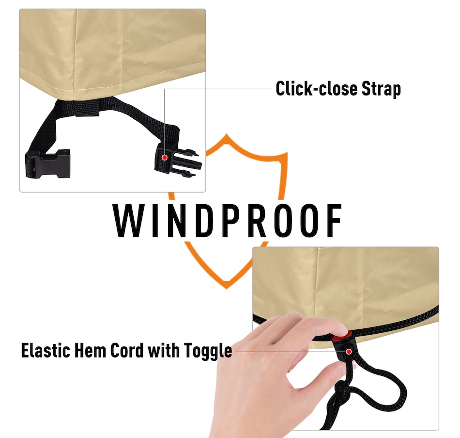 ● Click-close strap and plastic buckles to secure cover in the windy days