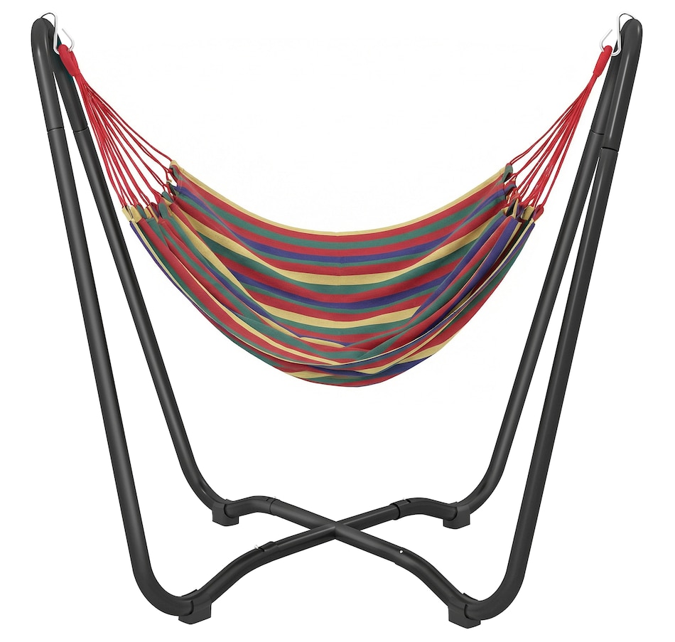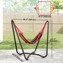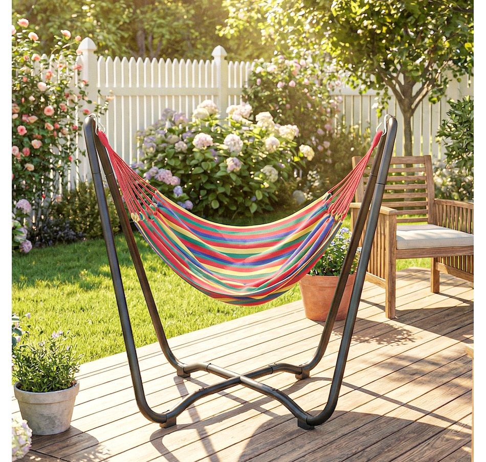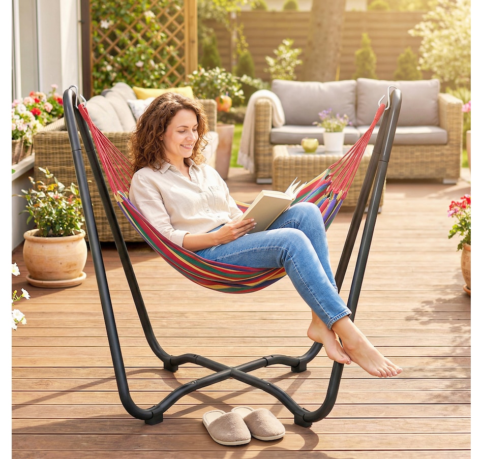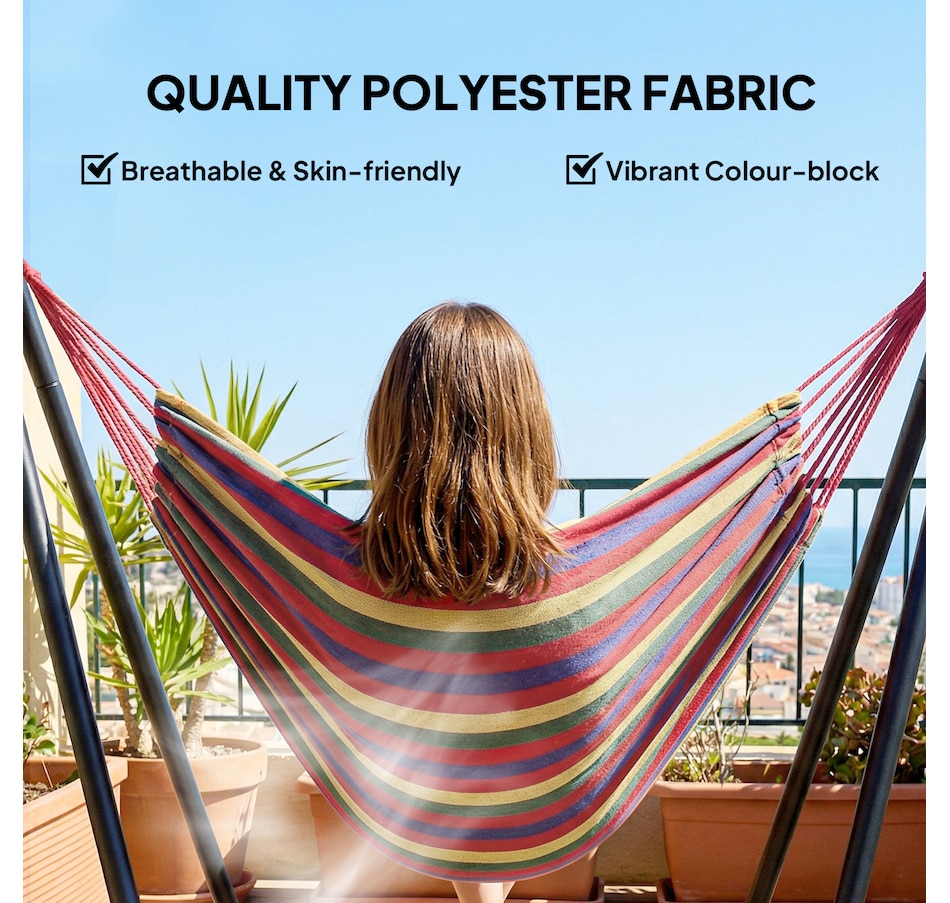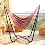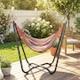 Lounge in style with this vibrant hammock featuring a freestanding steel frame – no trees or walls required! Quick to hang with adjustable S-hooks, it's great for relaxing in your garden, patio, or terrace without causing any damage. Crafted from breathable, fade-resistant polyester in bold red, yellow, green, and purple tones, this single-person hammock is your cosy outdoor getaway for reading, napping, or soaking up the sun.