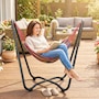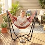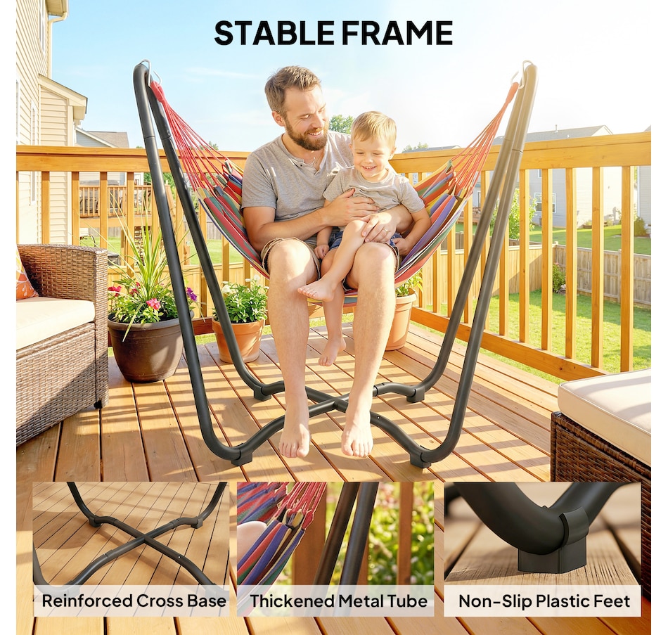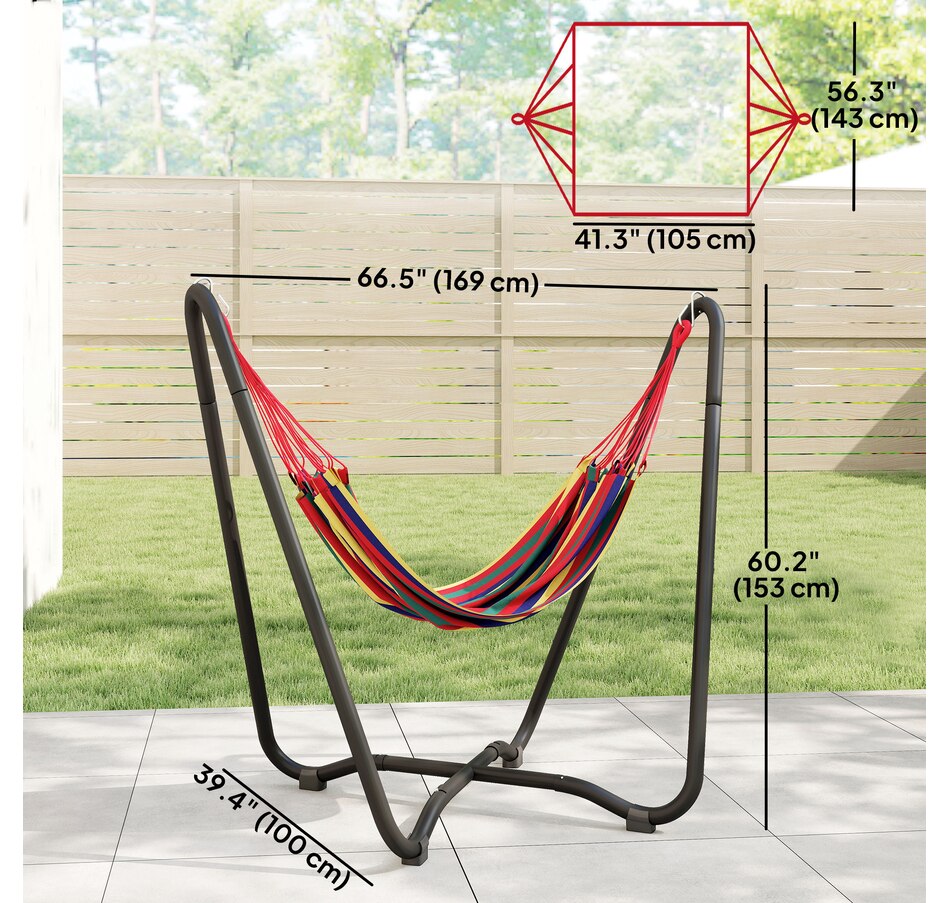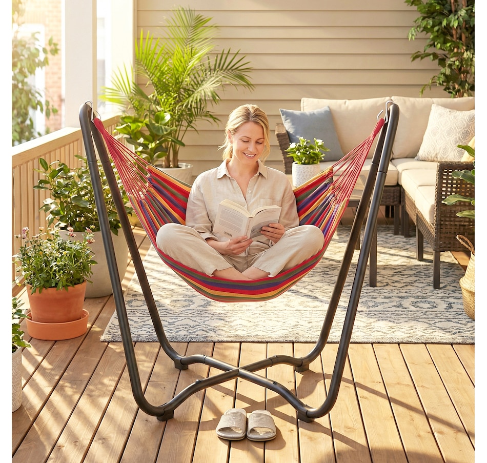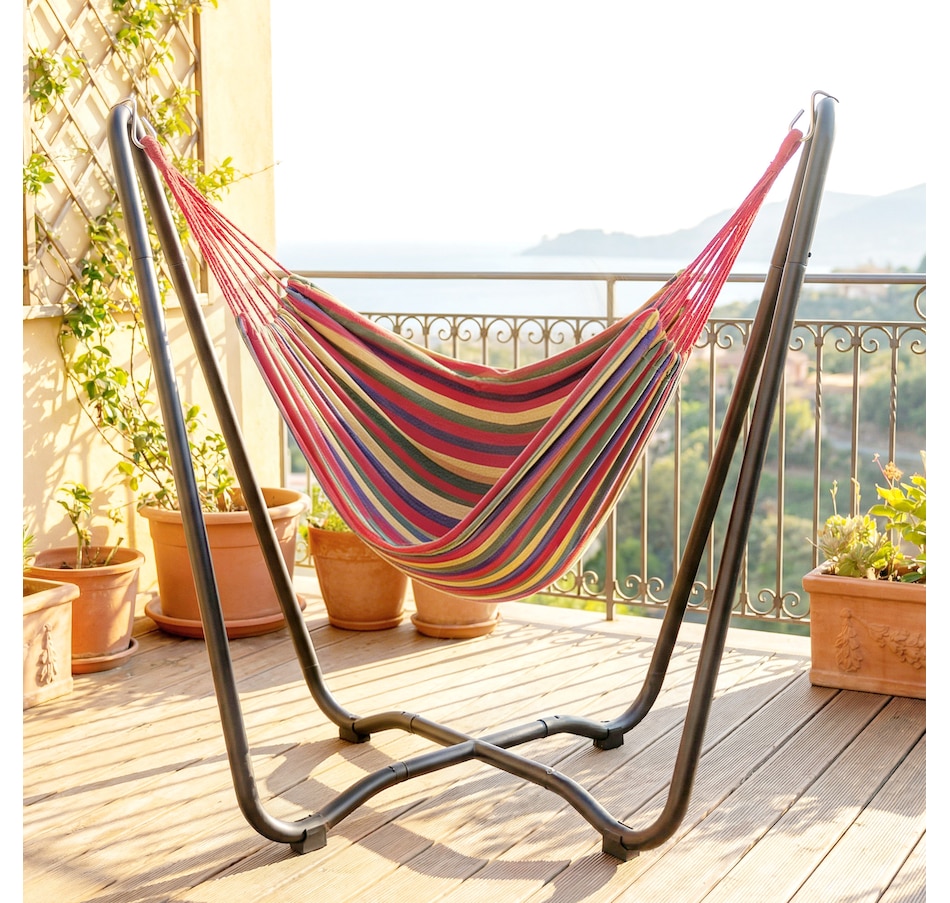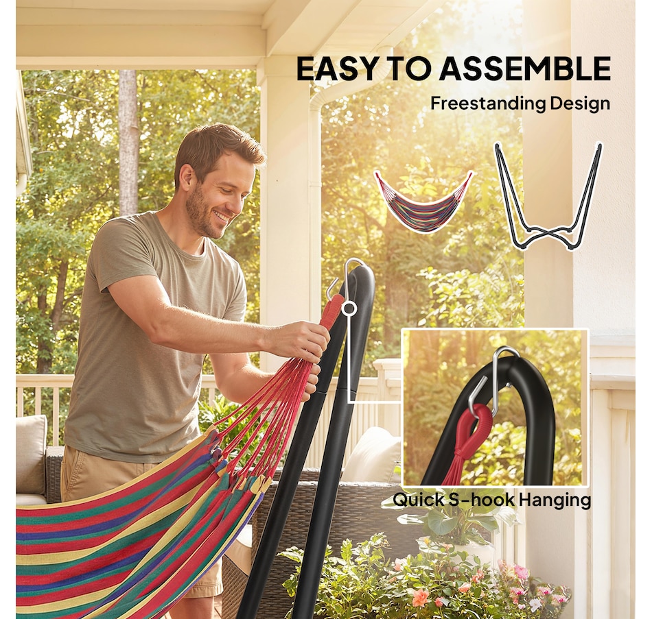Lounge in style with this vibrant hammock featuring a freestanding steel frame – no trees or walls required! Quick to hang with adjustable S-hooks, it's great for relaxing in your garden, patio, or terrace without causing any damage. Crafted from breathable, fade-resistant polyester in bold red, yellow, green, and purple tones, this single-person hammock is your cosy outdoor getaway for reading, napping, or soaking up the sun.