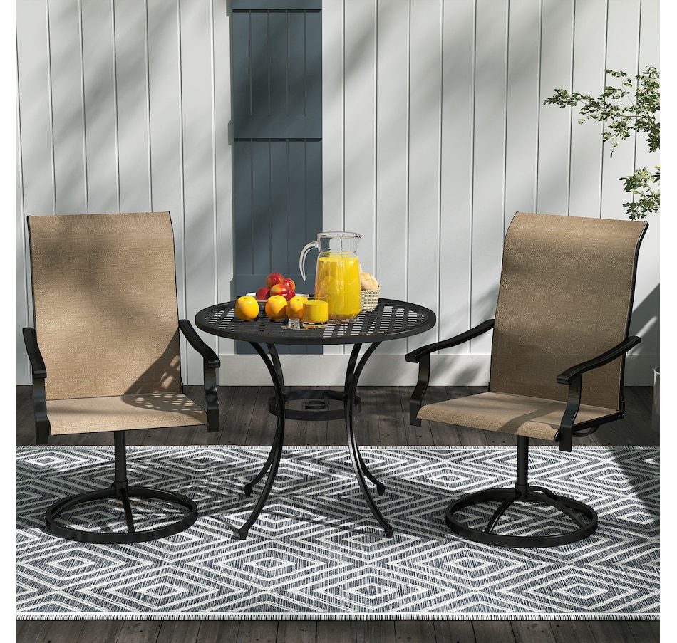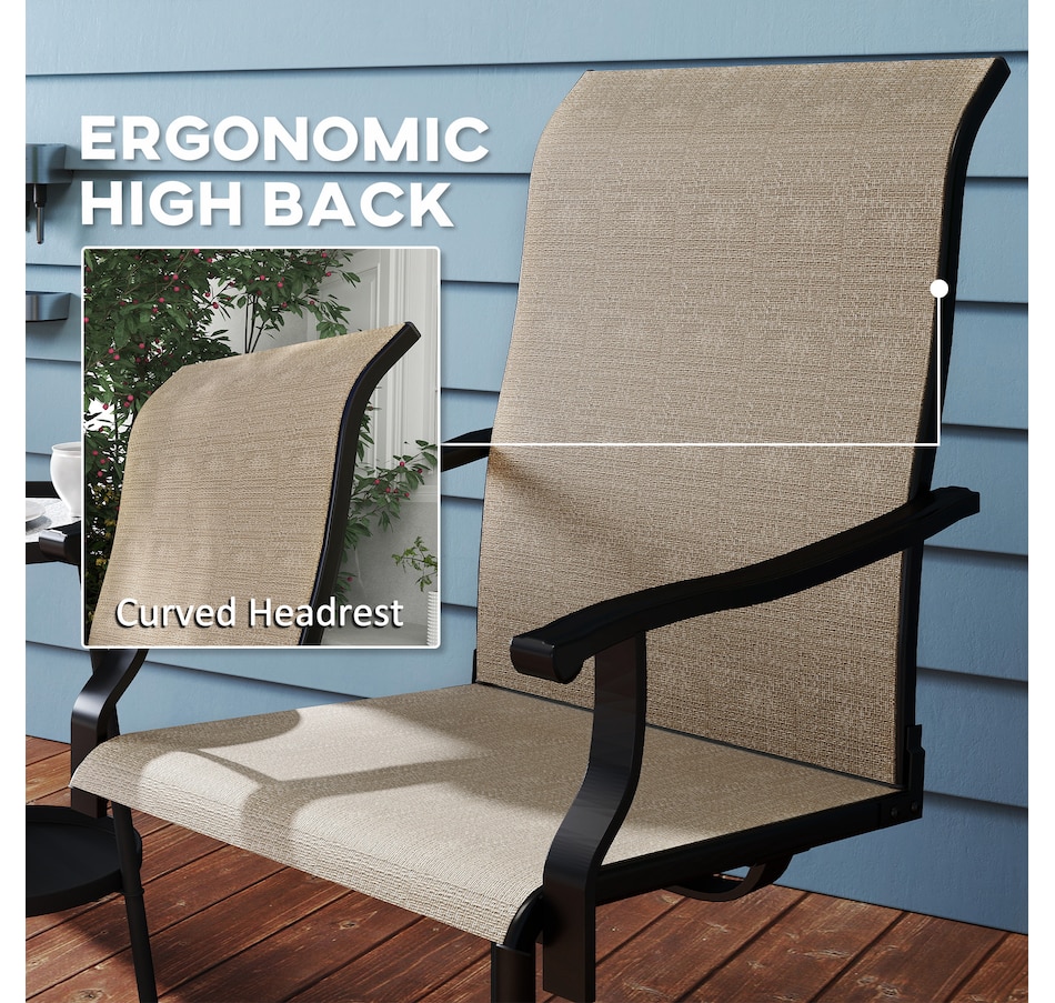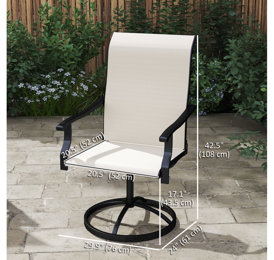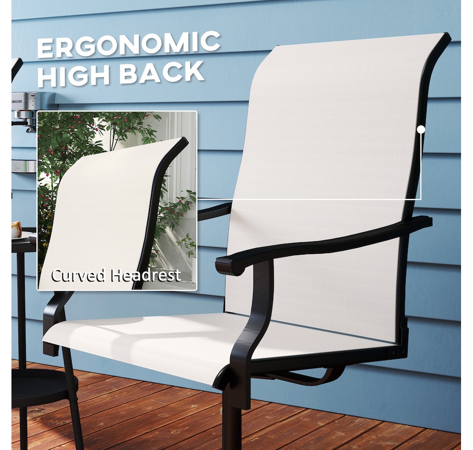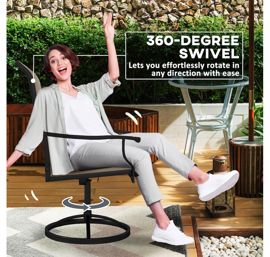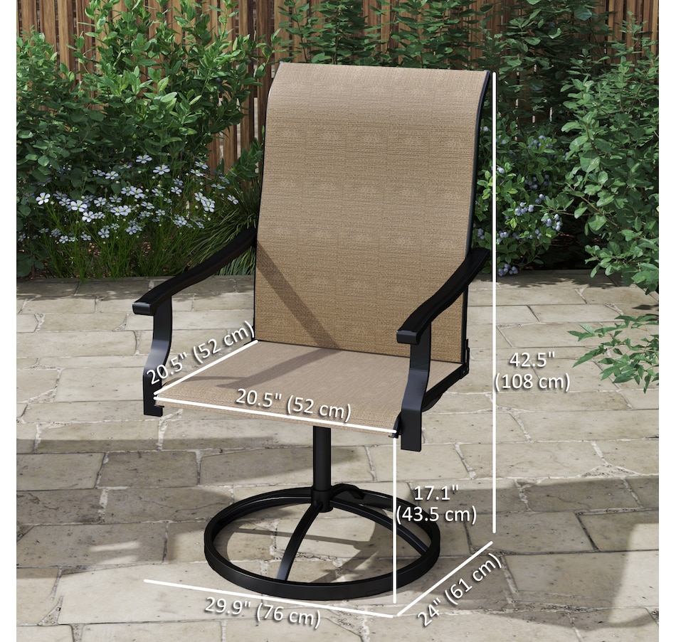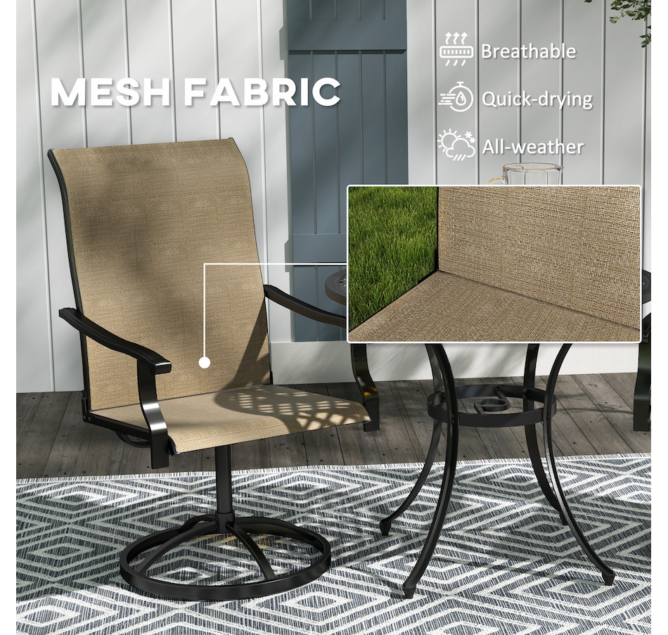 Enjoy the blend of style and function with the Outsunny swivel patio chairs! Featuring a 360° swivel for effortless movement and breathable mesh fabric for cool, all-day comfort, the outdoor chairs will be your new outdoor favorite. Weather-resistant and easy to clean, it's built for patios, porches, or poolside lounging. Relax, chat, or soak up the sun—these outdoor swivel chairs have everything you need for unbeatable outdoor vibes!