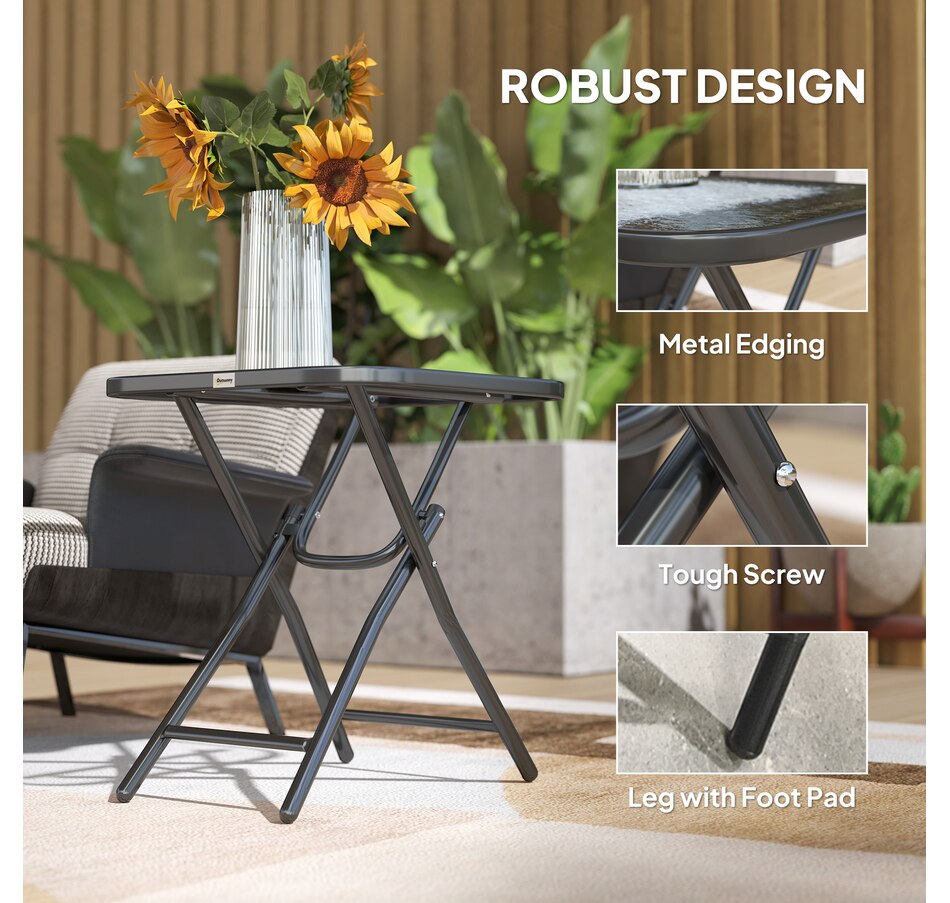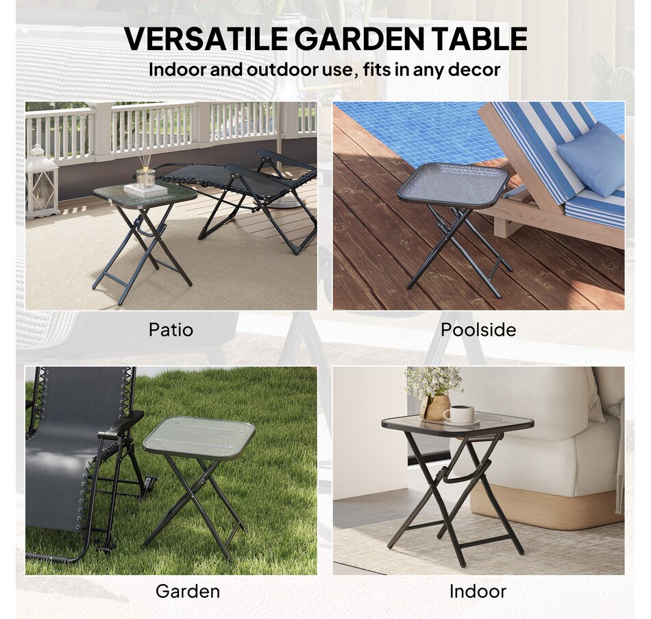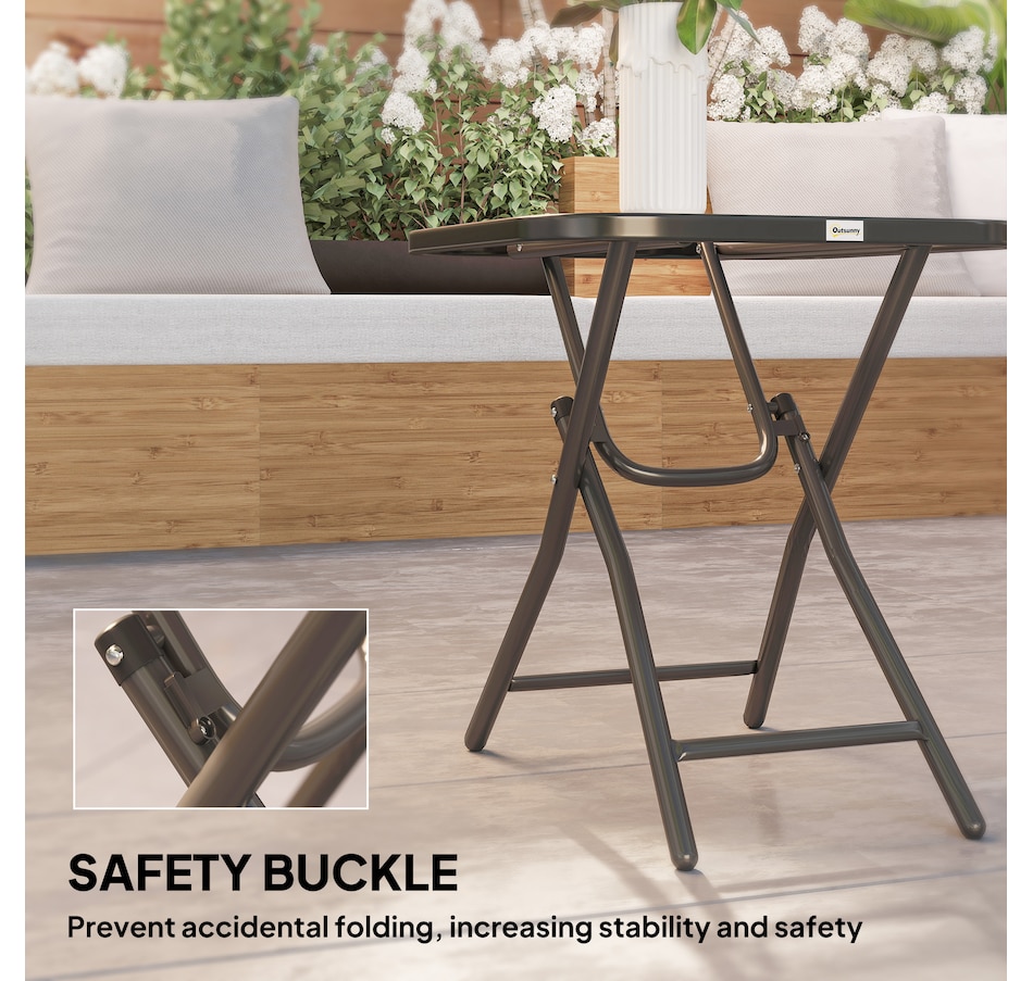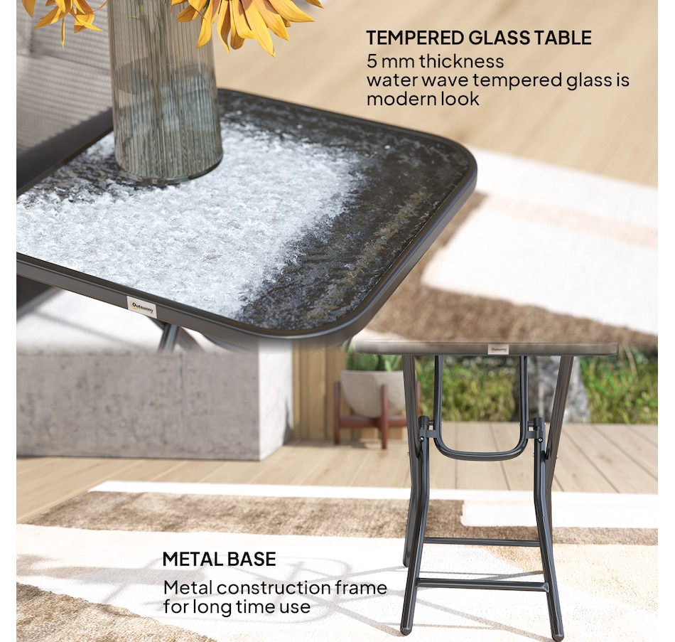 For a unique addition to your garden furniture, choose this beautiful outdoor patio table from Outsunny. Made with a robust and strong metal frame, it features a beautiful water ripple tempered glass table top which is stain resistant and easy to clean. With safety buckle to prevent accidental folding, increasing stability in use. It's suitable for dining and relaxing with friends elegantly all day long.