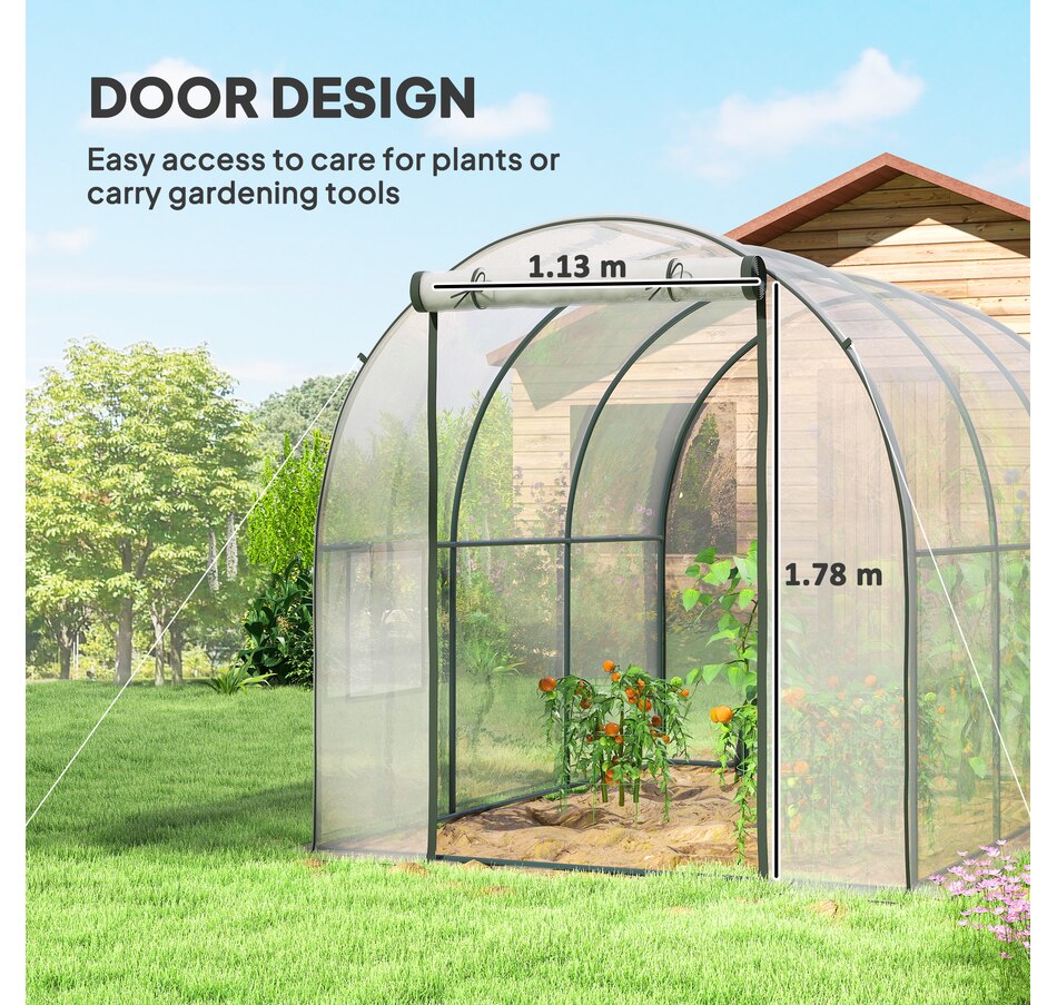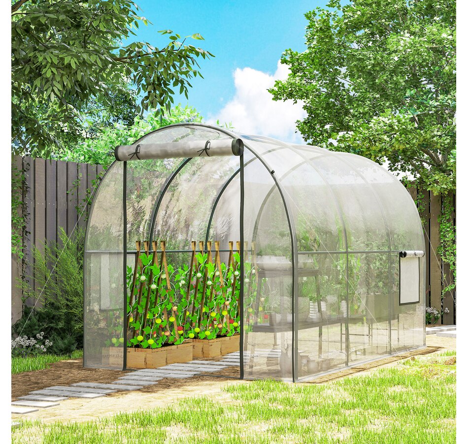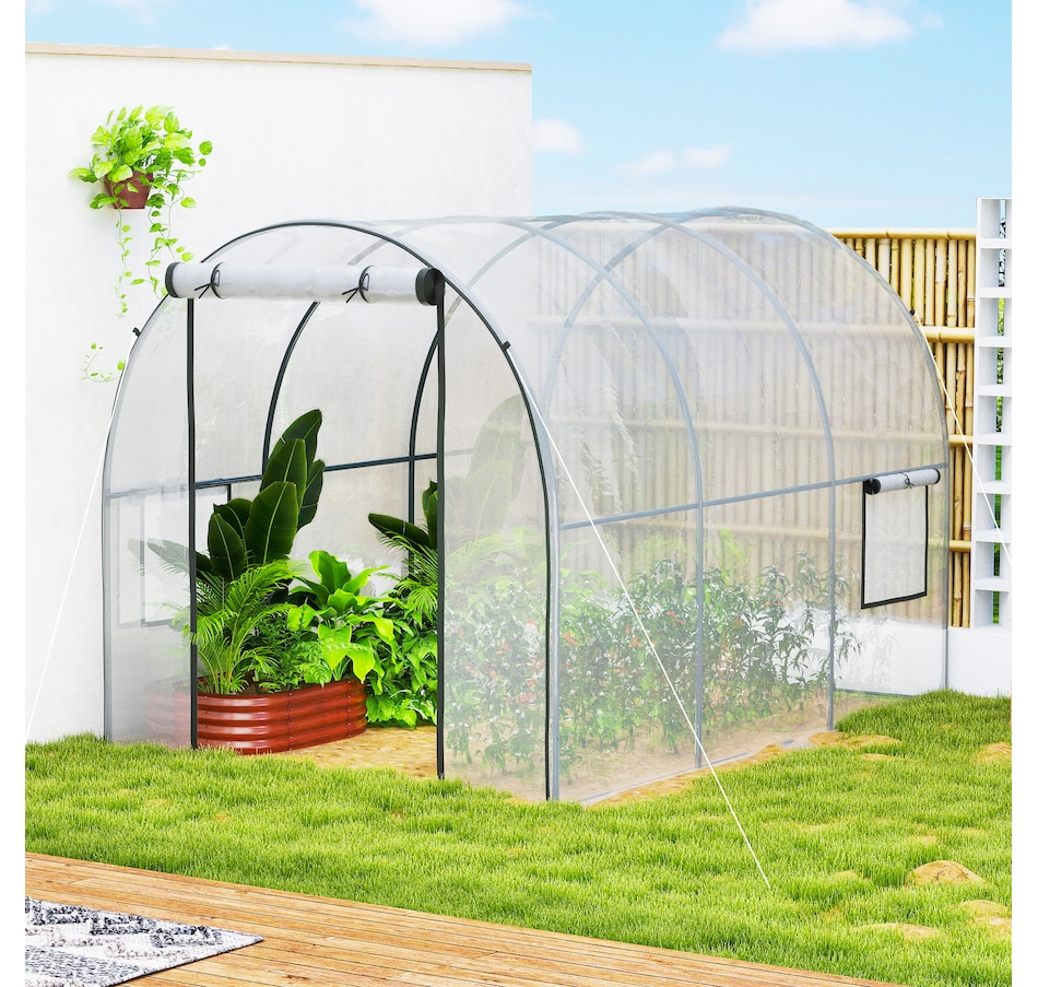 Get growing all year round, thanks to this Outsunny 3 x 2m greenhouse. A steel frame means a strong core, made into an arched polytunnel shape - plenty of growing room. The clear plastic cover creates safe shelter, whilst allowing sunlight to pass through for growth. Complete with roll up door for easy access and mesh windows to bring air inside.