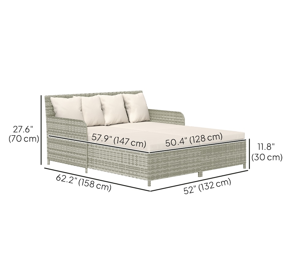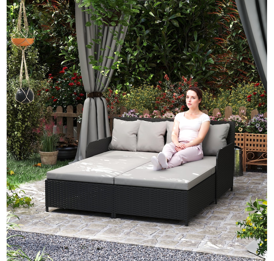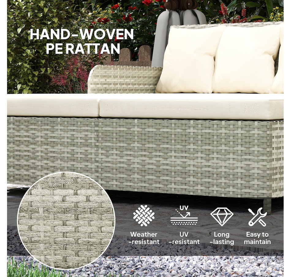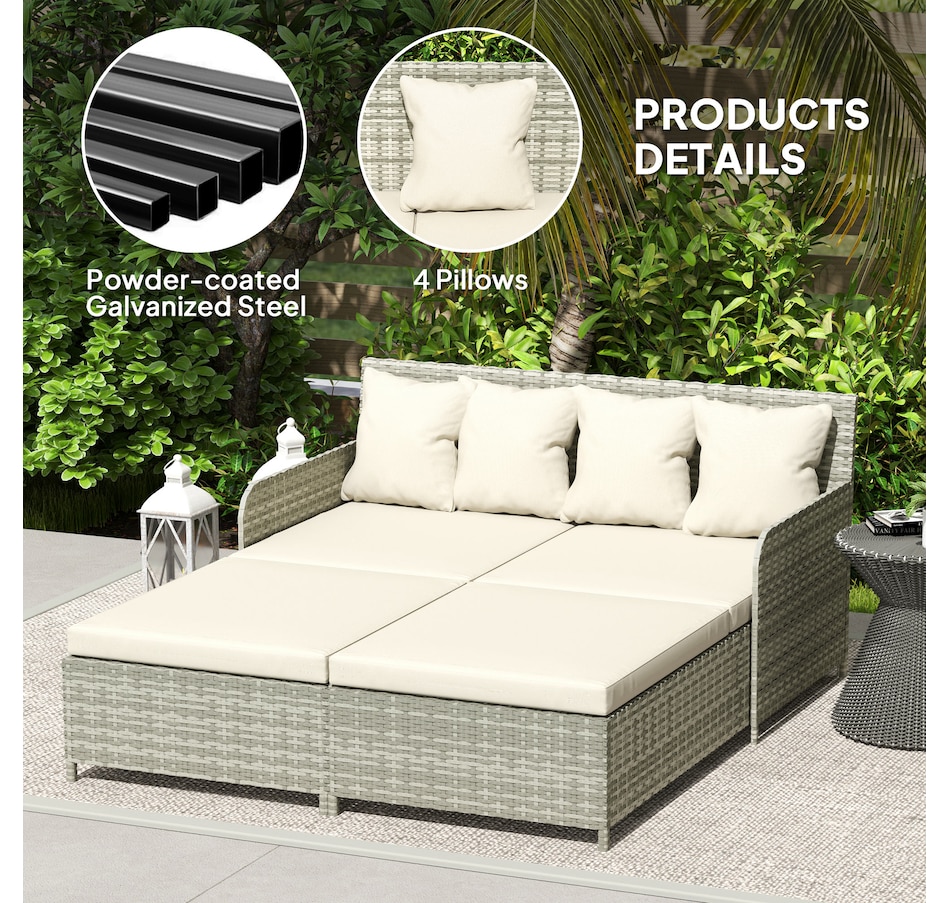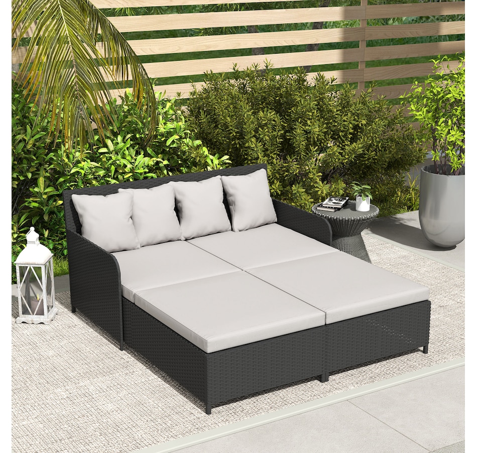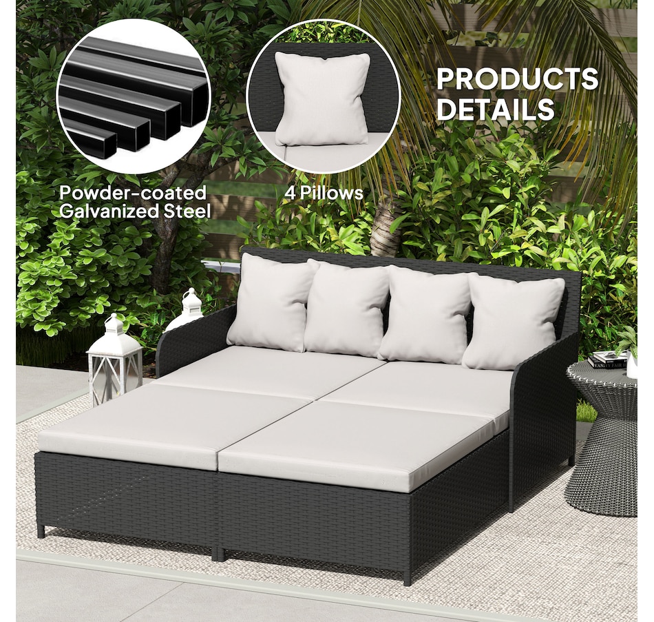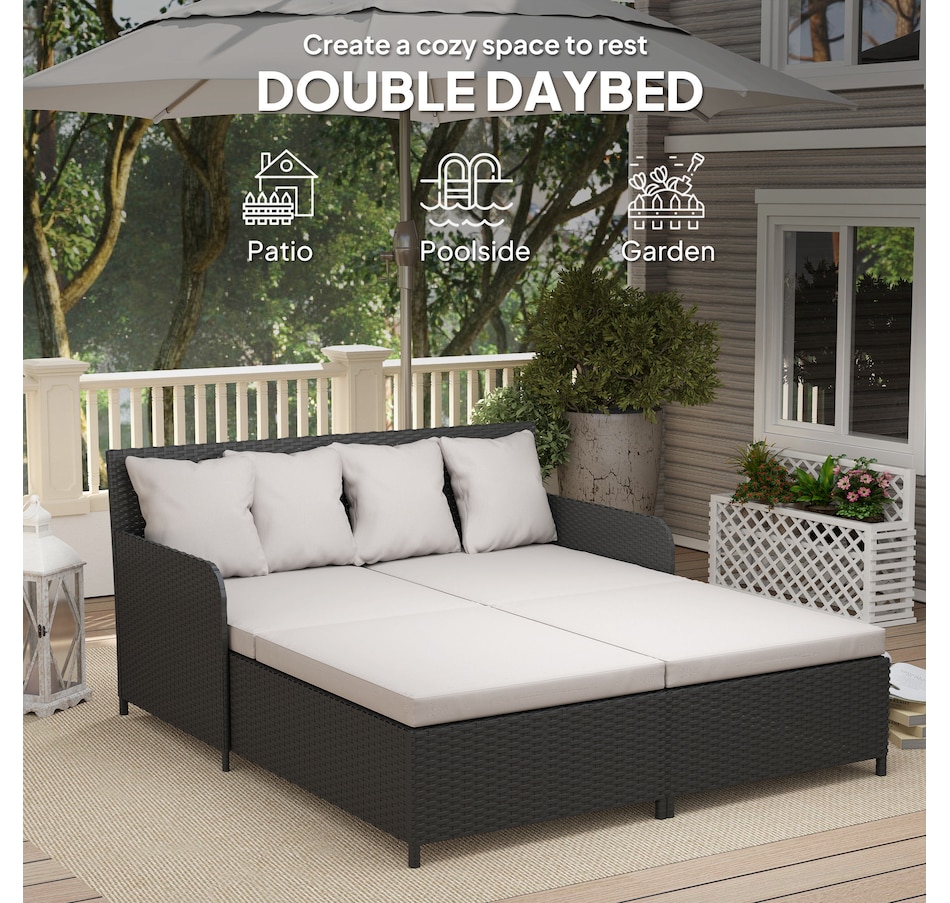 Transform your outdoor space into a cosy oasis with the Outsunny Rattan Double Bed. Featuring a high backrest and armrests for superior comfort, this patio daybed includes four zippable pillows that mould perfectly to your body. Its PE rattan and steel frame ensure endless summers of relaxation in your garden, by the pool, or on your deck.Features: