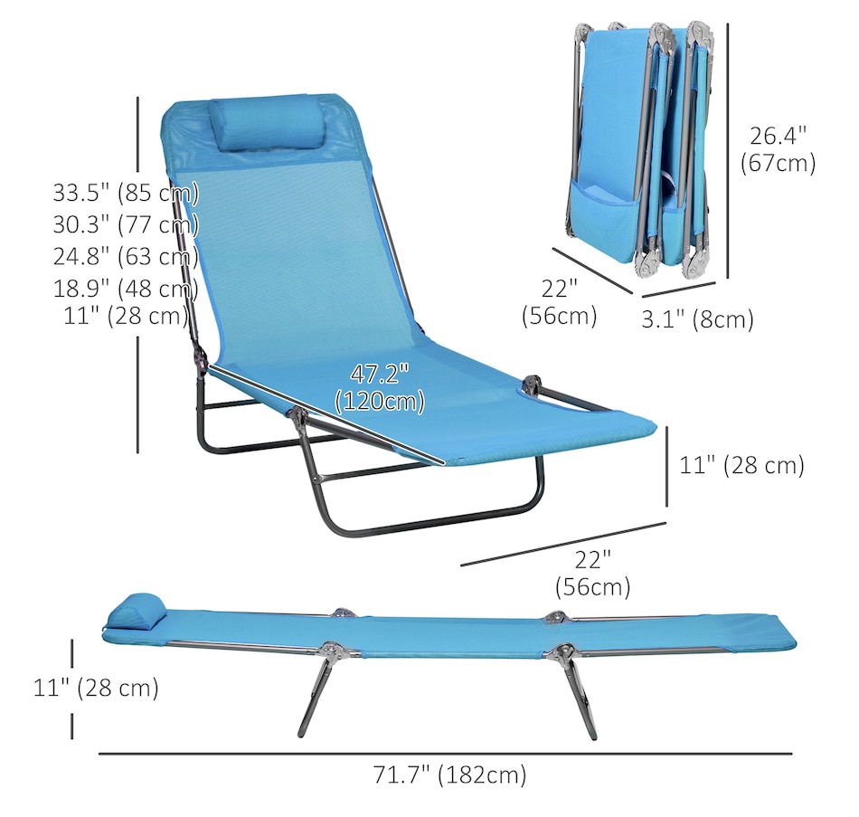 ● Fully Reclined Dimensions: 22" W x 71.7" D x 11" H (56 x 182 x 28 cm);