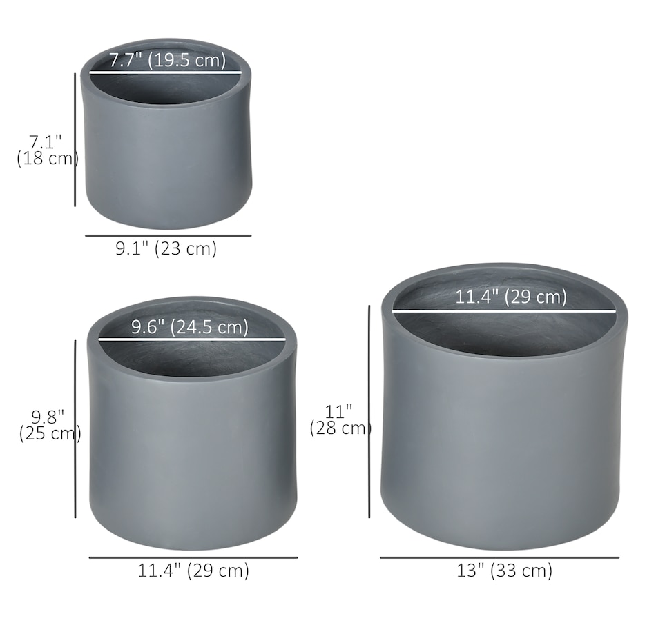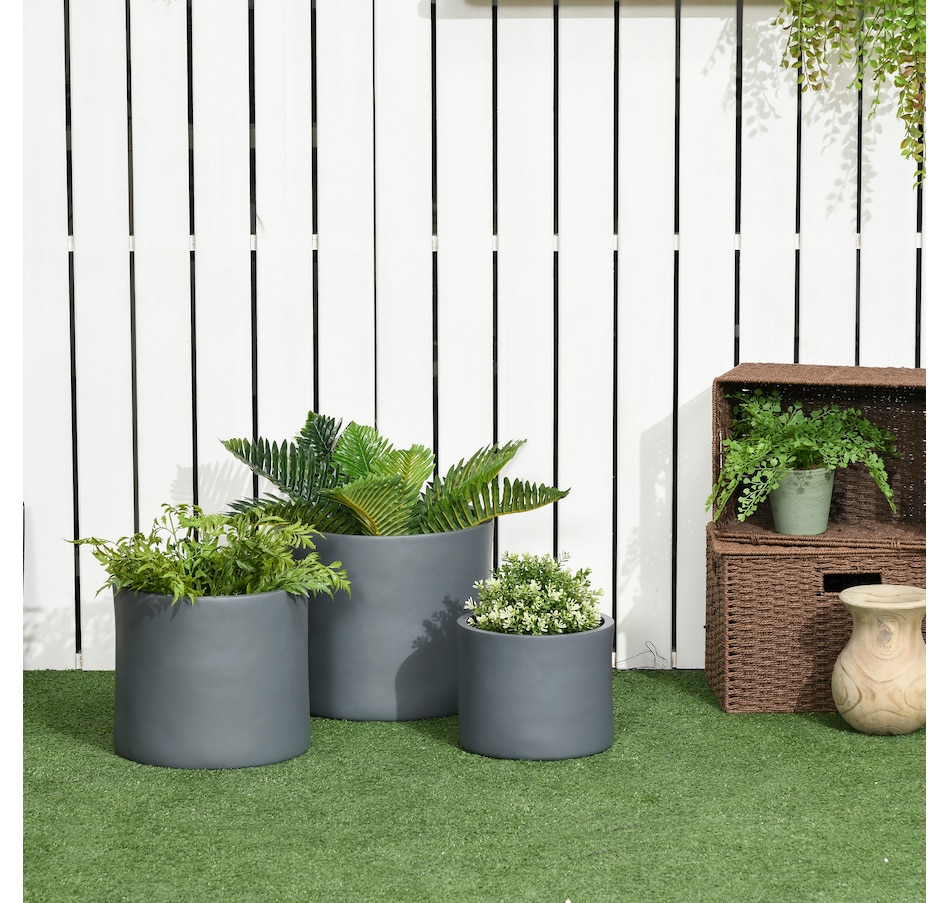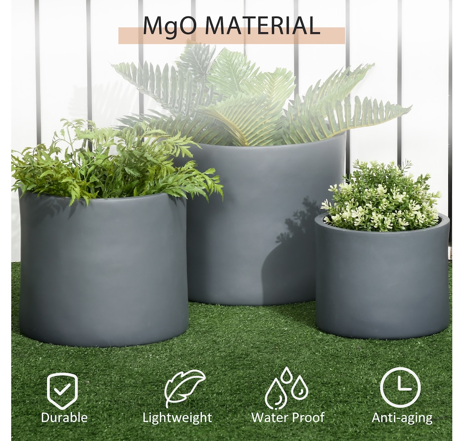 Brighten your garden with the Outsunny Outdoor Planters! This trio of planters for outdoor plants comes in 13, 11.5, and 9-inch sizes, crafted from weather-resistant magnesium oxide. Their stackable design ensures easy storage, while the drainage holes keep your blooms fresh. Suitable for any outdoor plant pots arrangement!