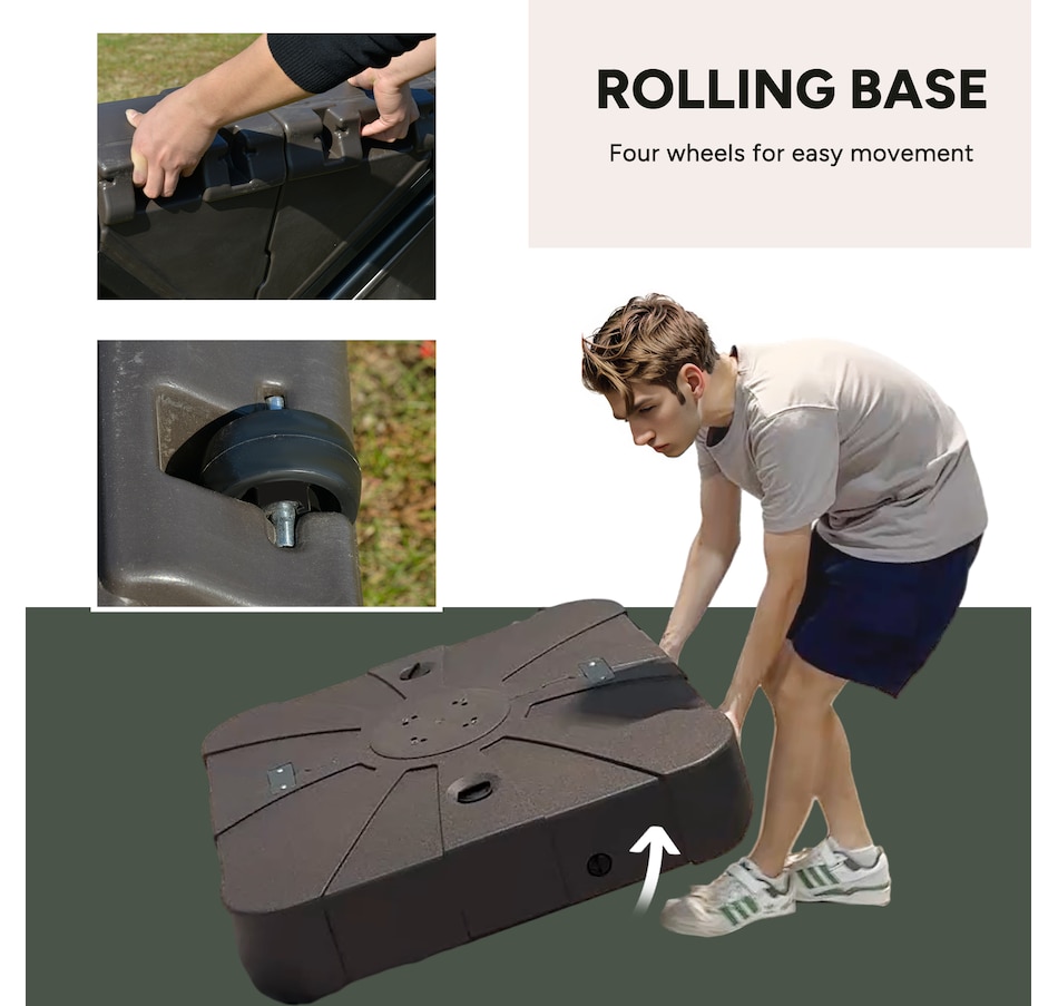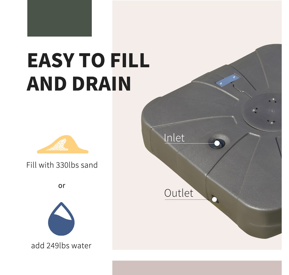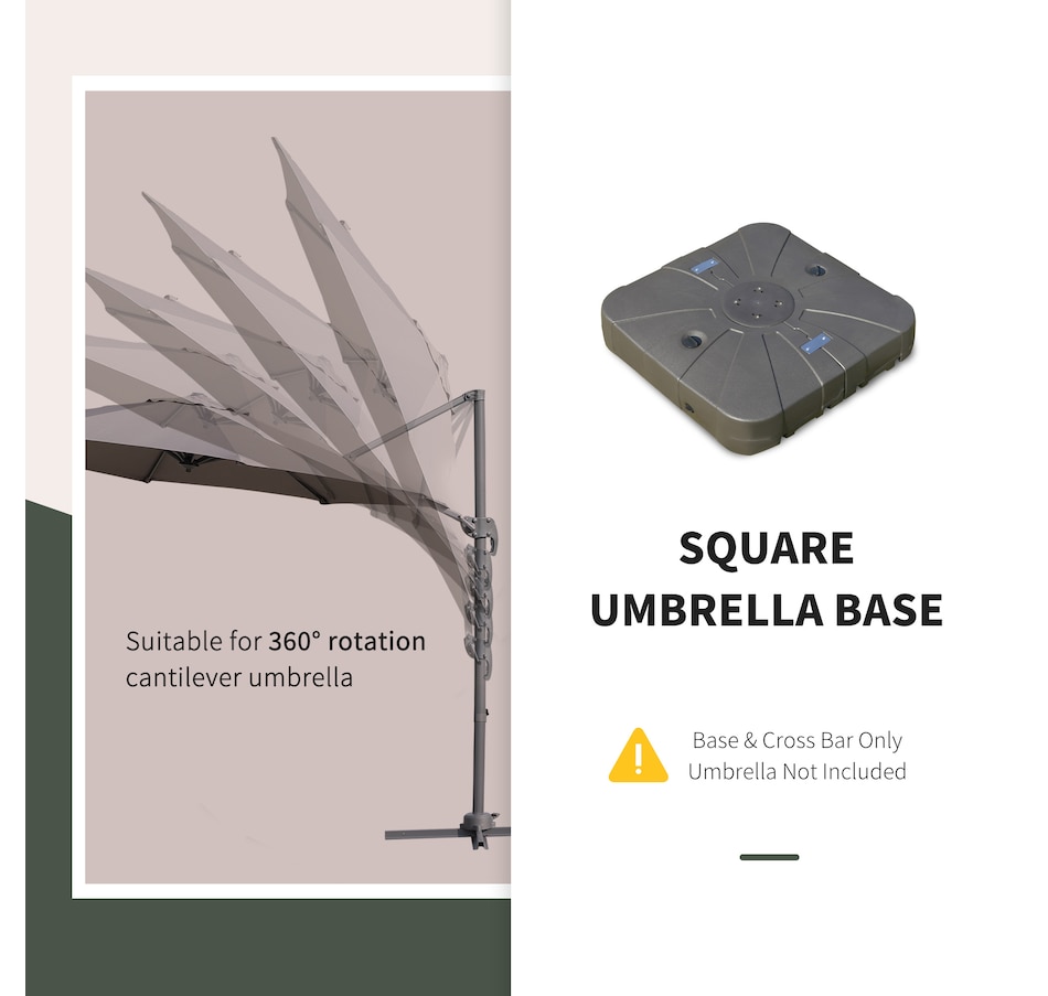 Do you want a sturdy and durable patio umbrella stand to hold your cantilever umbrella in place? Our umbrella base with cross bar is a good choice. It is suitable for 360° rotation cantilever umbrellas. And this cantilever umbrella base can be filled with sand or water to ensure the stability. Equipped with 4 smooth wheels for easy movement. You can enjoy a pleasant afternoon on the patio, courtyard, porch, garden, and poolside with this fillable umbrella base.