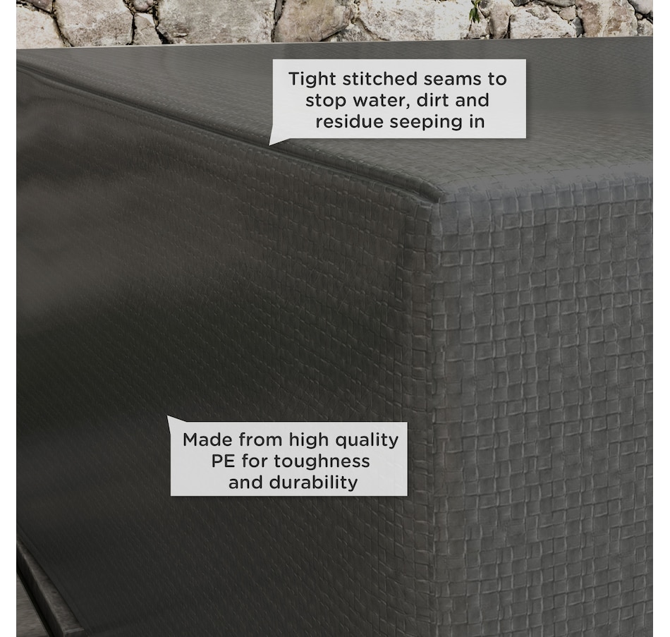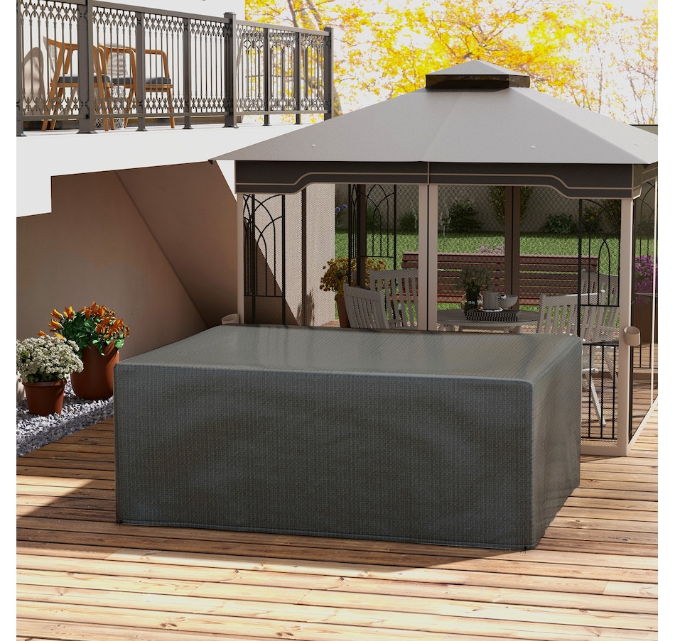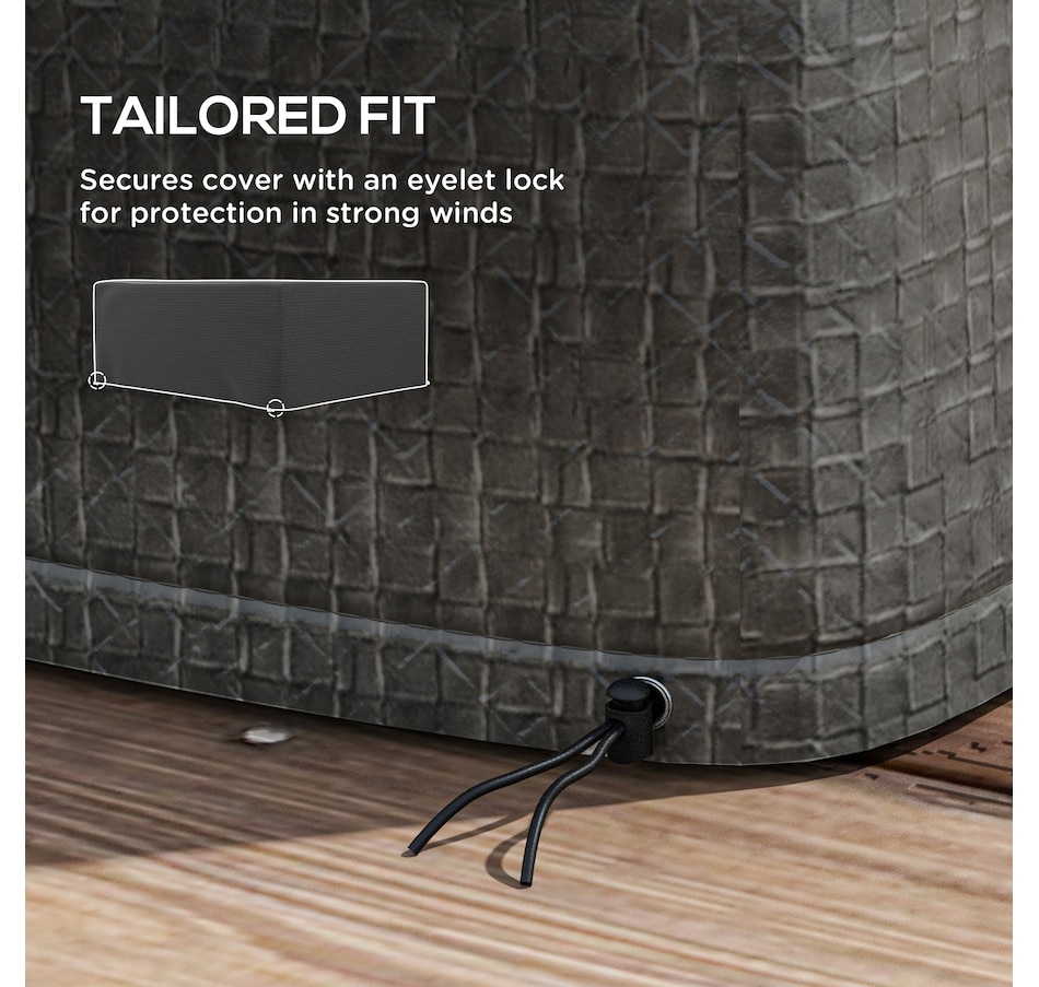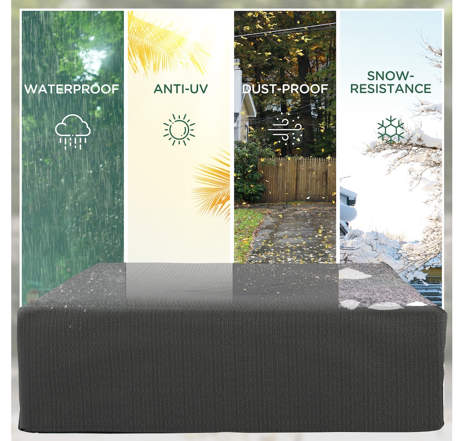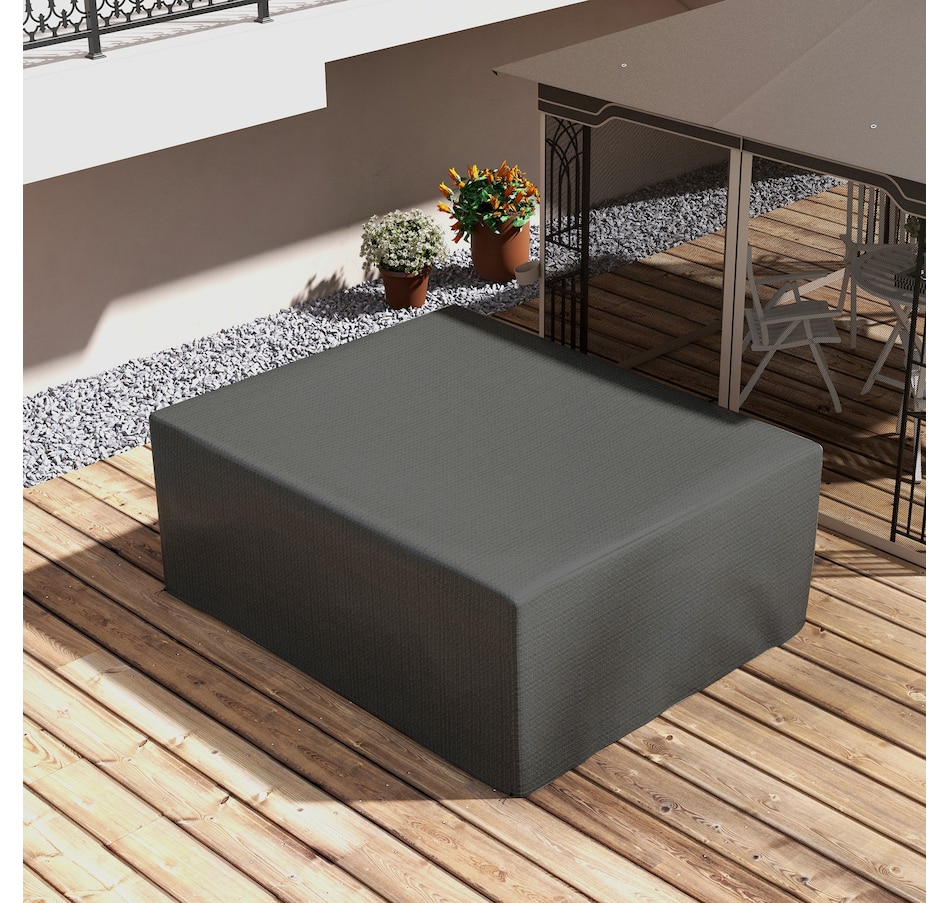 Great your outdoor furniture from harsh weather with a robust sectional cover from Outsunny. Crafted with heavy-duty plastic, it features tightly stitched seams to prevent water or residue from seeping underneath. A drawstring and cord lock keep it secure against strong winds, while the surface is treated with a top coat protecting against UV rays. At 93" x 75", this cover fits square, rectangle, and oval-shaped furniture effortlessly.