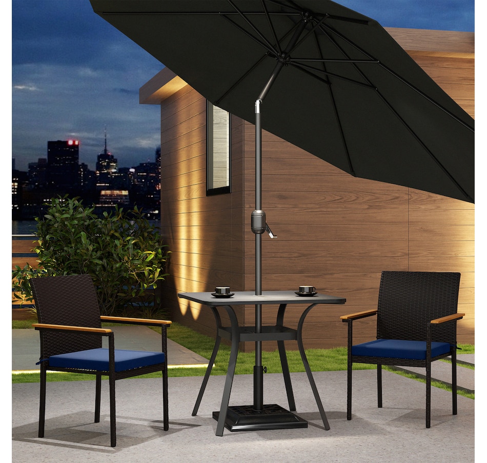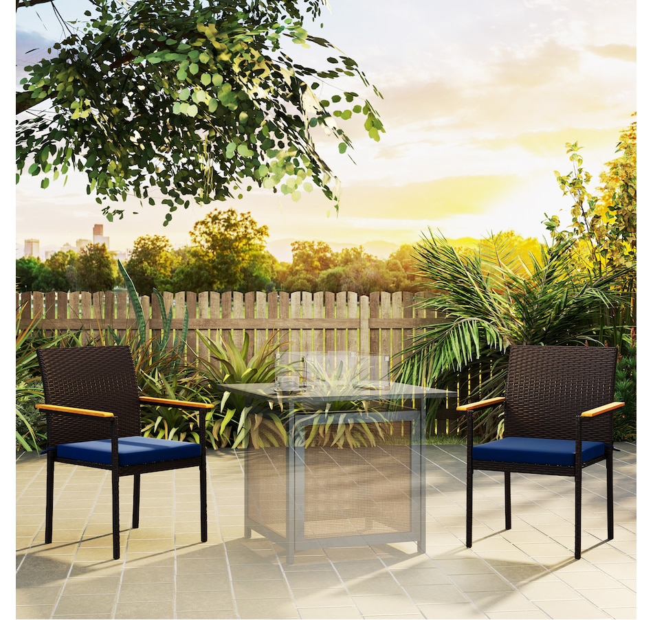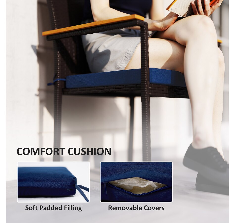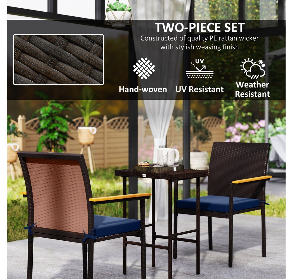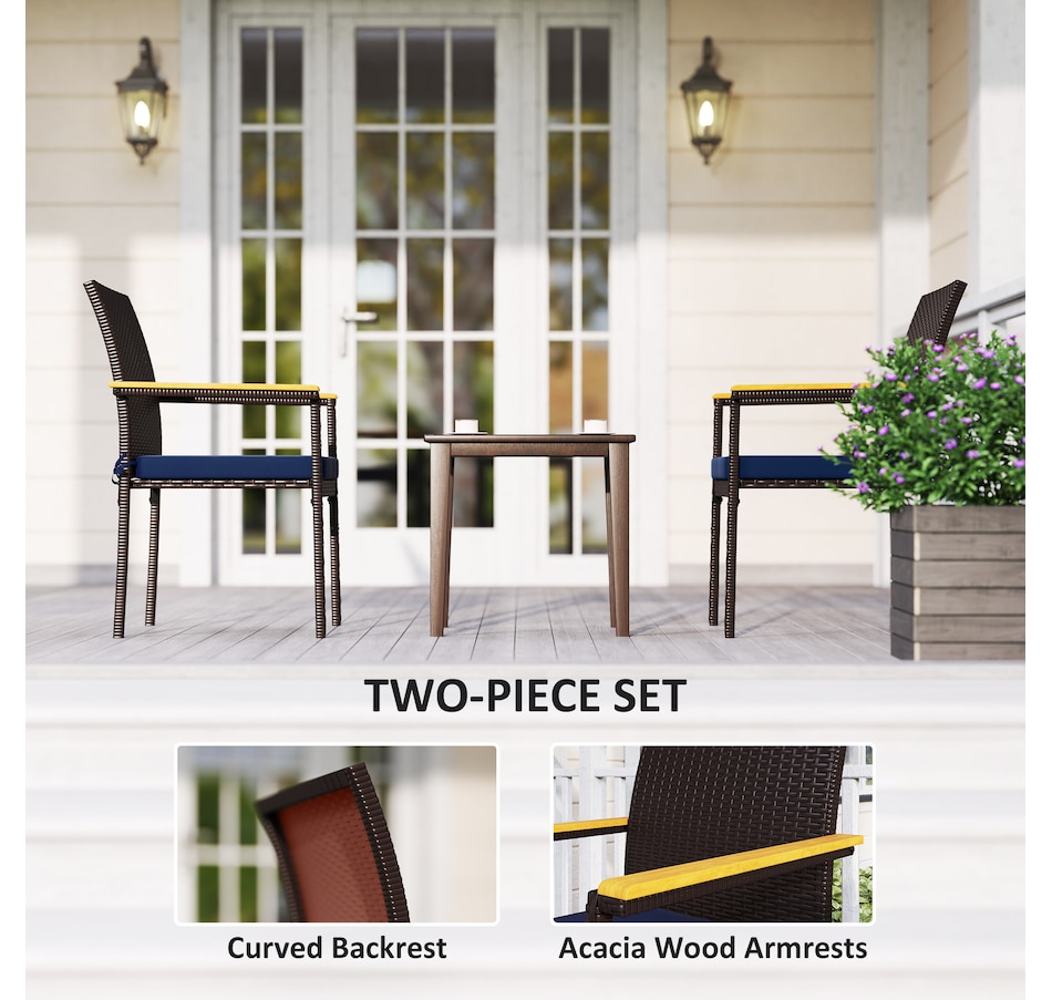 Elevate your outdoor dining experience with the Outsunny outdoor chairs! These balcony chairs feature comfy acacia wood armrests and a stackable design for easy storage. Enjoy the cushions with washable covers and the hand-woven PE rattan that resists water and UV rays. They are suitable for any patio or deck setting.Features: