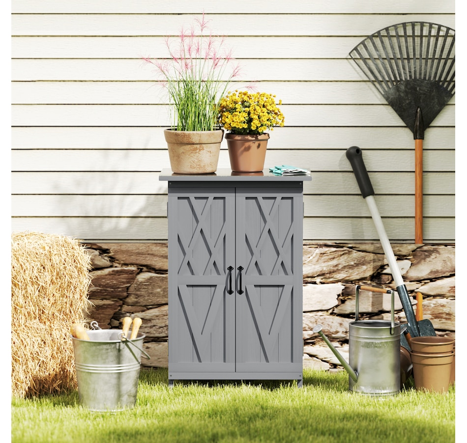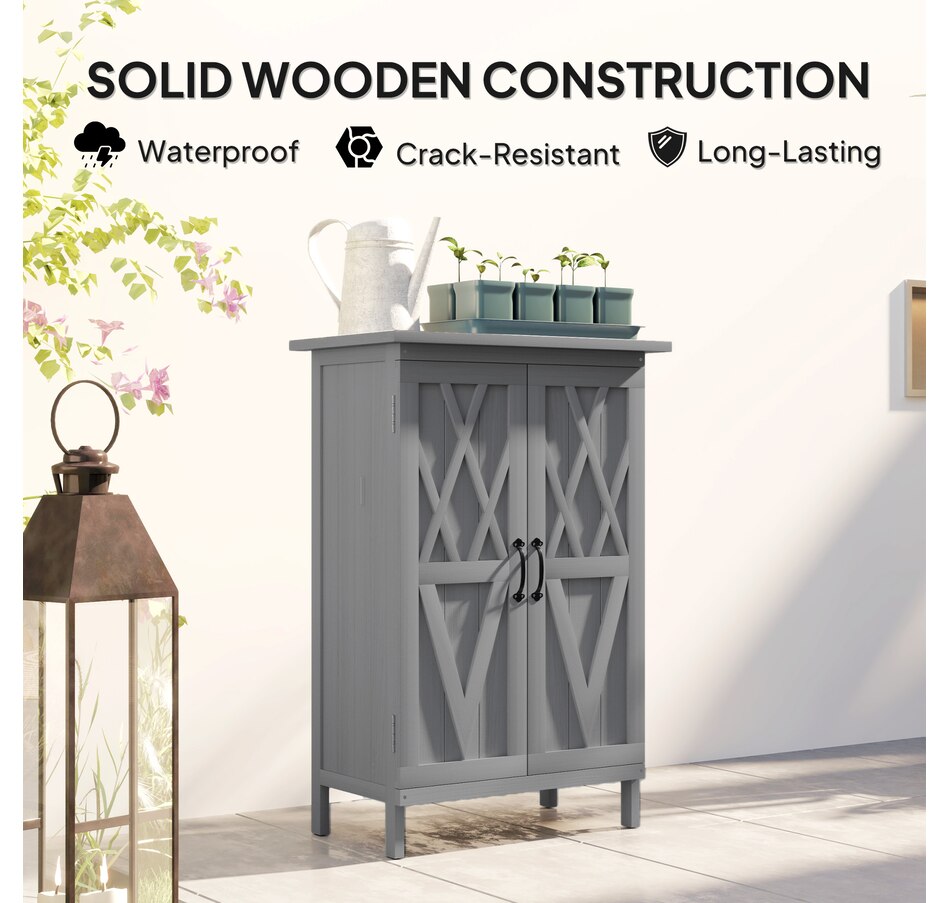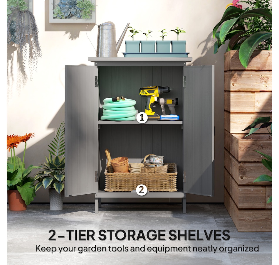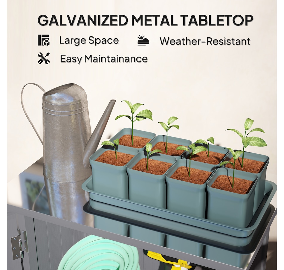 Transform your gardening game with the Outsunny Shed, doubling as a potting bench table. Its built-in shelf keeps tools tidy, while the flat, galvanized top is a dream for potting plants. Magnetic doors with metal handles secure your gear in style in this chic wood shed, enhancing any outdoor space. The painted finish protects and perfects this outdoor storage cabinet.Features: