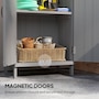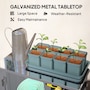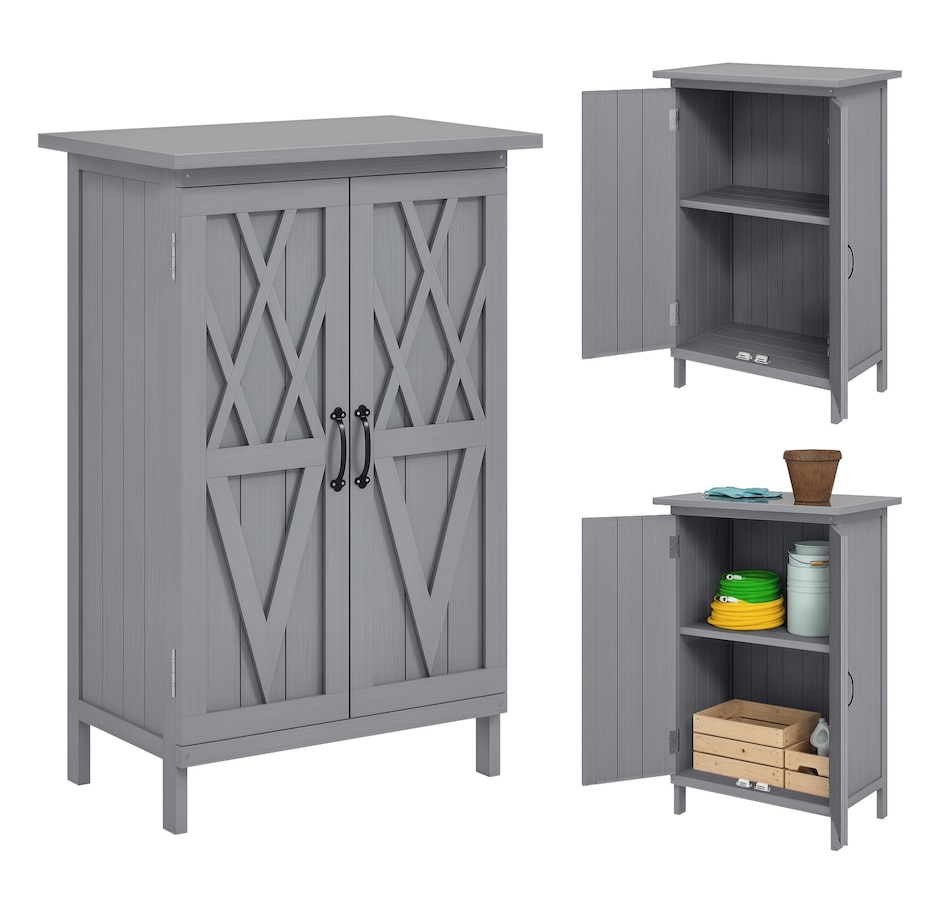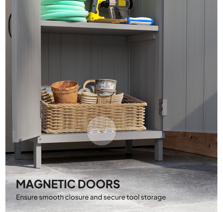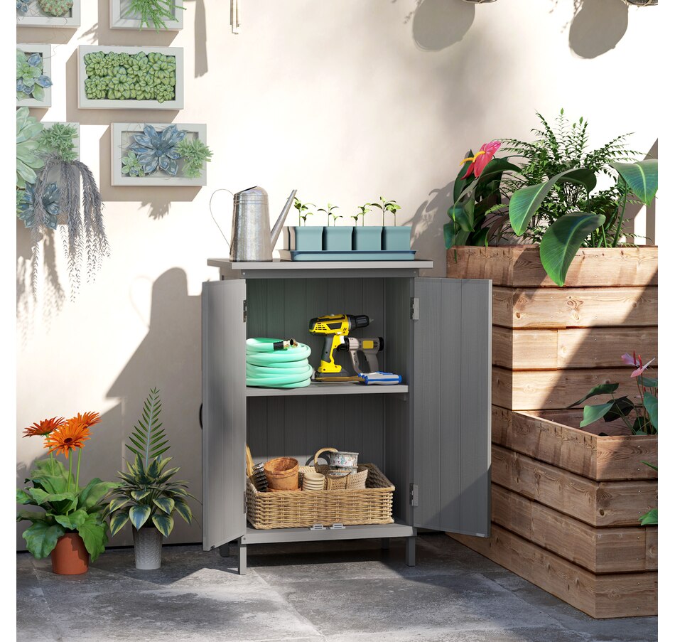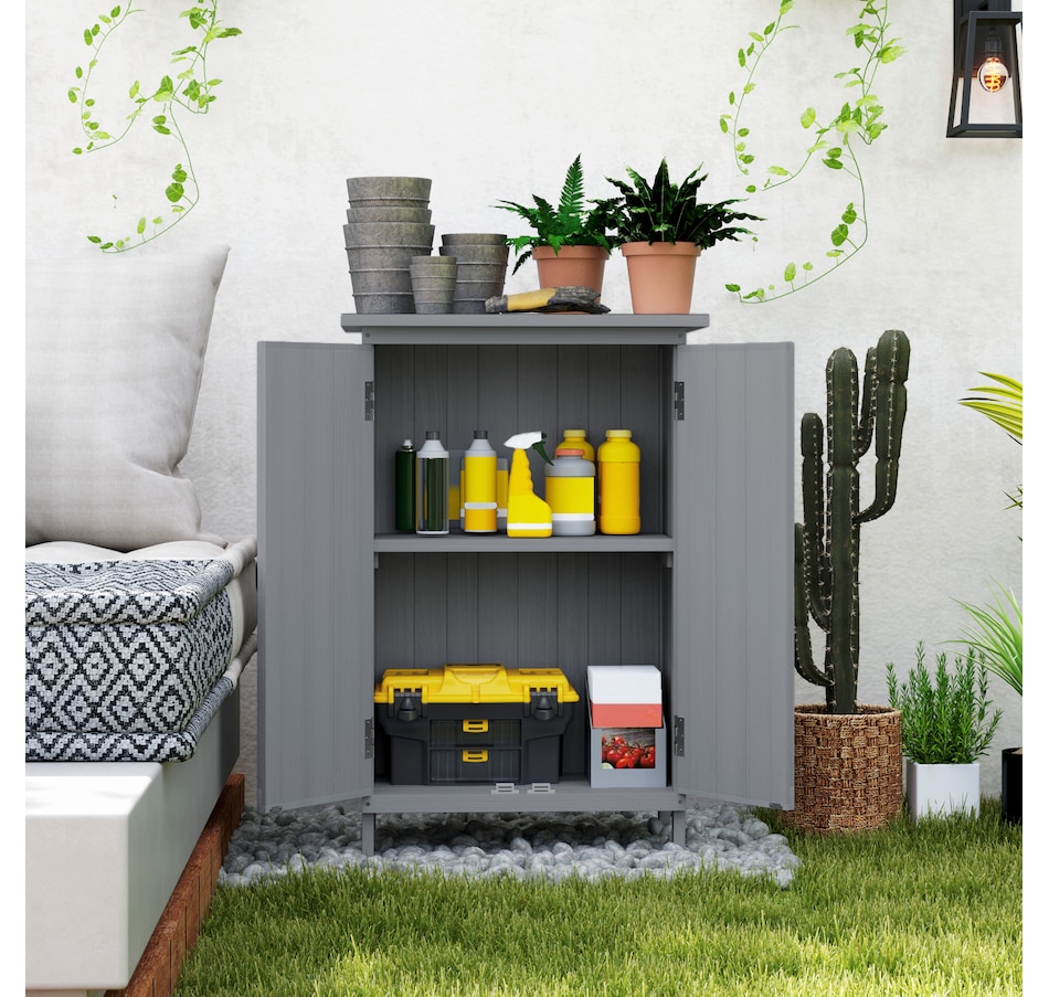 Transform your gardening game with the Outsunny Shed, doubling as a potting bench table. Its built-in shelf keeps tools tidy, while the flat, galvanized top is a dream for potting plants. Magnetic doors with metal handles secure your gear in style in this chic wood shed, enhancing any outdoor space. The painted finish protects and perfects this outdoor storage cabinet.Features: