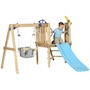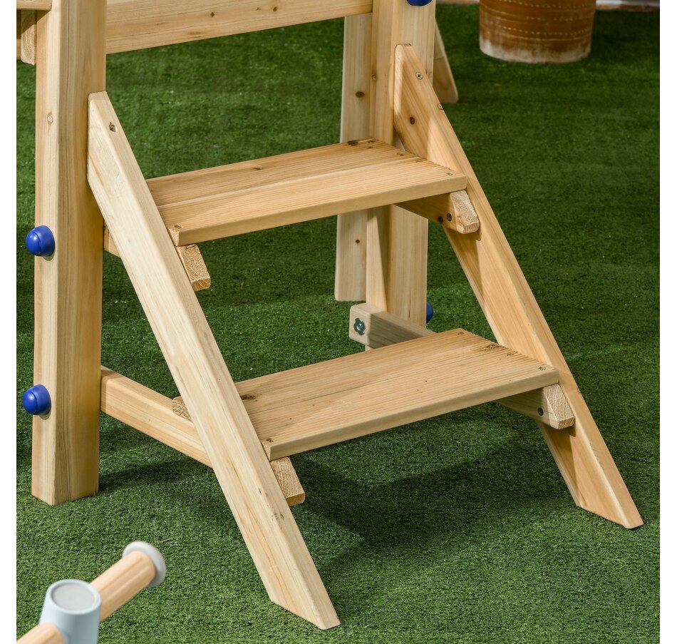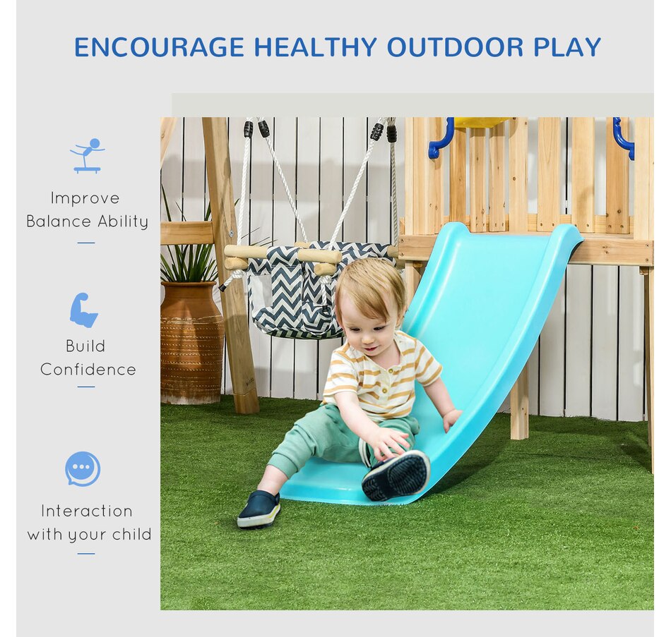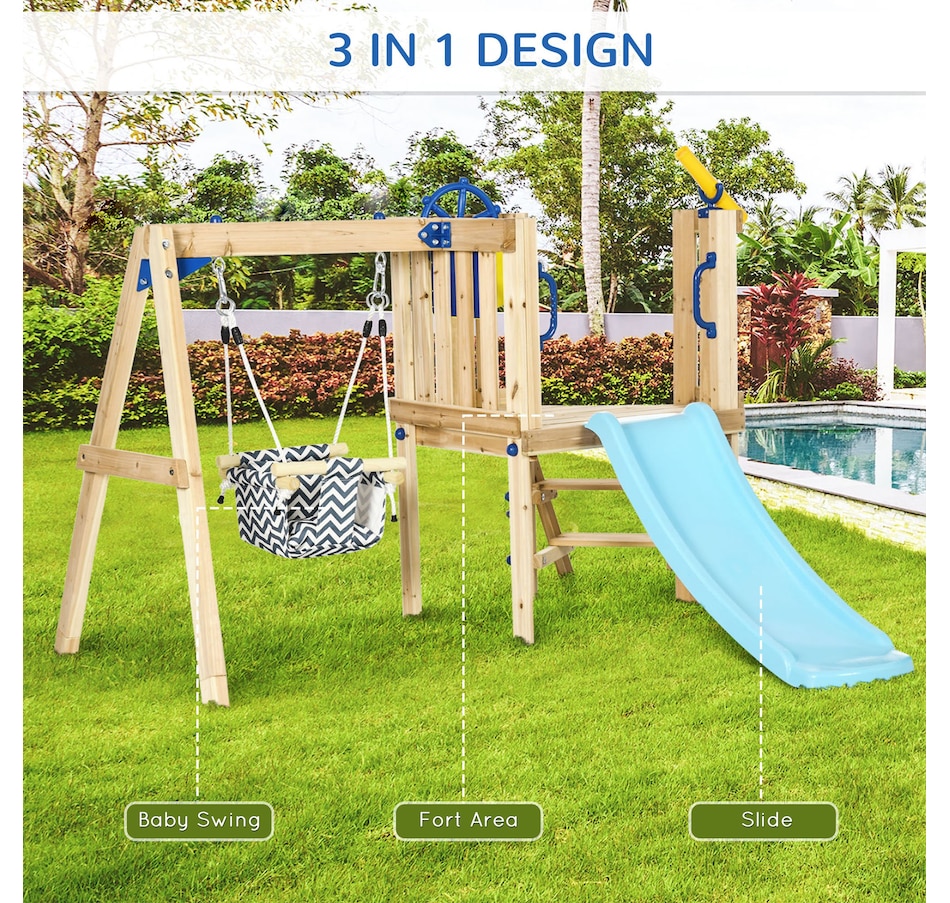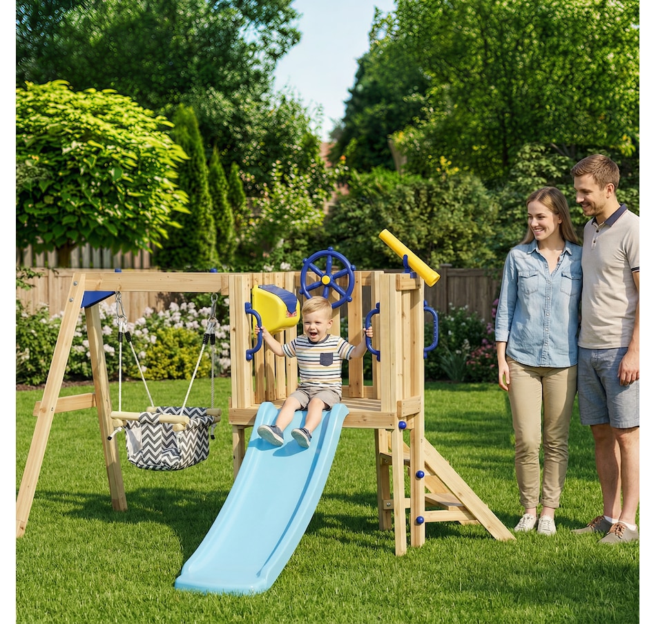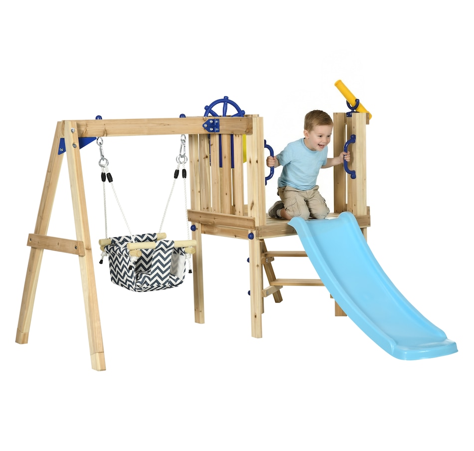 Transform your backyard into a fun play zone for your child with the compact Outsunny swing set with slide, swing, and fort. This mini wooden swing set has several play features for kids, such as a captain's wheel, telescope, and mailbox. Able to withstand 220 lbs. (100 kg), the toddler swing set makes it easy for your child to enjoy playtime with their friends. All this combined means that this playscape for the backyard allows kids set sail on endless adventures for hours of imaginative fun.