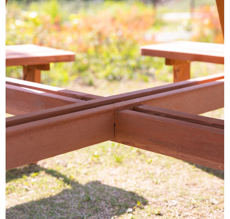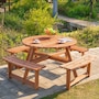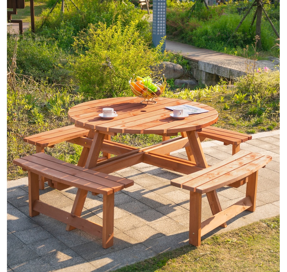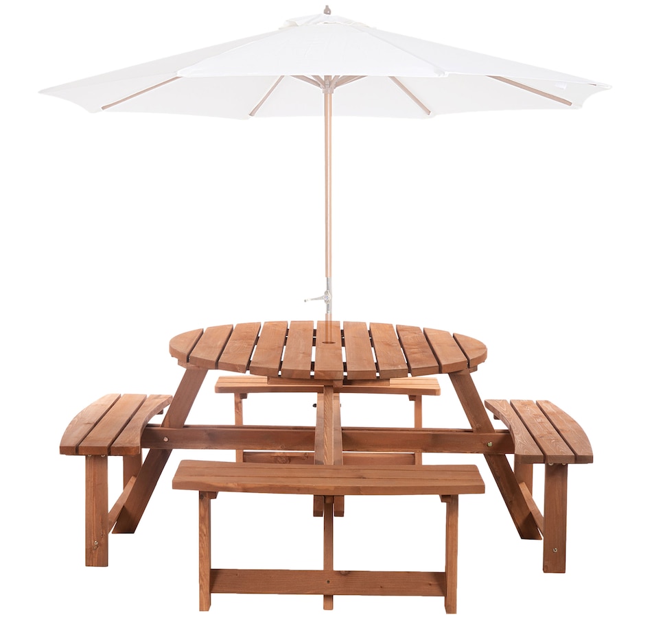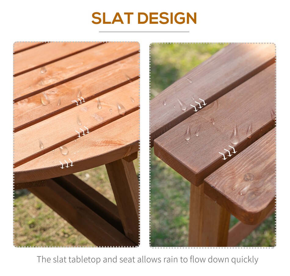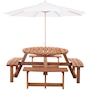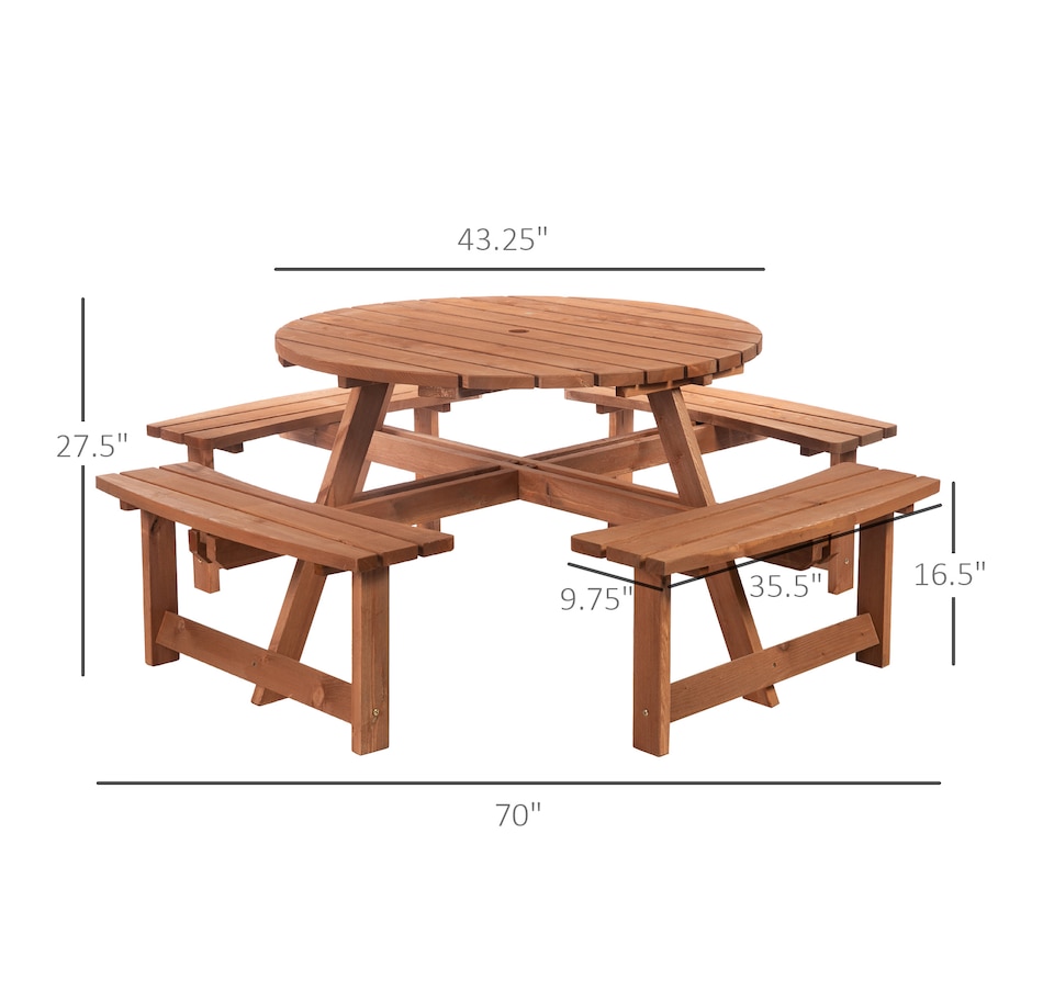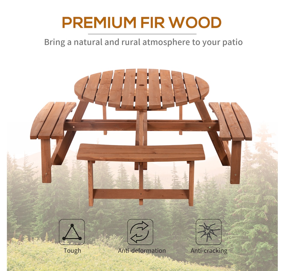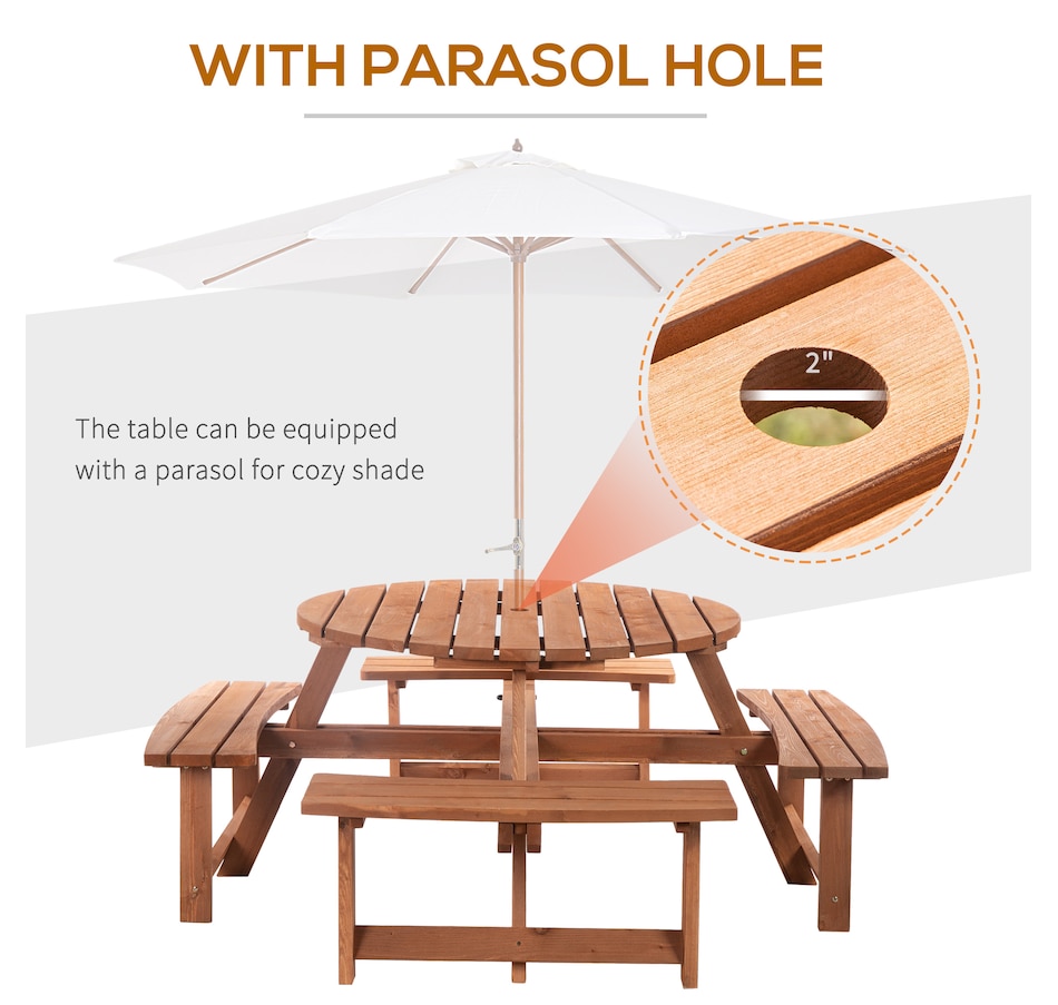 This Outsunny wooden bench set is a versatile addition to any outdoor setting, accommodating up to 8 people comfortably. Its circular design provides ample room for easy movement and enjoyment of the space. A precision-cut hole in the middle allows parasol installation, providing shade options in the summertime. The outdoor patio furniture features fir wood construction for added strength and stability, with smooth edges and a weight capacity of 500 lbs. for table and 500 lbs. for bench.