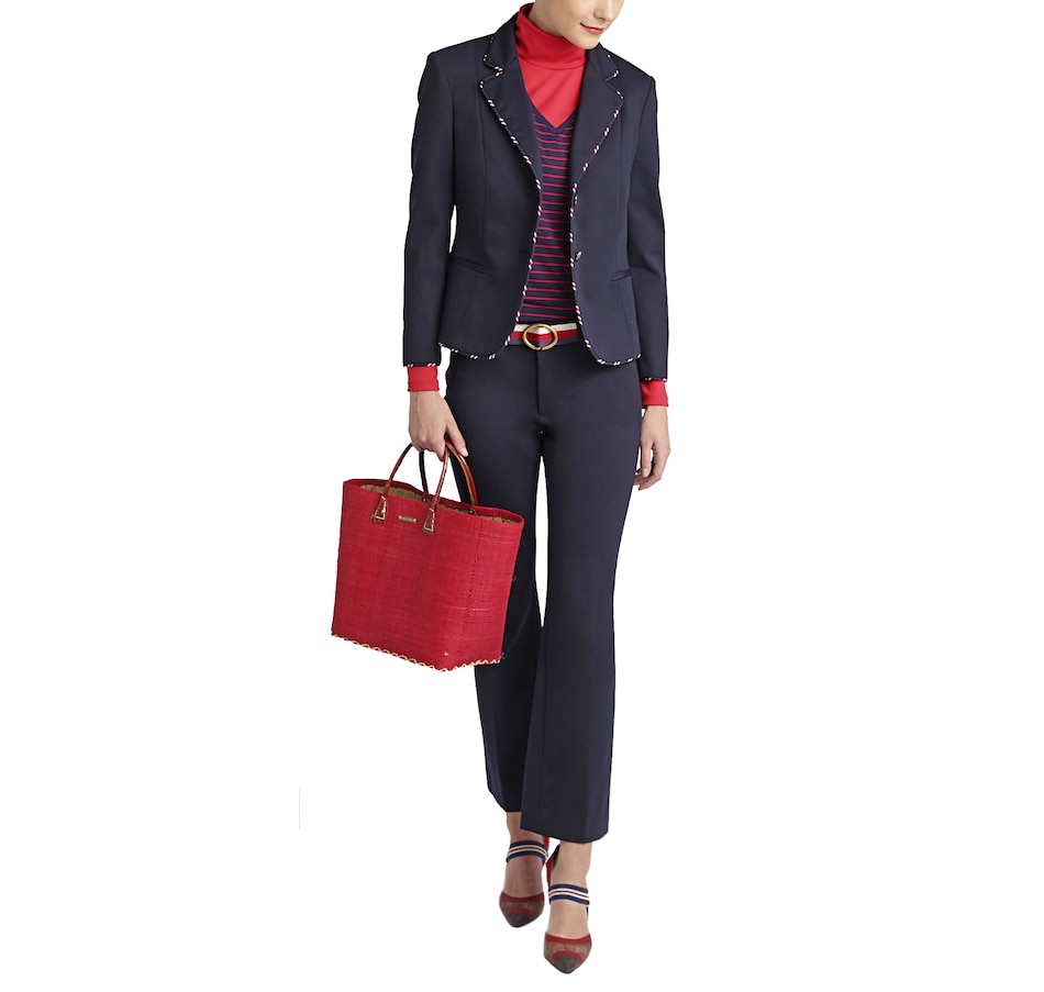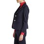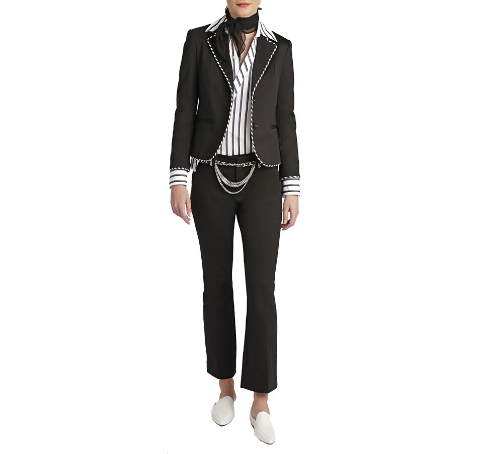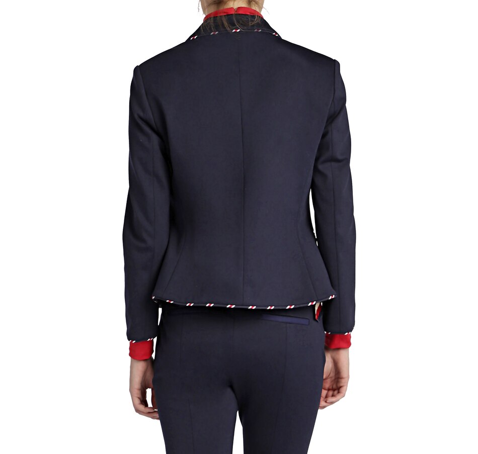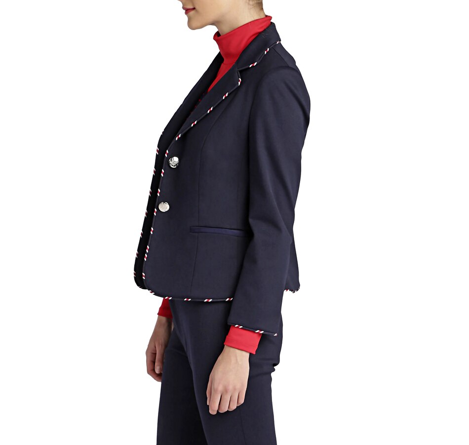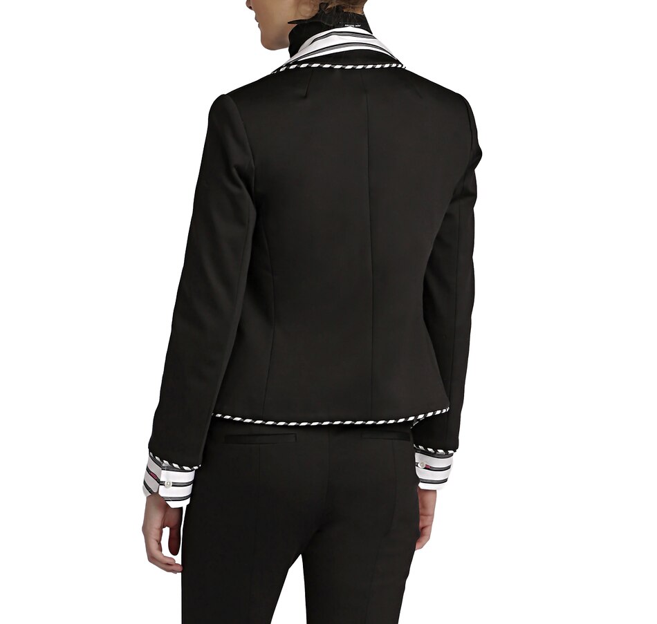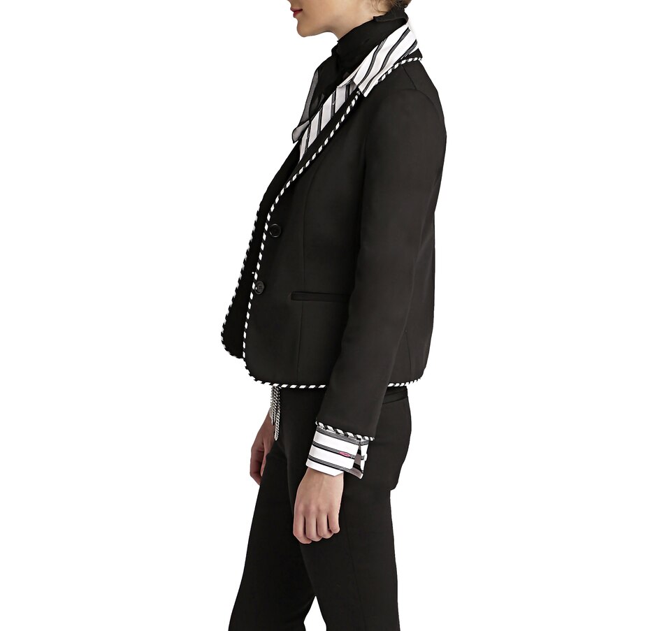 • Stripe AOP piping, long sleeve, button front, lined, shoulder pads, pockets