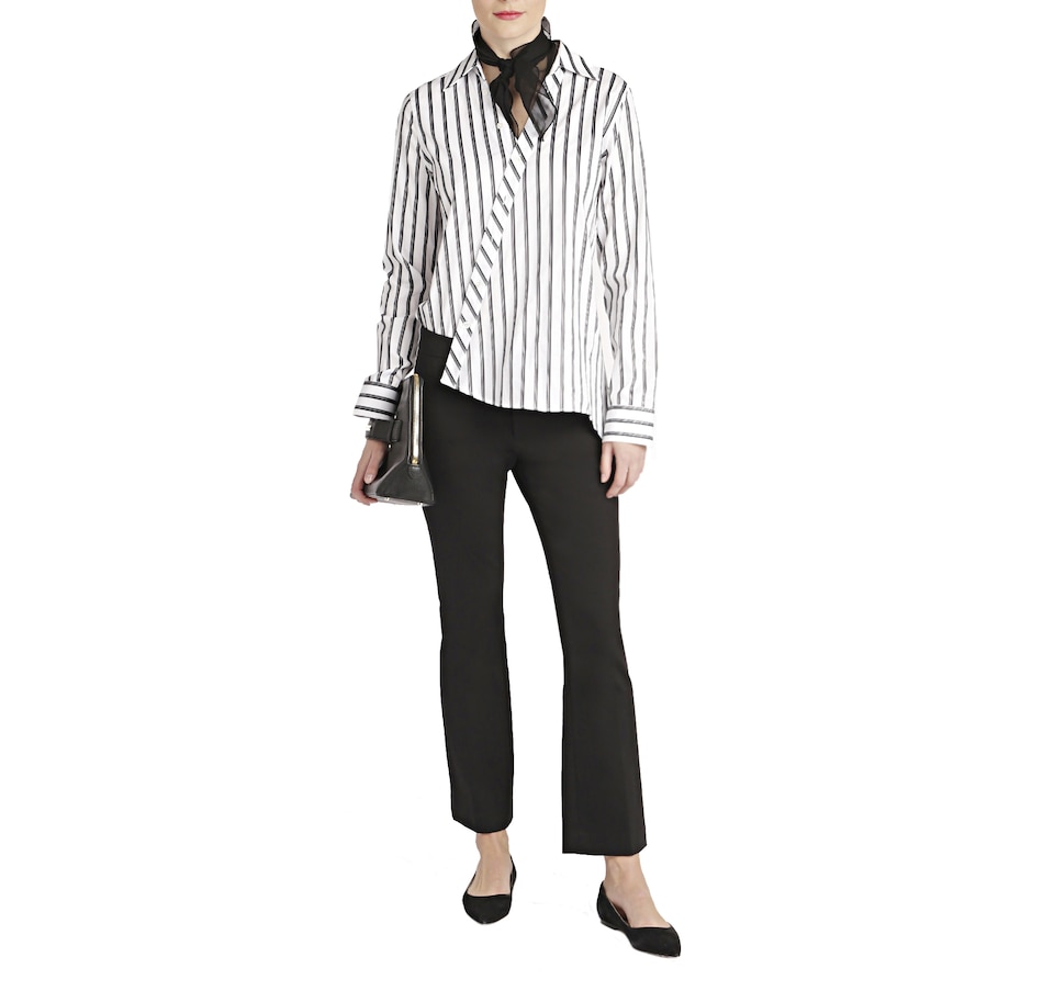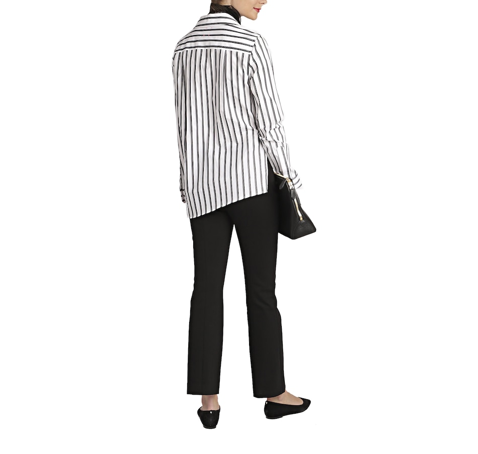 • Semi-fitted, long sleeve, collared, button down, asymmetrical hem placket