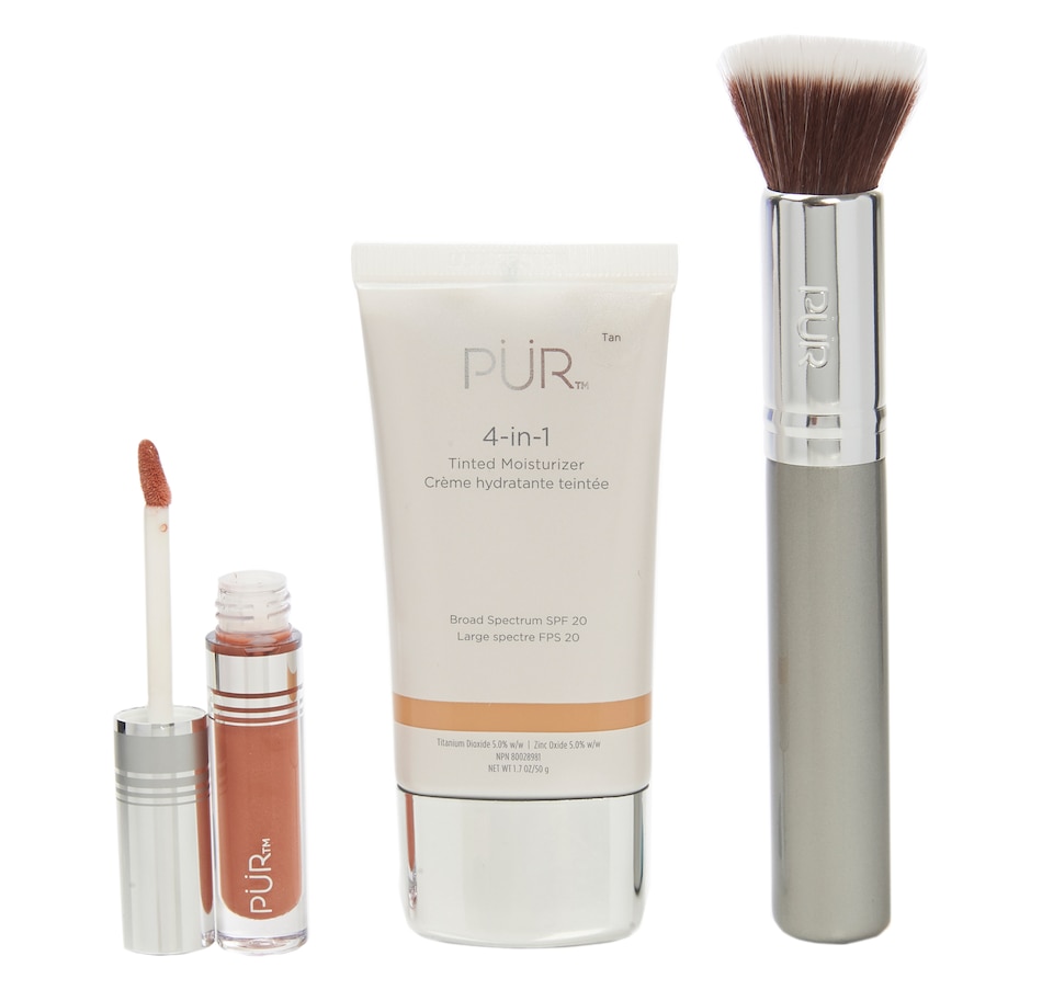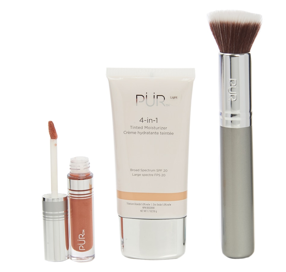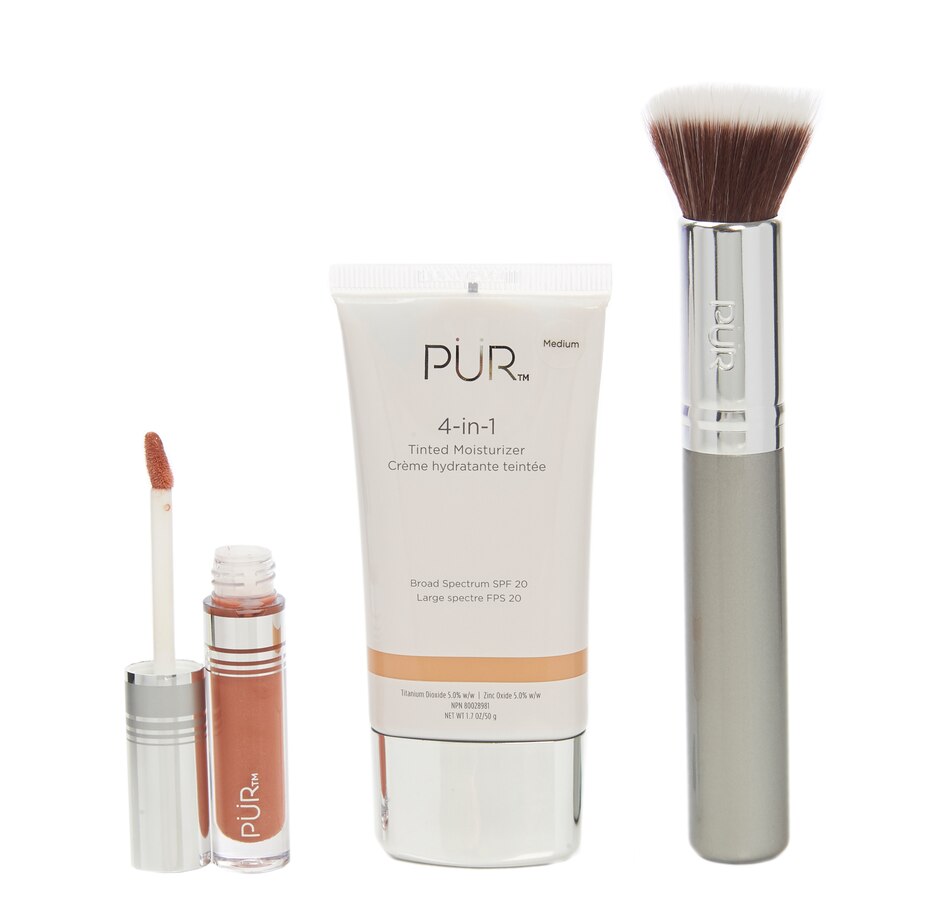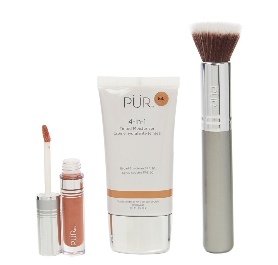 This 4-in-1 Tinted Moisturizer set from PUR includes their 4-in-1 Tinted Moisturizer, with a ceretin complex, a one-of-a-kind ingredient engineered to radically renew the skin without irritation. Their Liquid Chisel Brush, the magic behind the PÜR Cosmetics look! Achieve complexion perfection every time you apply your tinted moisturizer. As well as their lightweight Chroma Glaze Lip gloss in Squad