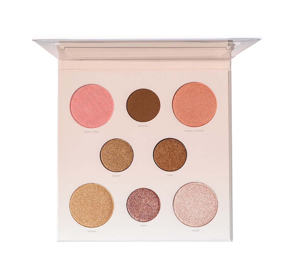 • Four eyeshadows: shanti (metallic taupe), chai (ginger brown), bengal (metallic copper), asha (metallic peony)