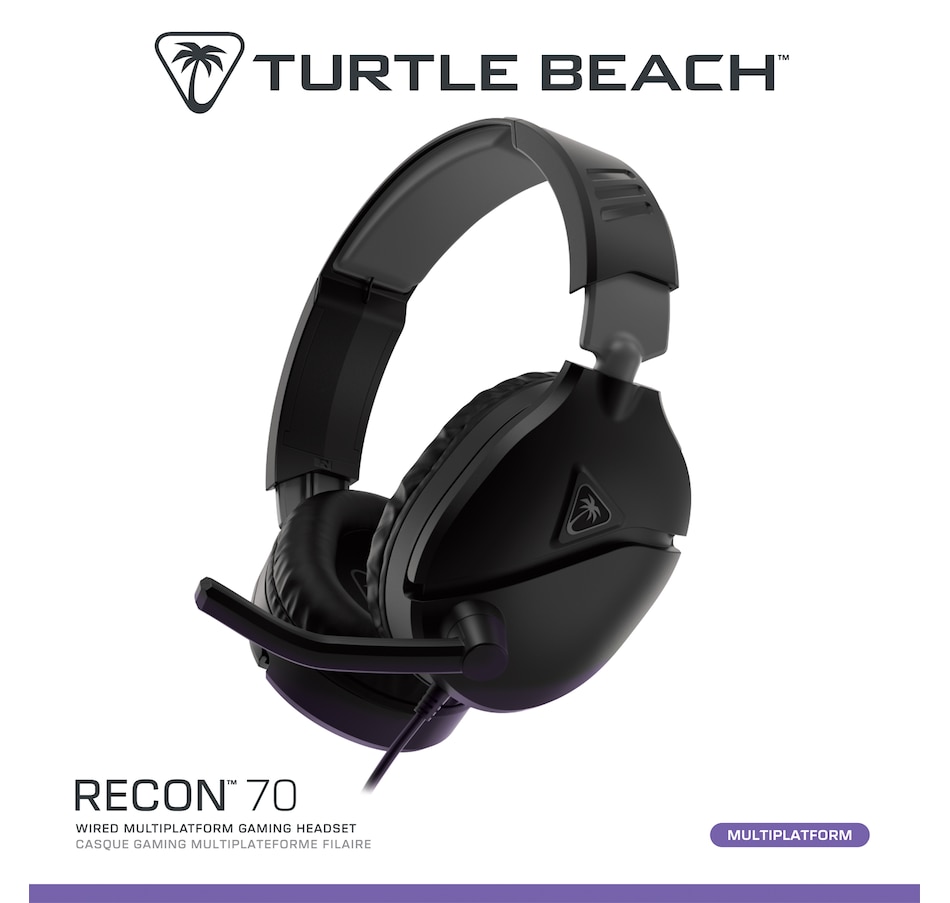 Built for your next victory, your latest achievement and much more is the Turtle Beach Recon 70 multiplatform gaming headset, featuring Turtle Beach’s latest lightweight and comfortable headset design for hours of play, with high-quality 40-mm speakers and over-ear premium synthetic leather cushions that let you hear every crisp high and thundering low while blocking noise. And for even more immersive audio, the Recon 70 supports spatial sound technologies such as Sony 3D Audio for PS5, Windows Sonic, Dolby Atmos and DTS Headphone: X. Turtle Beach’s renowned high-sensitivity mic helps ensure that you are heard clearly and easily flips up to mute, and its versatile 3.5-mm connection makes it perfect for swapping between PlayStation and Xbox controllers, and PCs and mobile devices.