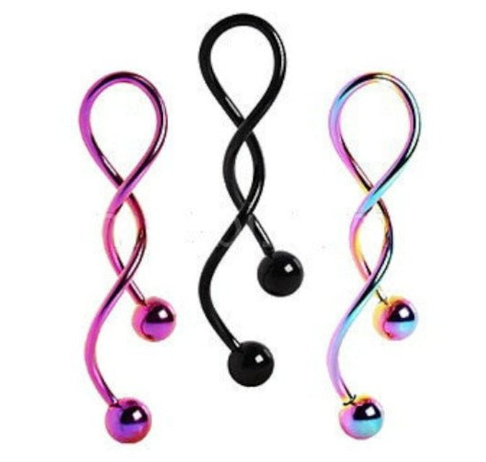 PVD Plated Spiral Navel RingA far cry from the classic belly barbell this Spiral Navel ring twist and turns its way into your heart. A perfect piece for summer this metallic beauty is crafted out of pure 316L Surgical Steel and then PVD plated for a shock of brilliant, long lasting color. The polished uneven ends of this twist measure 45mm and 36mm in length. Comes with 2 matching precision threaded 6mm balls. Thickness : 14GA / 1.6mm Material : PVD Plated 316 Surgical Steel
