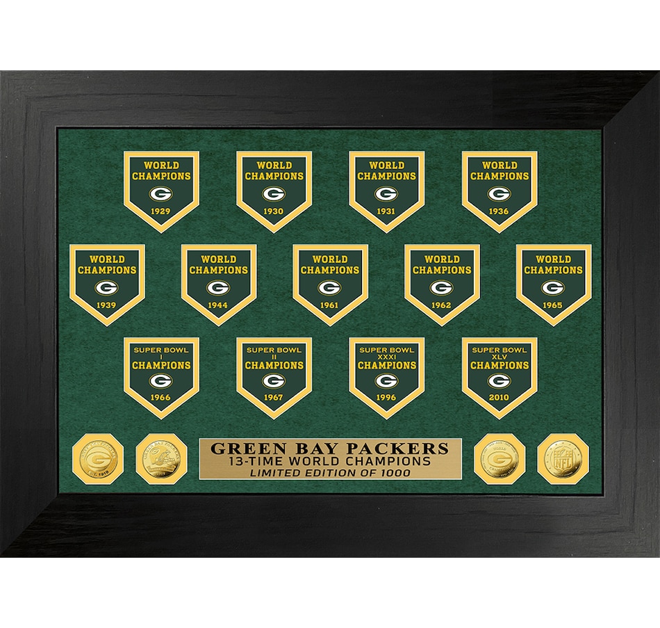 Commemorating the Green Bay Packers 13 Championships with this Deluxe Banner Photo Mint. A limited edition of only 1,000. Featured in a black wood frame with 2.5" wide molding and suede double matting are the (13) thirteen Green Bay Packer Championship banners listing the championship year for each Championship and Super Bowl victory on each and accompanied by four minted commemorative 39mm gold flashed coins. Each frame has an individually numbered certificate of authenticity pasted to the back. Officially licensed by the NFL and proudly made in the USA by The Highland Mint!