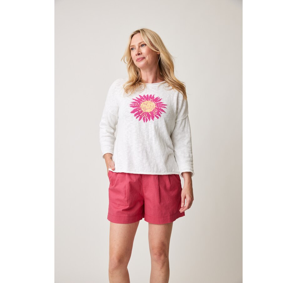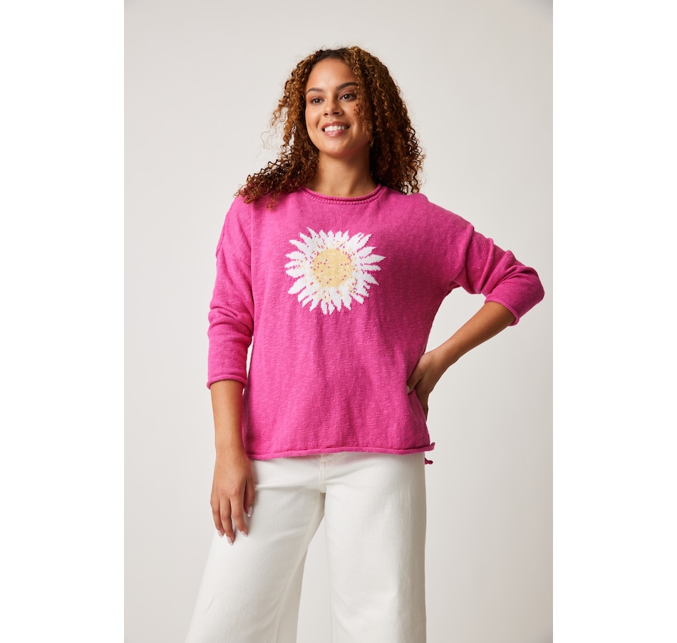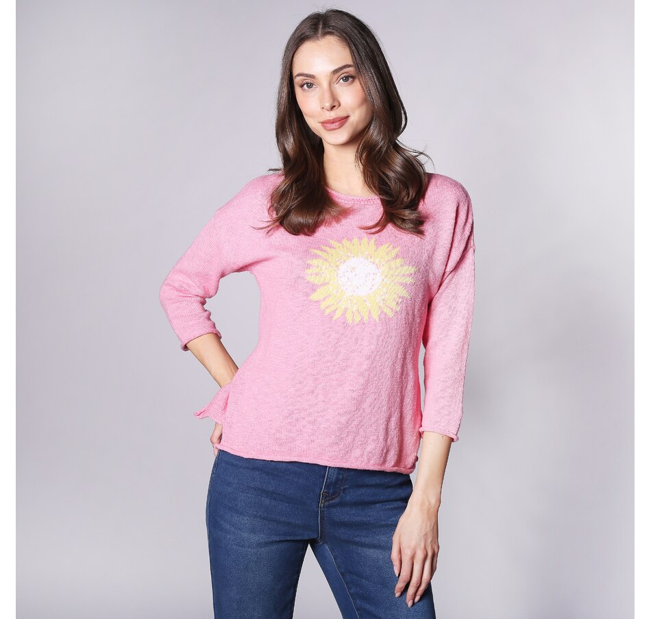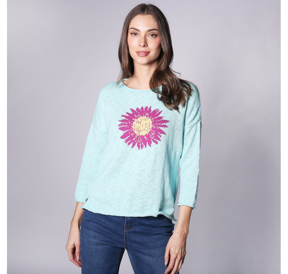 Just in time for spring, you'll finish your look in gorgeous, radiant style wearing this summer flower 3/4 sleeve pullover from Parkhurst.