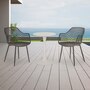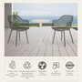 This stylish L-shaped bistro set is made with a combination of mixed metal and GRS recycled plastic. The chair is 50% GRS PP seat with anti-UV and powder-coated metal legs. Its GRS certified plastic is a mix of 50% GRS plastic and 50% virgin material. This mix allows for quality and stability, and follows the requirements for product to be certified GRS. The table is finished with durable powder-coated metal.